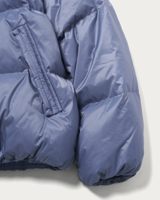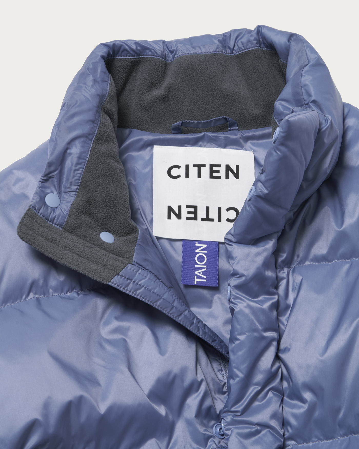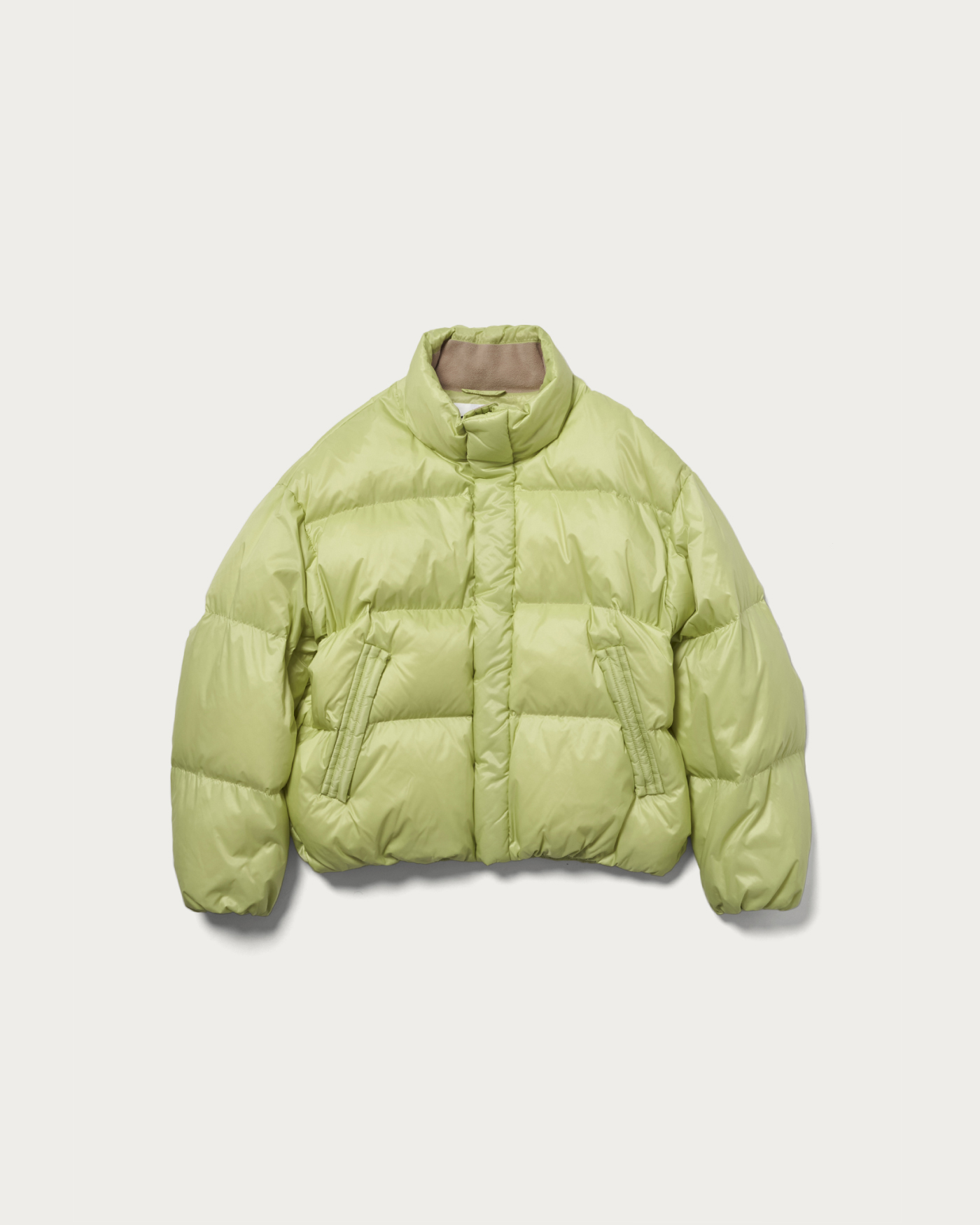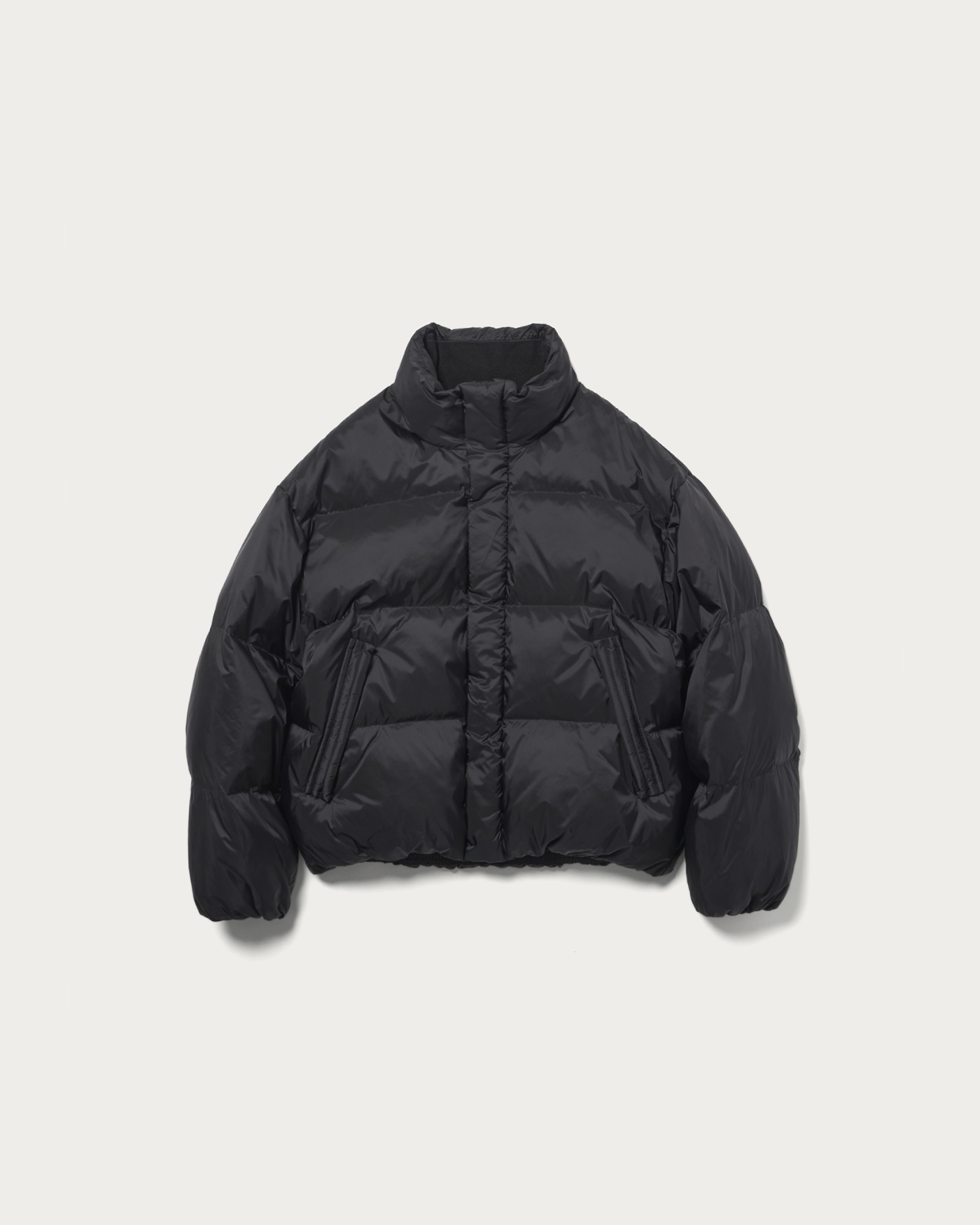 〈TAION〉 This cocoon silhouette down jacket is crafted from a classic 20-denier material known for its suppleness and vibrant color, dyed in CITEN's unique original colors. It is generously filled with 800 fill power white duck down. Despite its voluminous appearance, it is characterized by its practical lightness.