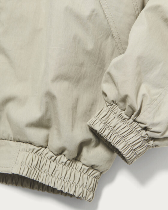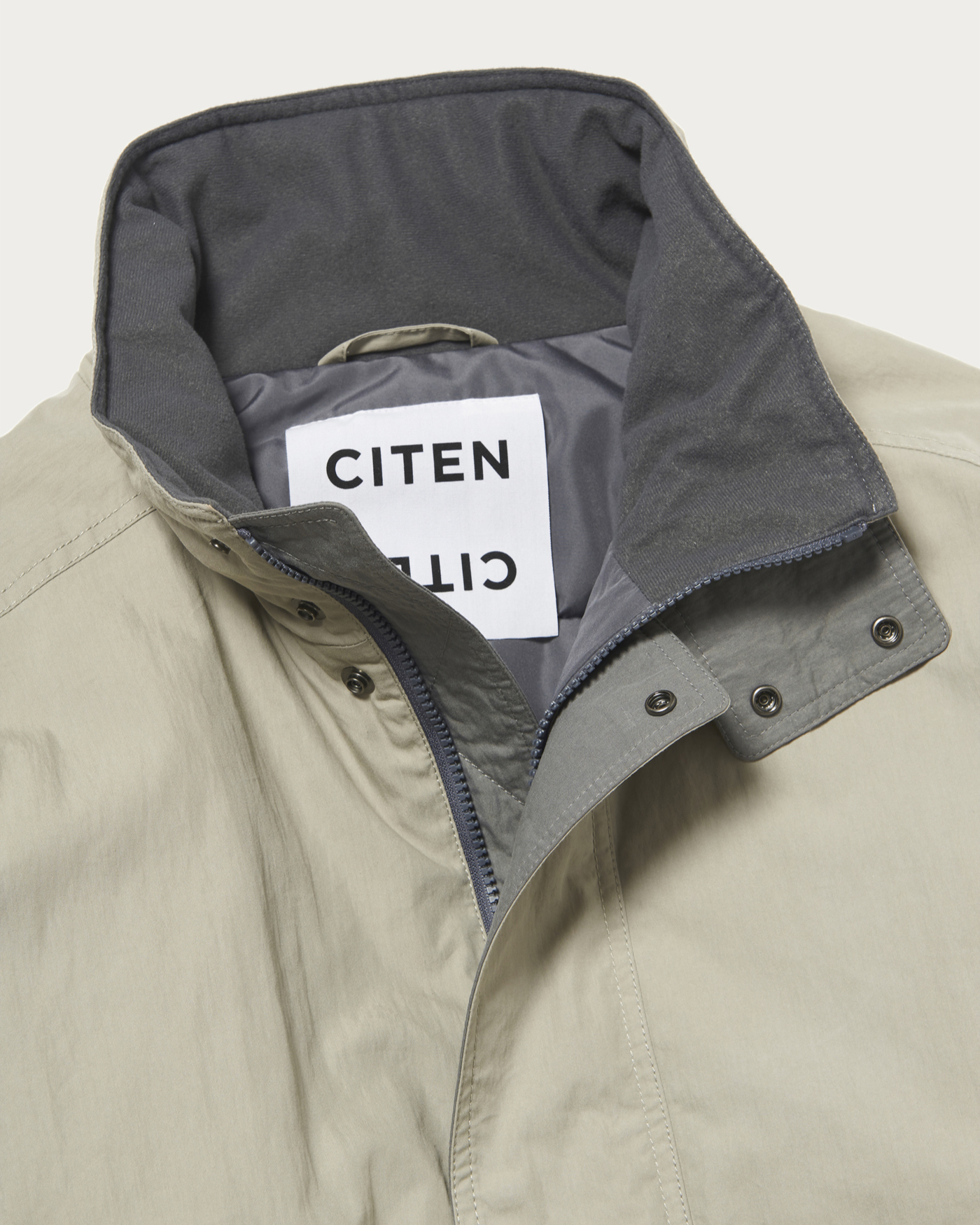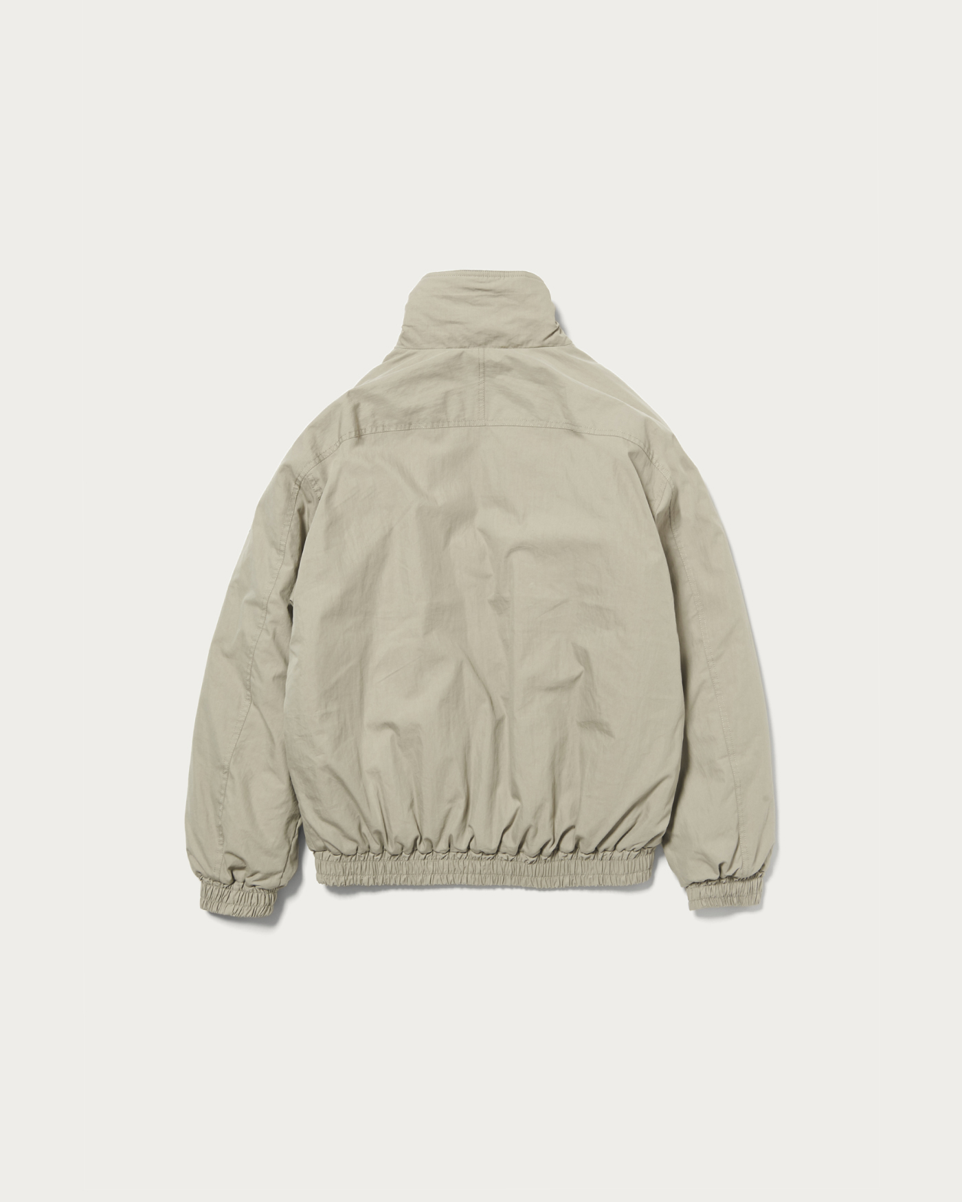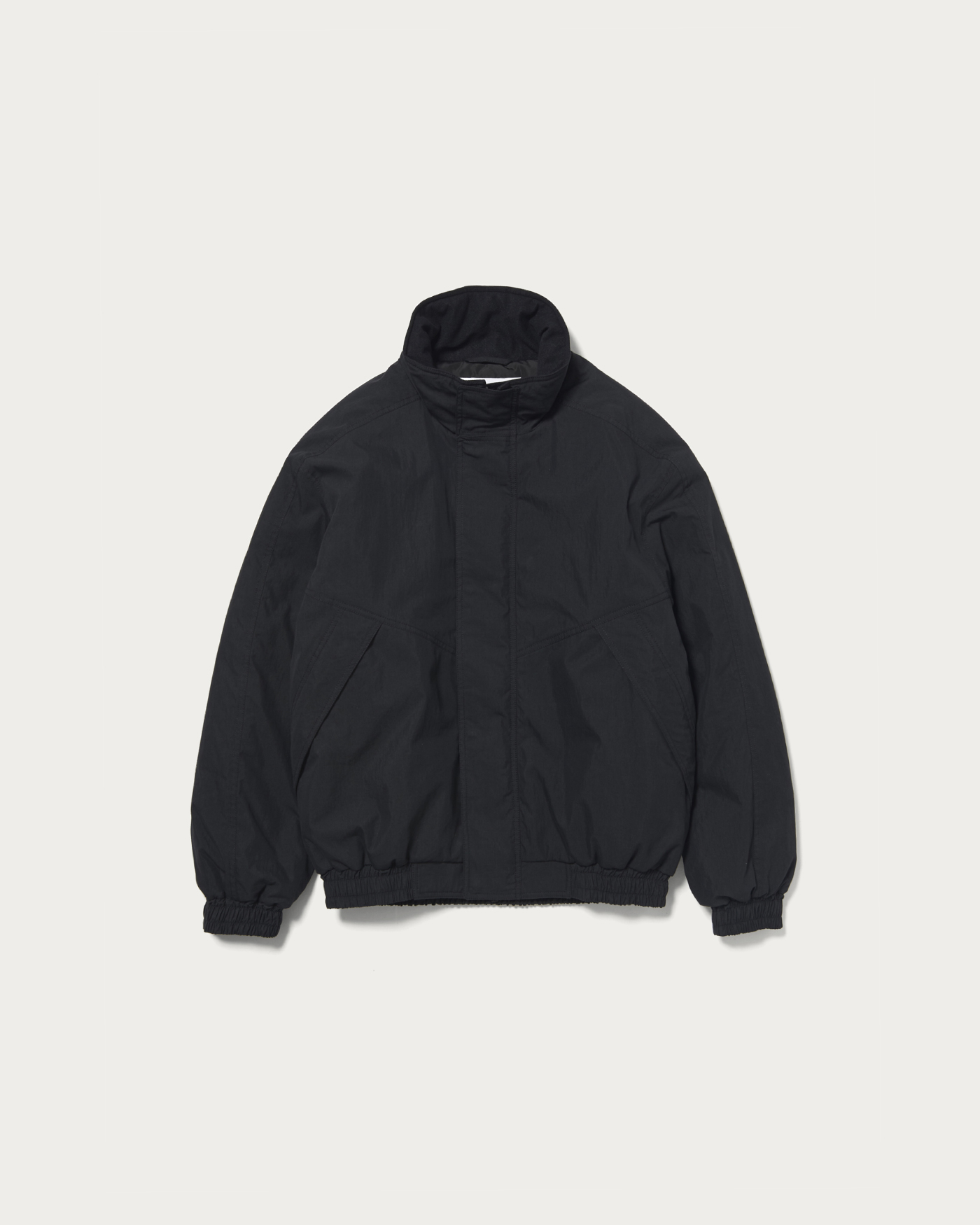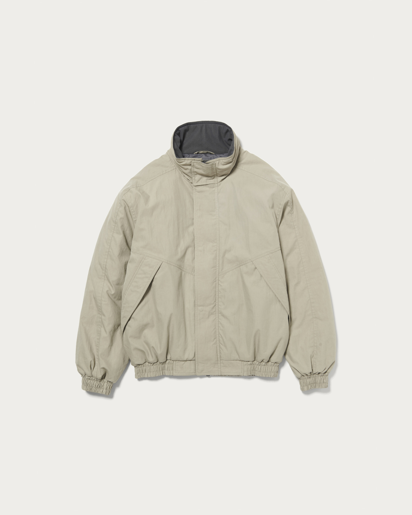 A short-length padded blouson made from a cotton-nylon material. The placket, designed separately for the neck and body sections, allows for easy temperature regulation by fastening only the neck part after opening the front. It is crafted with a brushed fabric on the underside of the collar and ample padding, making it suitable for wear during the peak winter season.