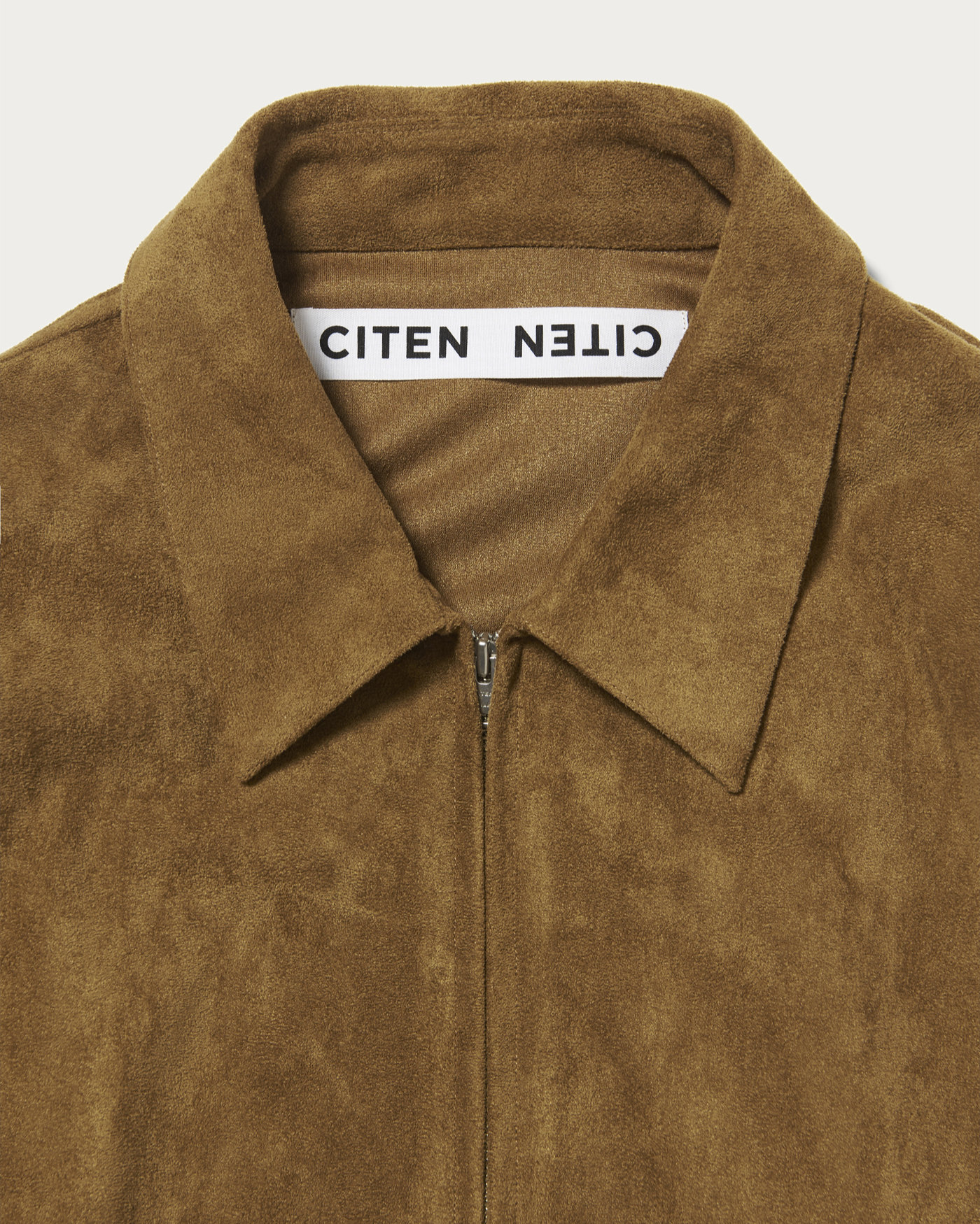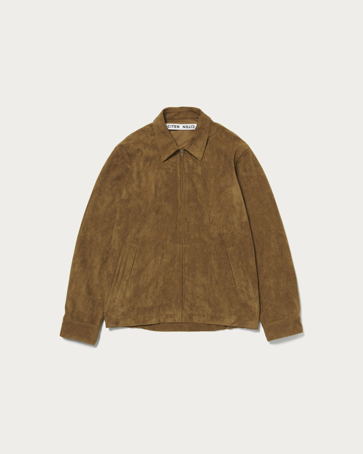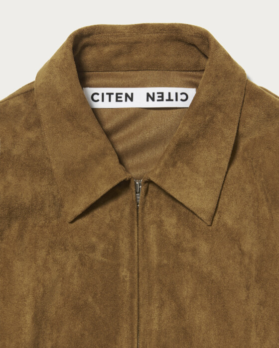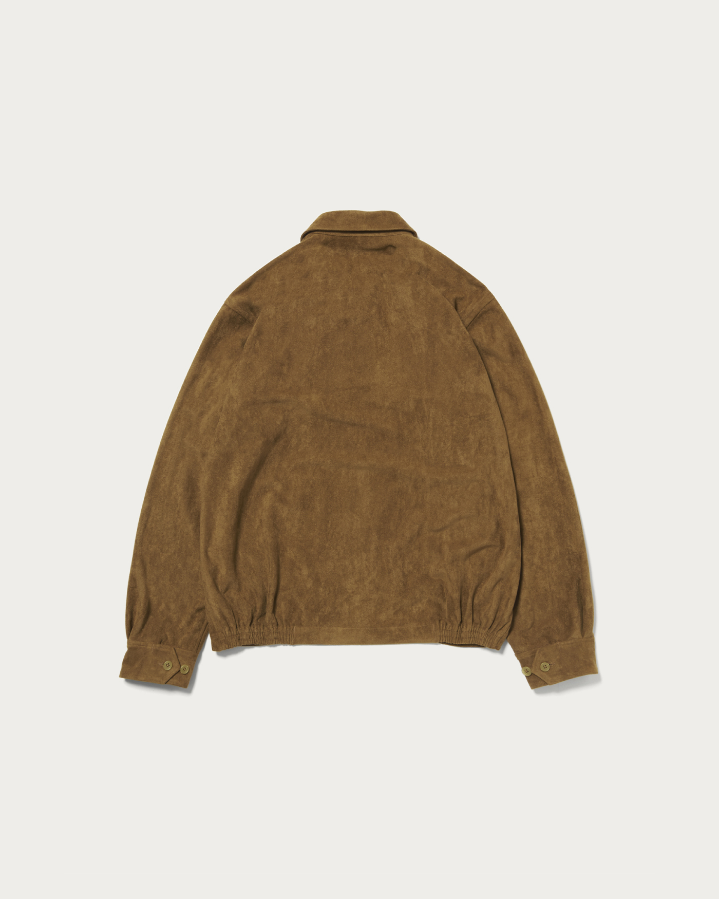 A shirt blouson made from a suede-like material with a short nap. It features stitching that is designed to be as inconspicuous as possible, resulting in a clean design. The silhouette is characterized by a slightly relaxed fit.
