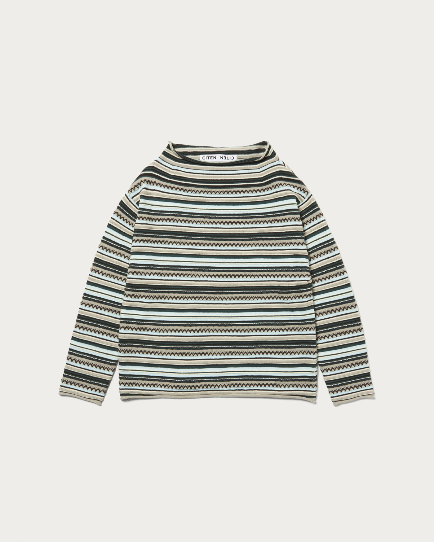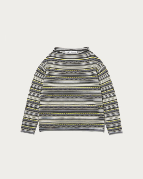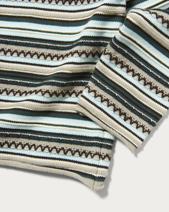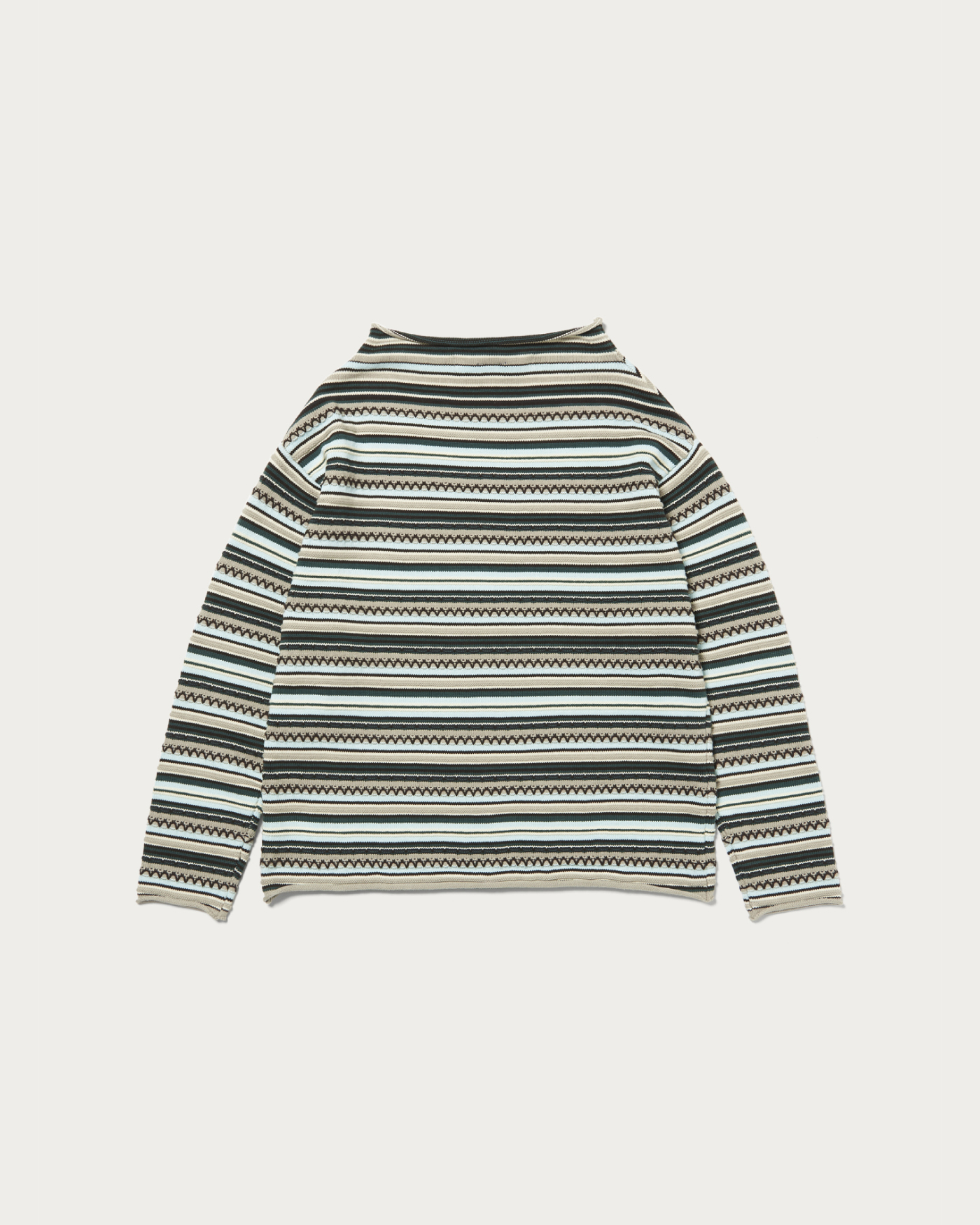 The roll-neck design, inspired by vintage archives, features meticulous attention to detail. The chunky knit, made from wool yarn, stands out prominently. The neckline and sleeves are intentionally kept loose, creating a relaxed silhouette suitable for adults.