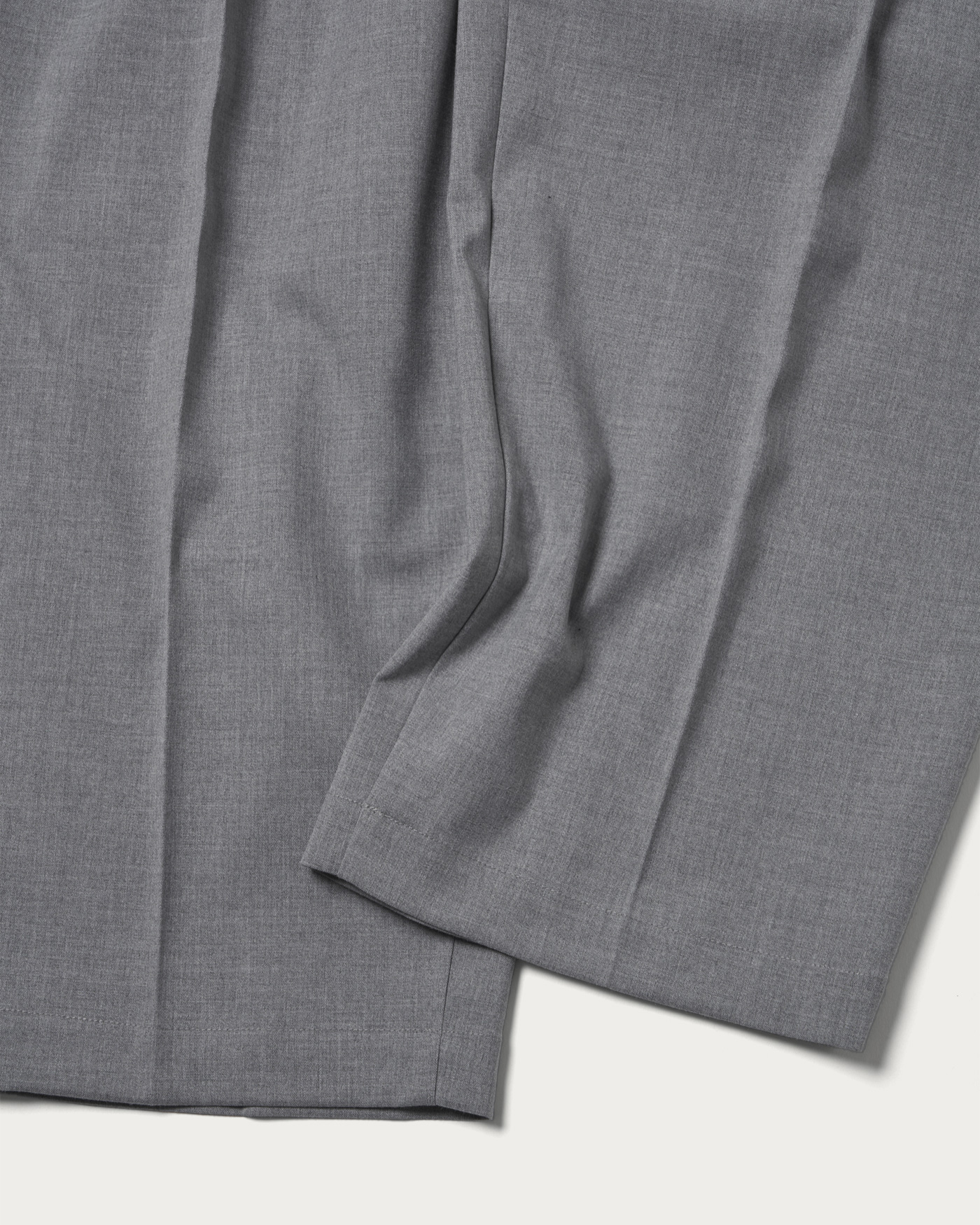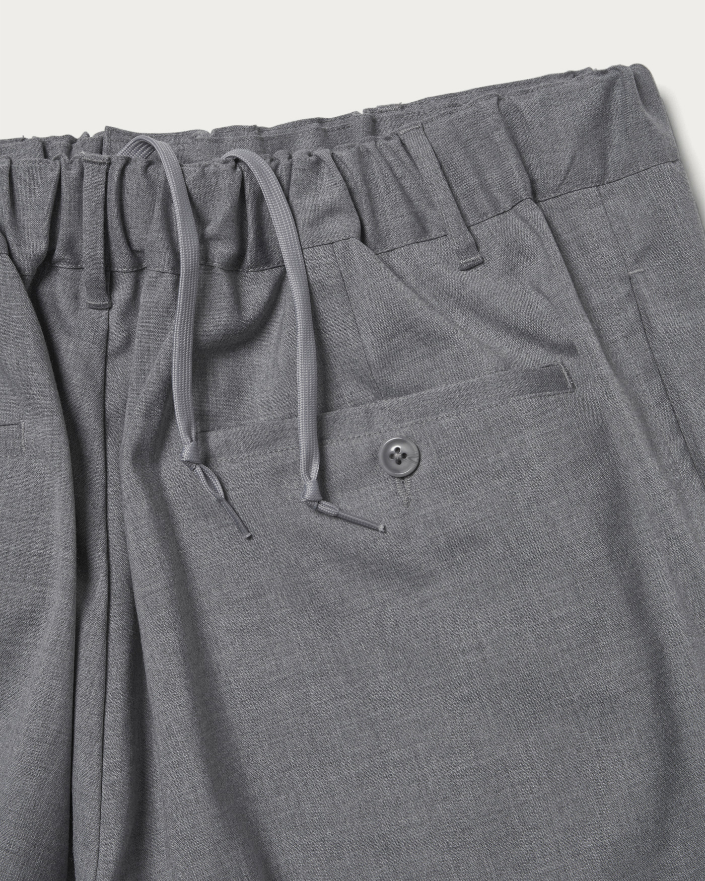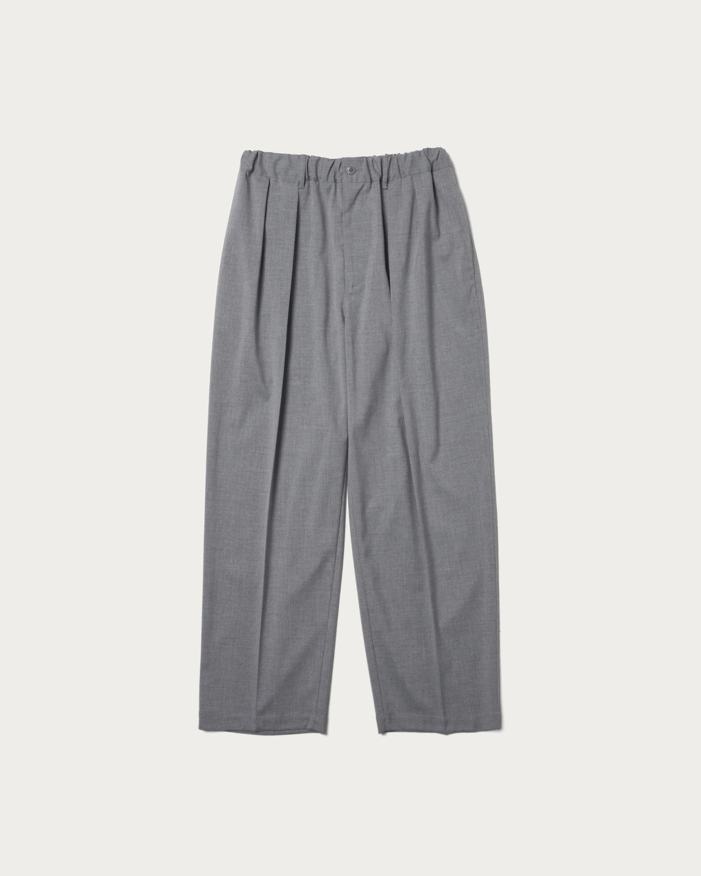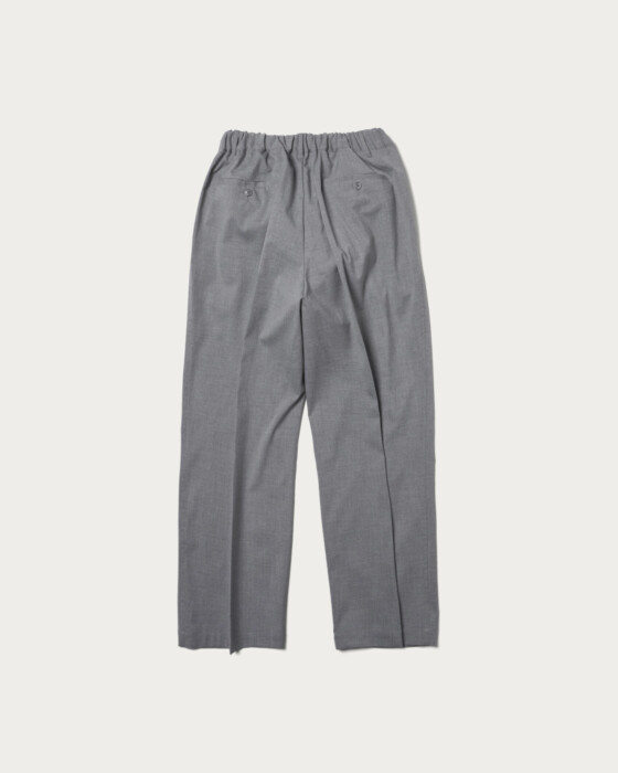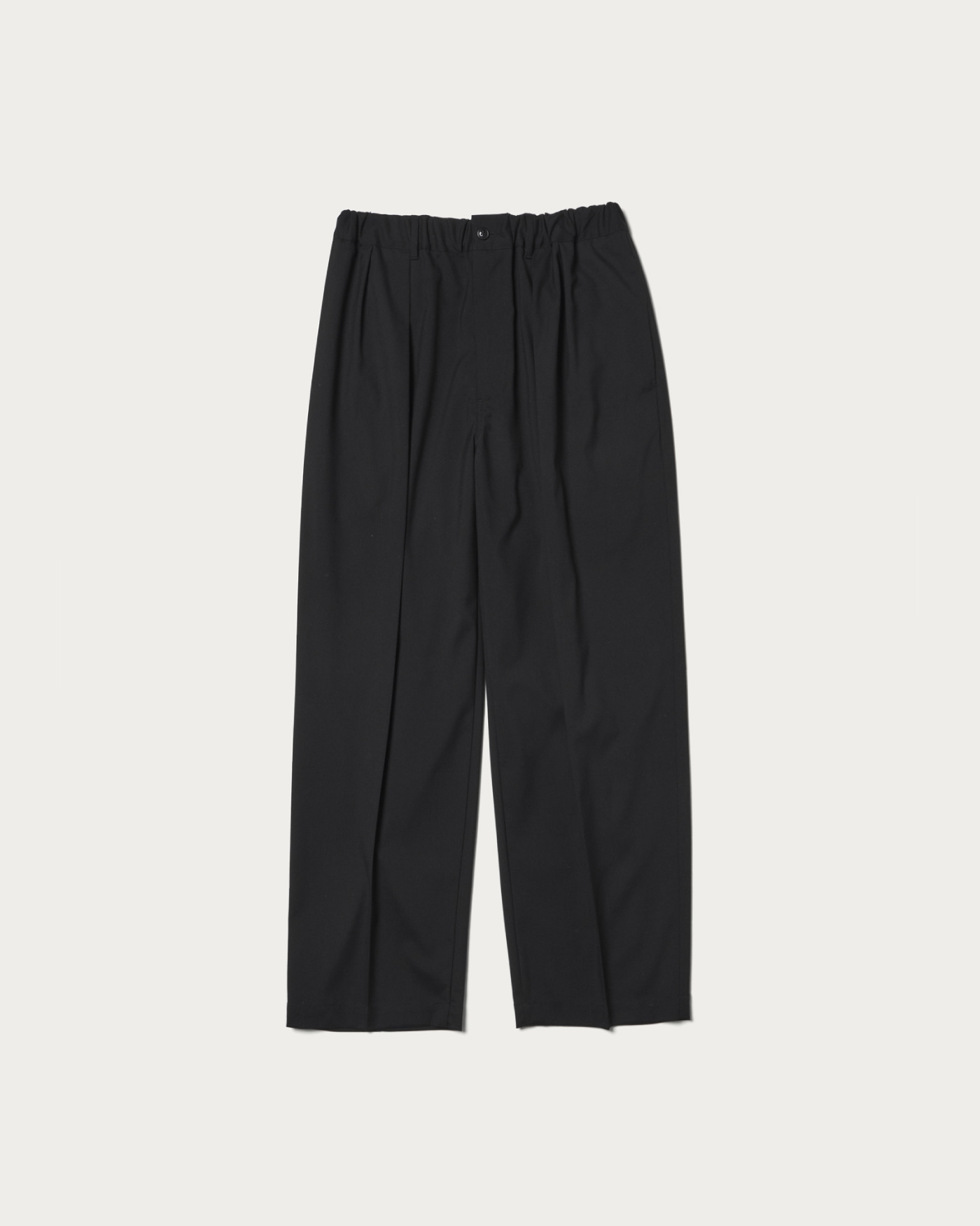 These elegant two-pleat pants are made from a polyester-rayon blend. They feature a relaxed fit from the waist to the hem, with an elastic waistband and drawstring that enhance versatility in styling.