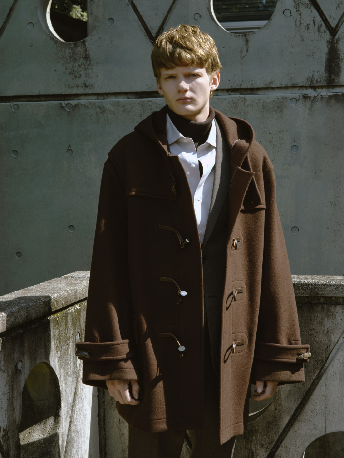 Key looks include “Traditional Clothing,” featuring statement outerwear such as bal-collar coats and duffle coats;