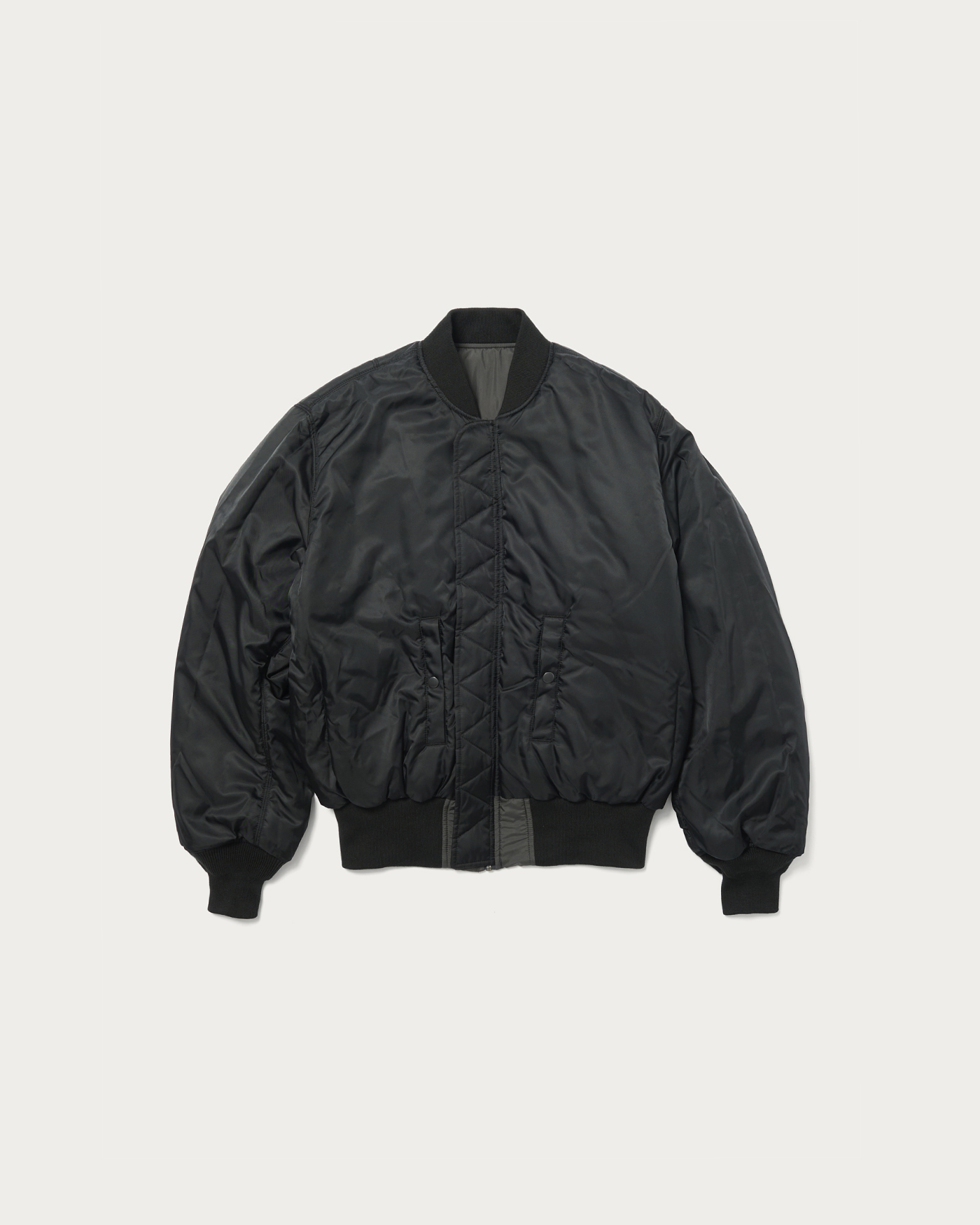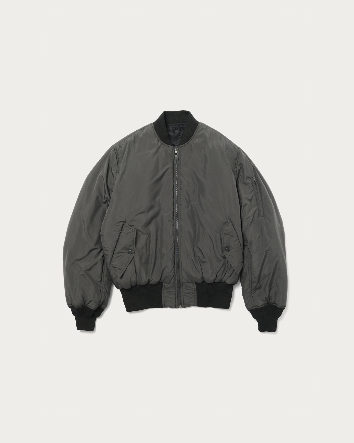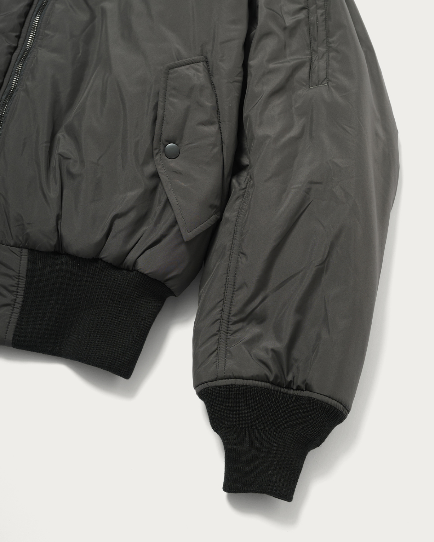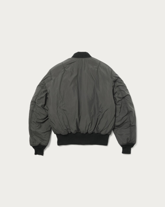 A special collaboration project with ALPHA. A clean, sophisticated MA-1 jacket designed for adults. Instead of the standard twill material, it has been replaced with a soft-touch synthetic fabric, giving it a refined and polished look. The cigarette pocket and zippers have been simplified and downsized for an elegant finish. This piece is perfect for an adult style, avoiding an overly casual appearance.