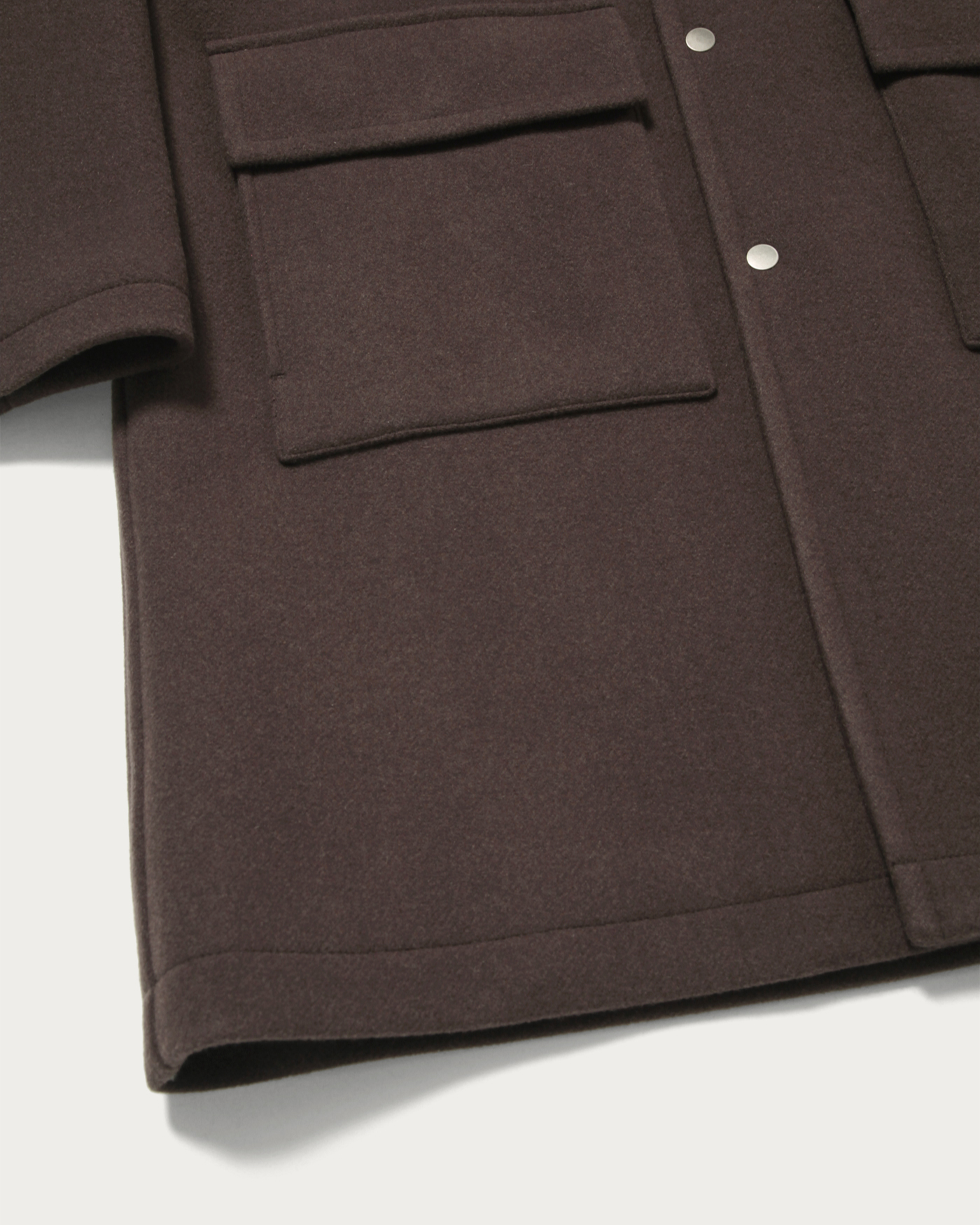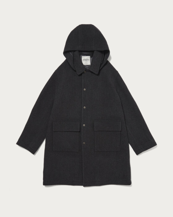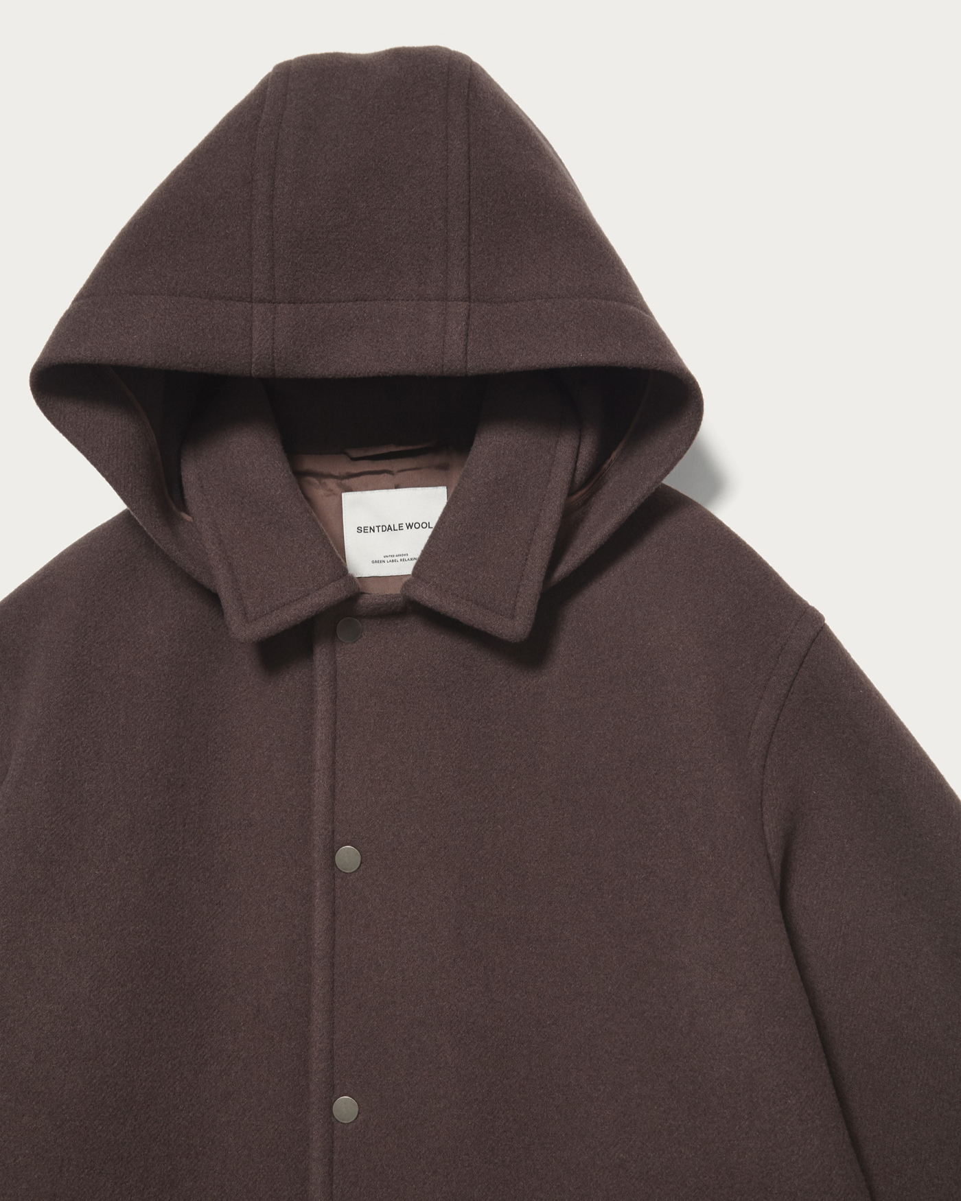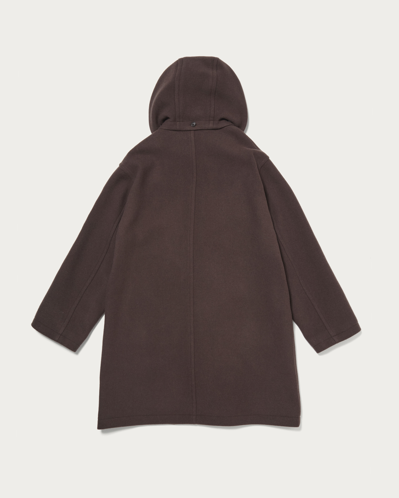 "SENTDALE WOOL," made exclusively from SUPER110's wool sourced from sheep in southern Australia, features a refined appearance with its voluminous and soft high-quality melton fabric. The hood is detachable, the toggles are dot buttons, and the design is solid and clean without a yoke patch. This versatile piece is easy to pair with more polished looks.