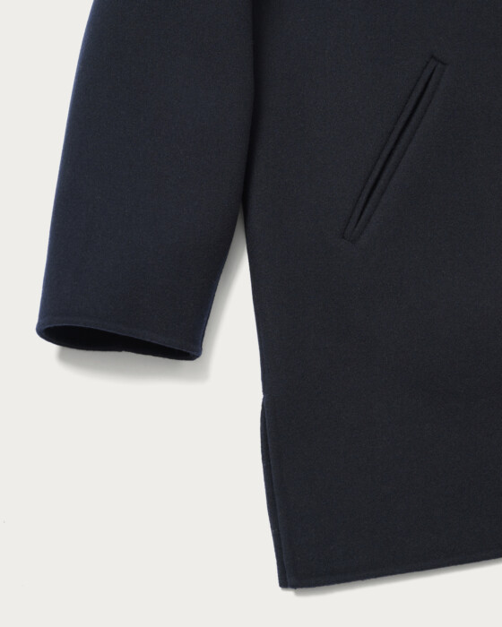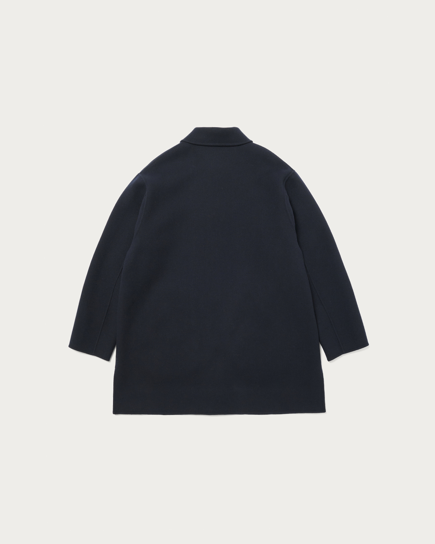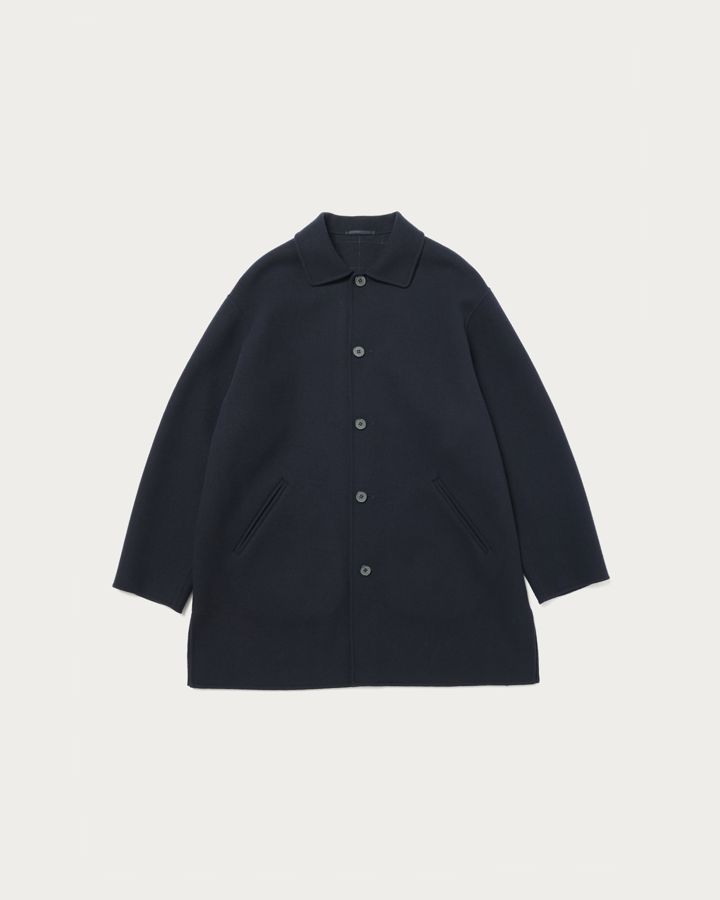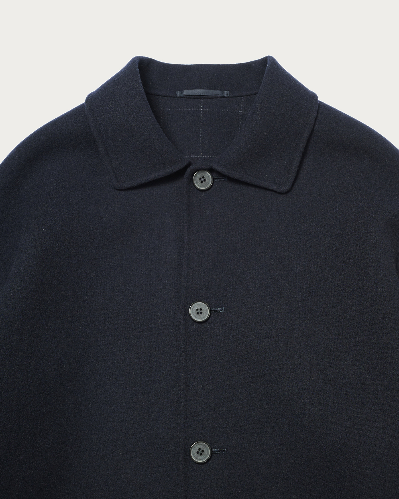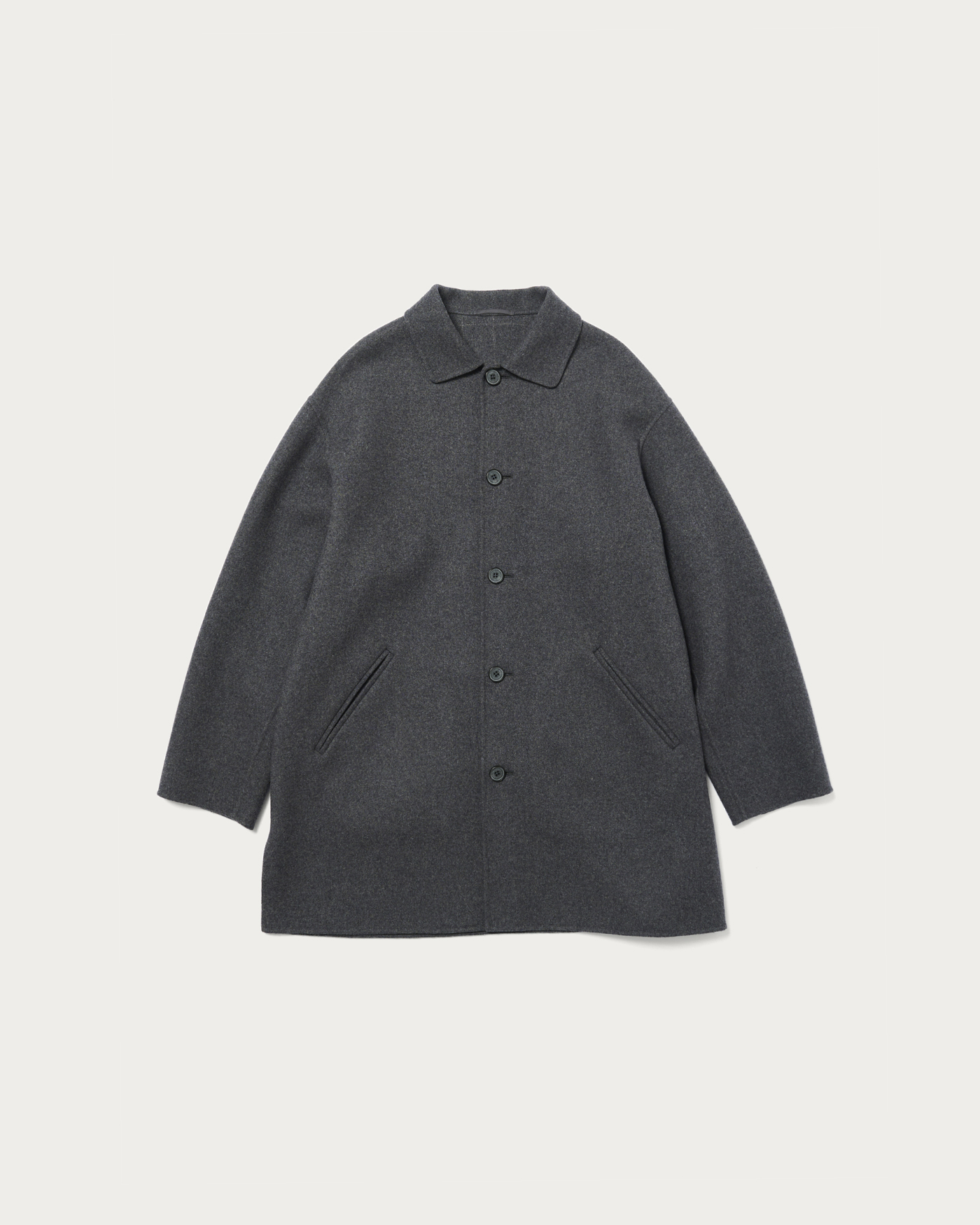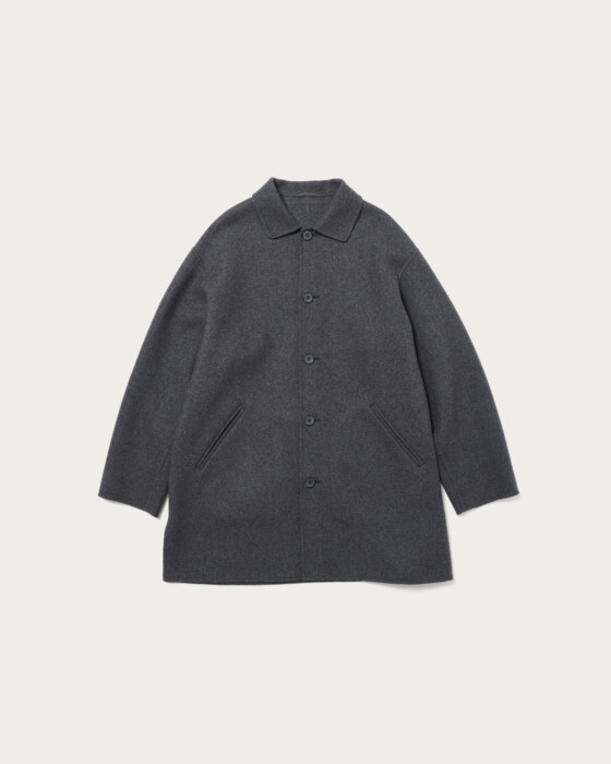A lightweight stainless collar coat designed for the recent mild winters. It features a single-layer construction without lining, crafted with reversible stitching, resulting in a relaxed silhouette that captures a sense of timeless style.