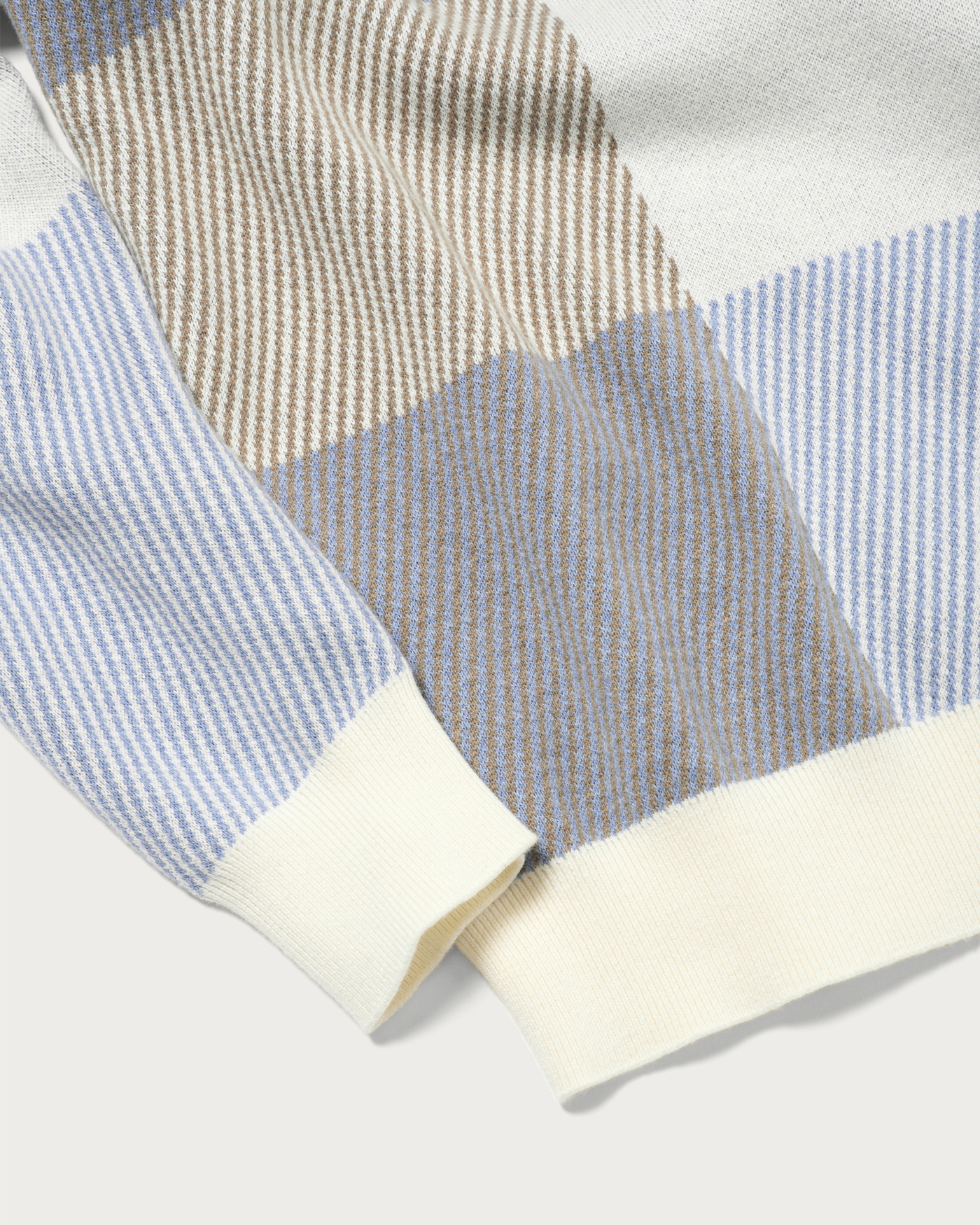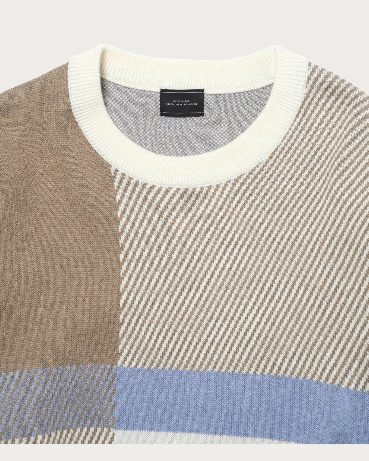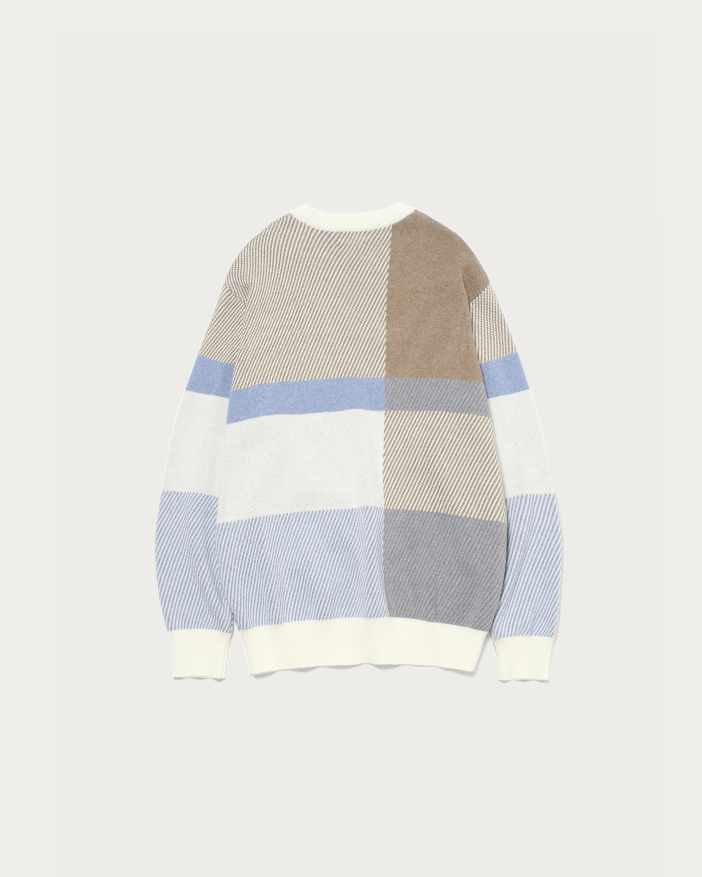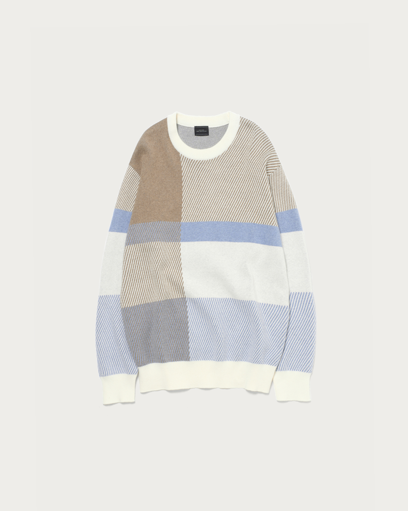 Expressing a large block pattern through jacquard knitting, this piece uses cotton-based yarn, offering a moderately voluminous and soft texture. It's suitable for a long wearing season, looks great on its own, and works well as an inner layer under a coat. It's also an ideal gift.