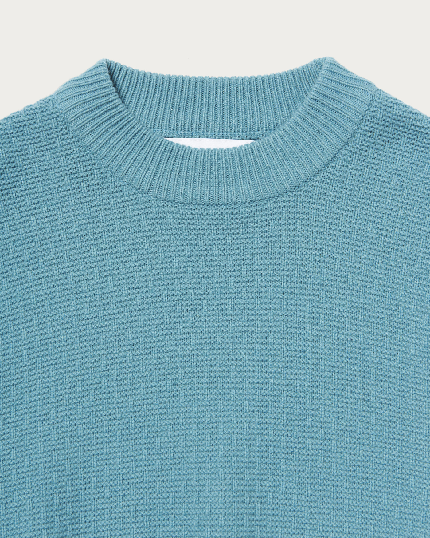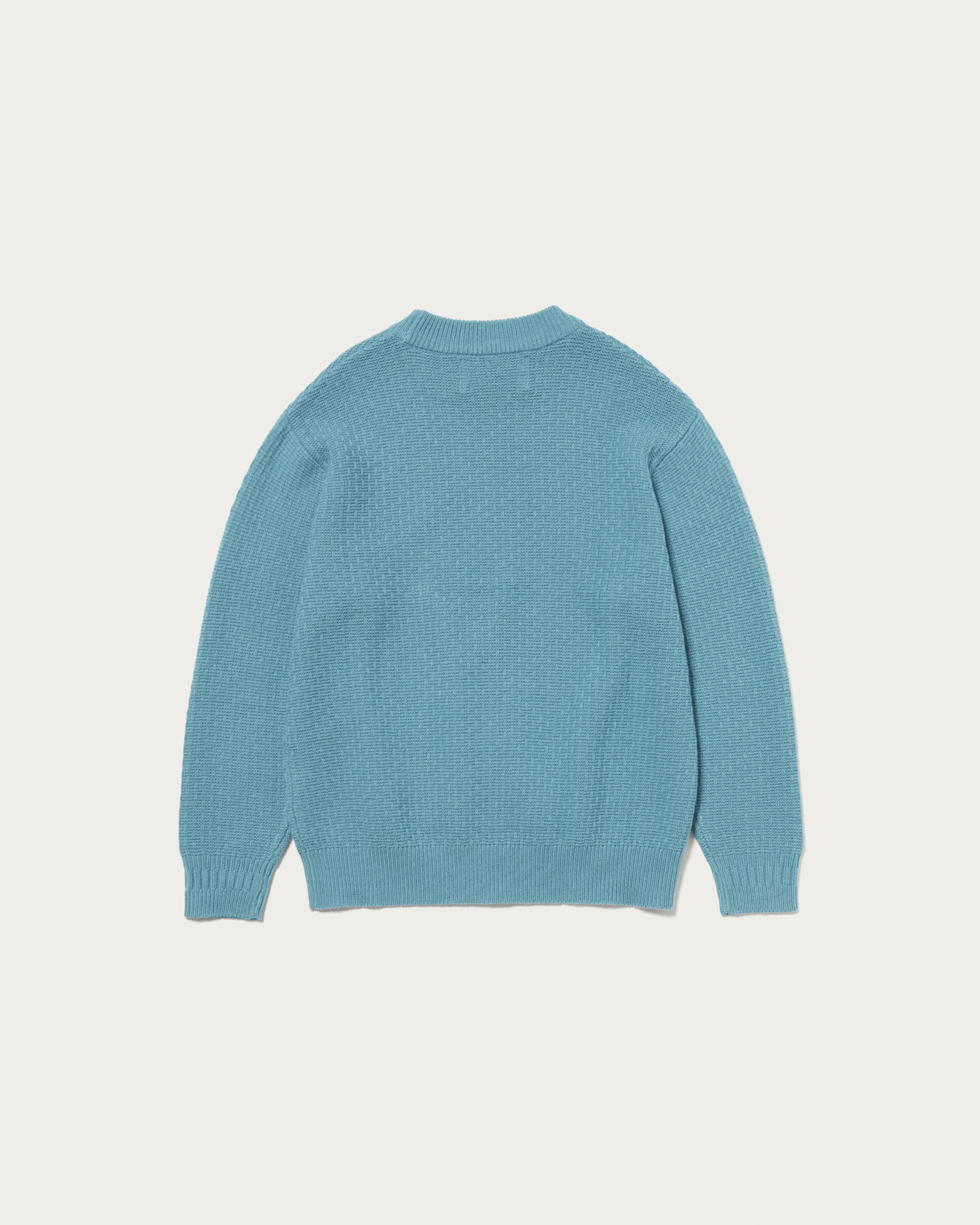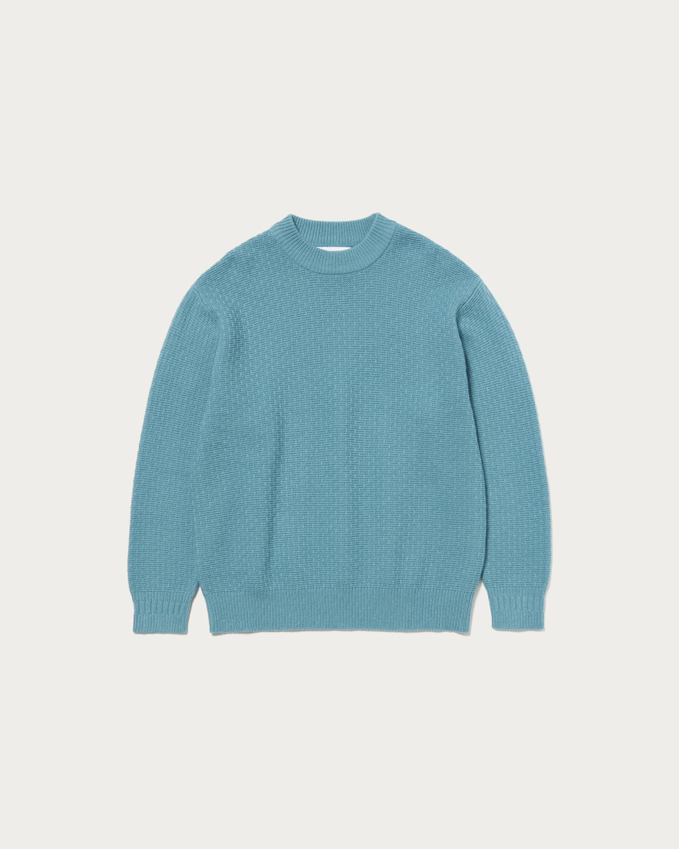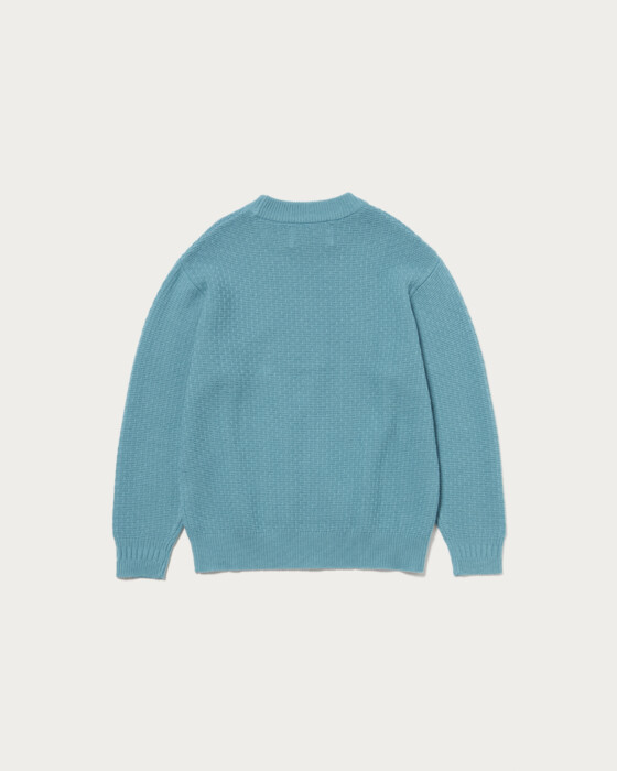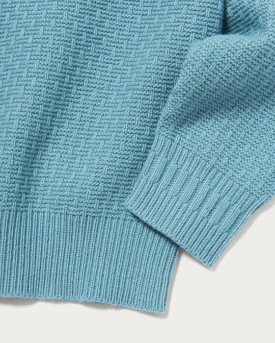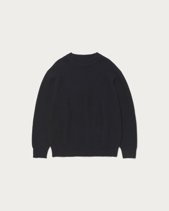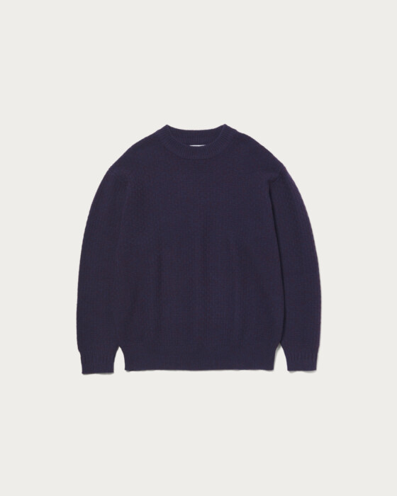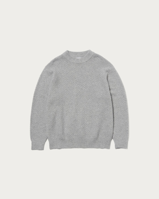 The collar is designed to be slightly wider, allowing it to fit neatly around the neck even when wearing outerwear like coats. The cuffs feature a ribbed line switch, adding a subtle design point. The body and sleeves are crafted with a textured knit, creating a sense of depth. The material is a blend of Hamilton lambswool. The wool from lambs raised in the rich environment of Hamilton, Australia, is characterized by its unique, smooth texture, resulting in a knit that offers a luxurious touch.