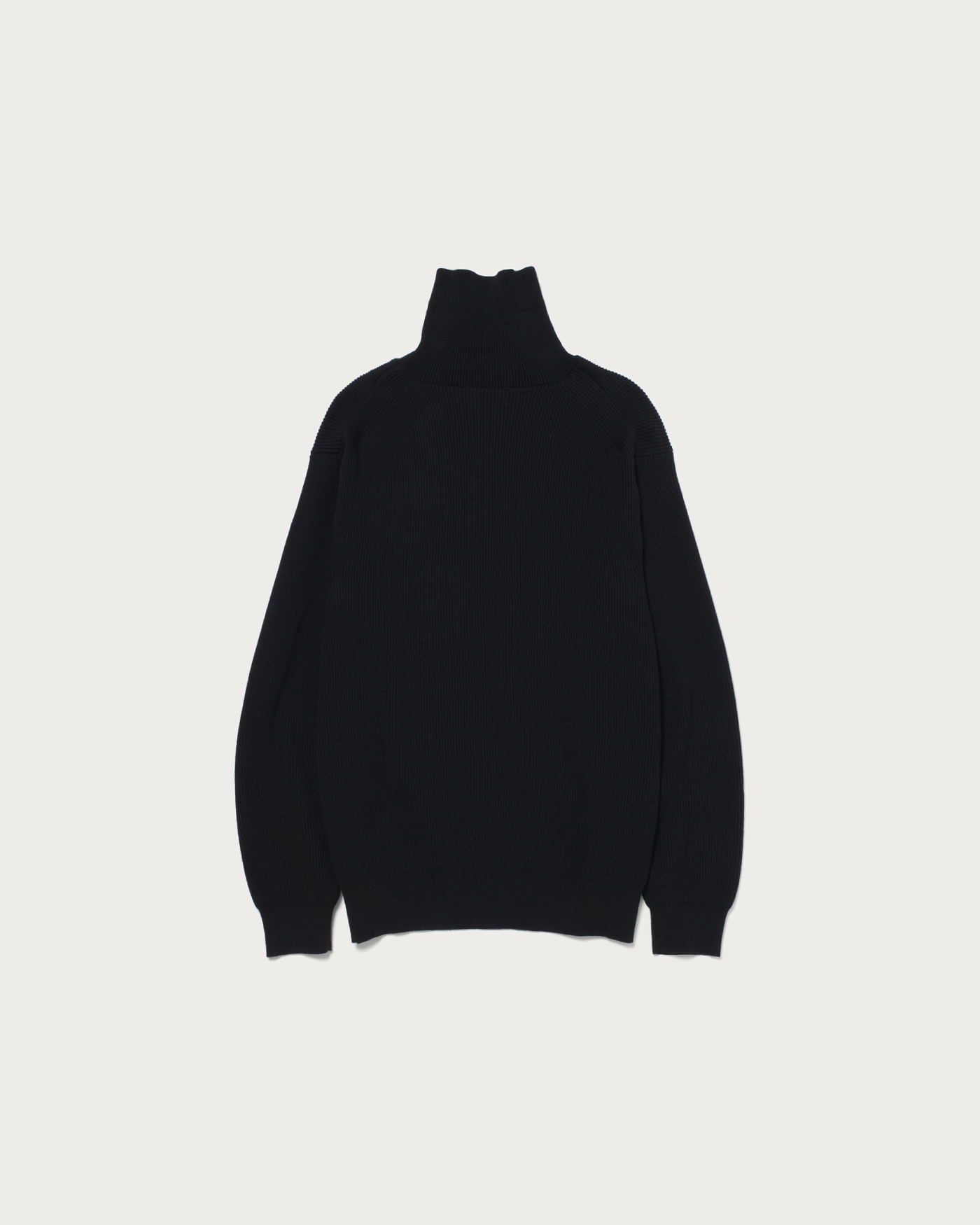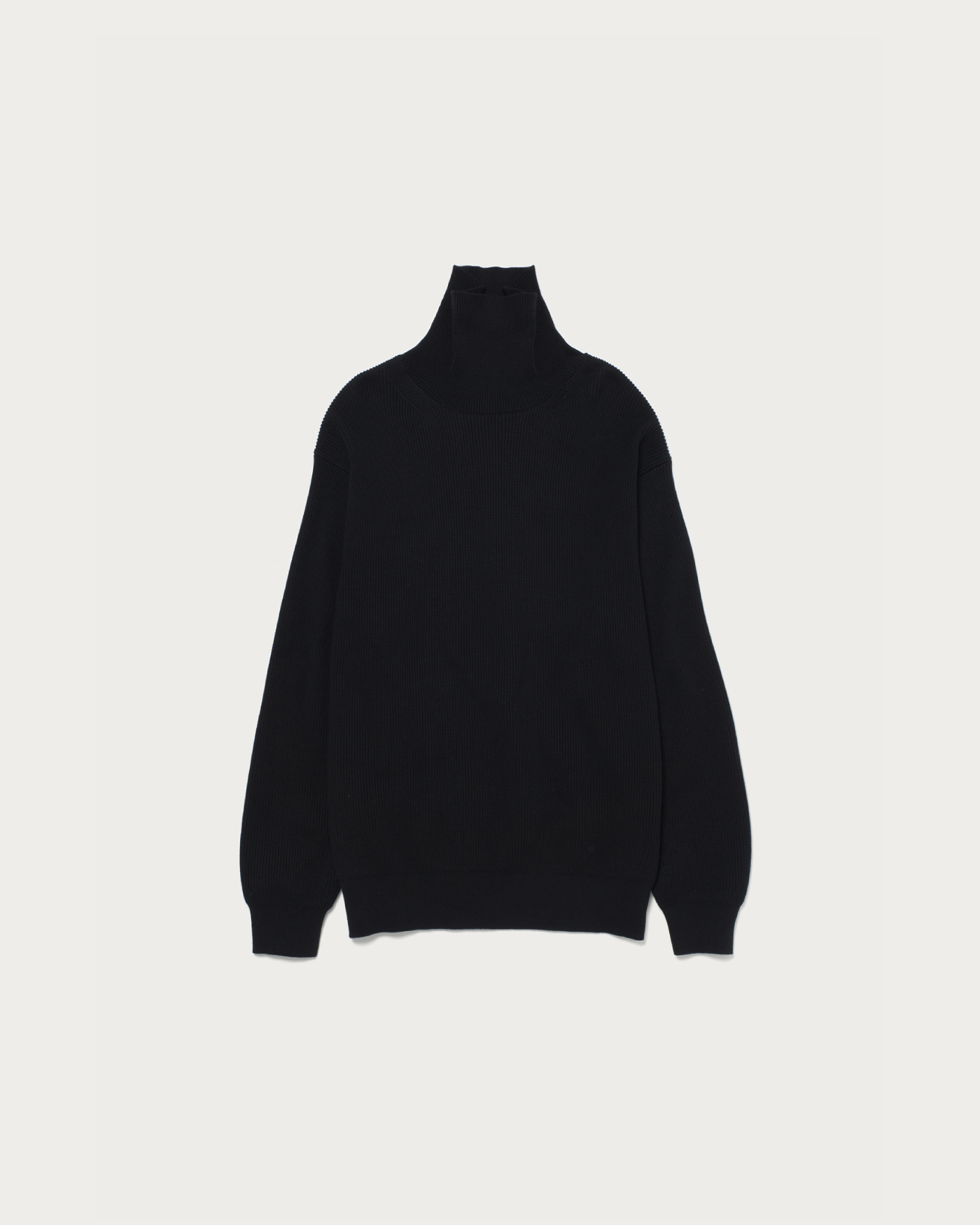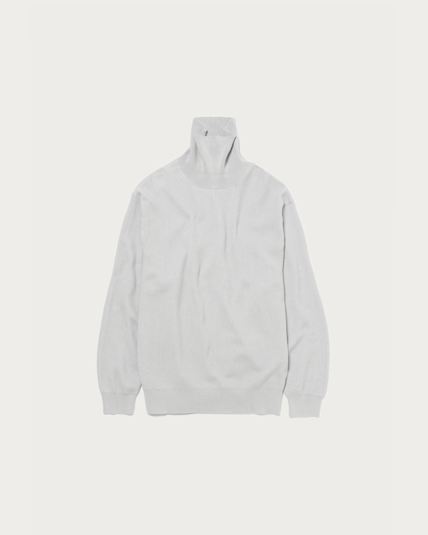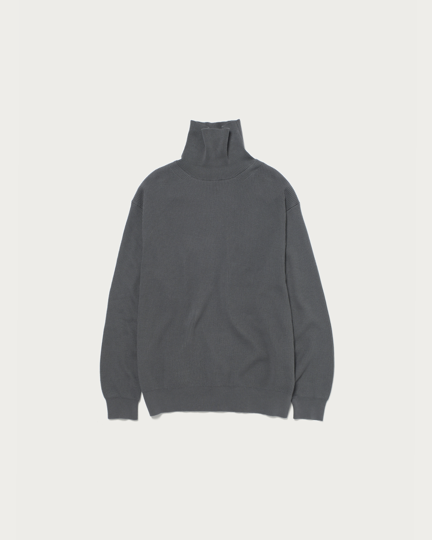 A basic ribbed turtleneck knit, meticulously finished. It offers a moderate fit that makes it easy to pair, whether worn alone or as an inner layer. The wider ribbing at the armholes and other areas serves as a design highlight. Made with compact cotton yarn, it features a smooth and beautiful texture. The ribbed knitting is characterized by its three-dimensional ridges. With a moderate thickness, this cotton knit is comfortable to wear even in the warmer climates of recent years.