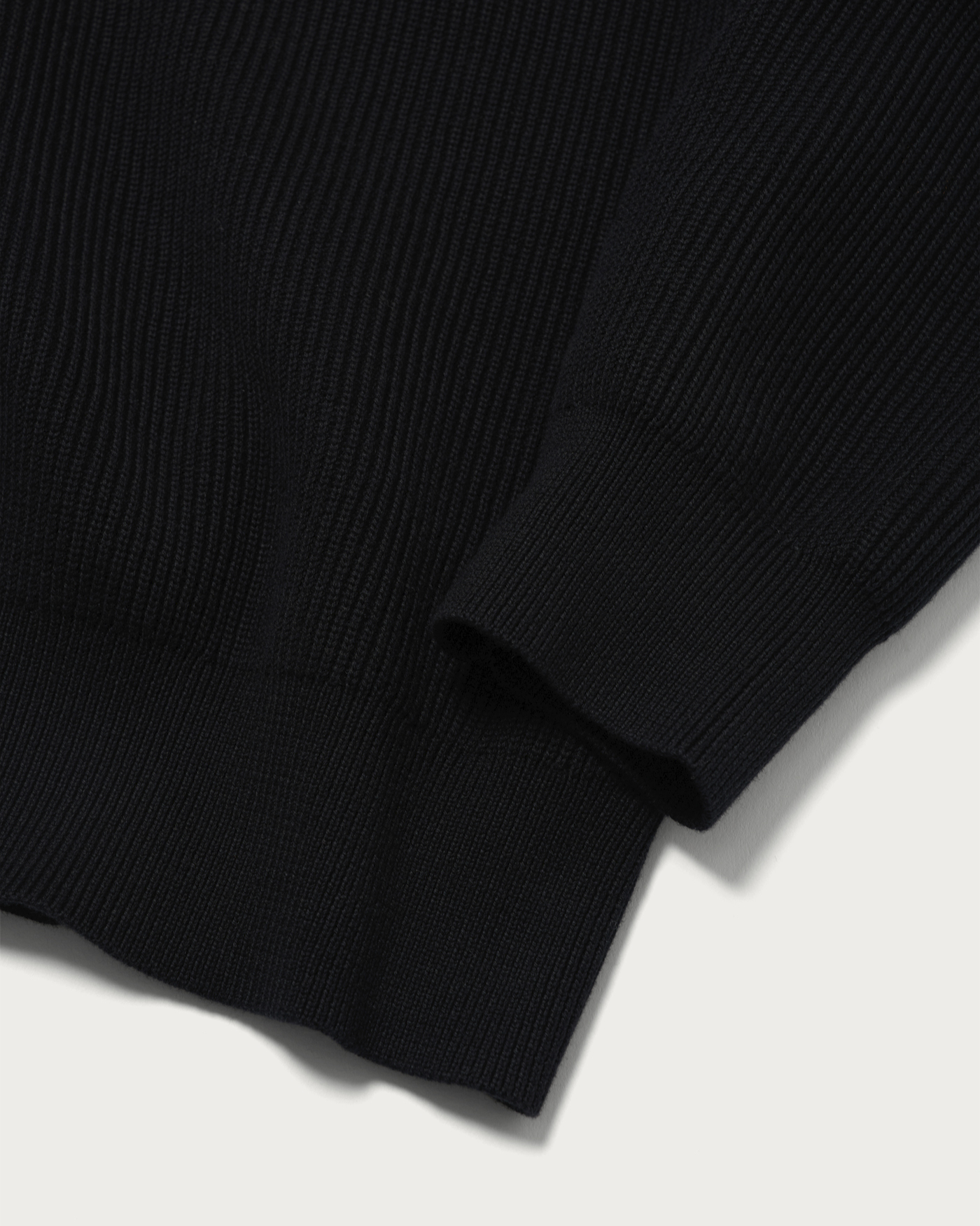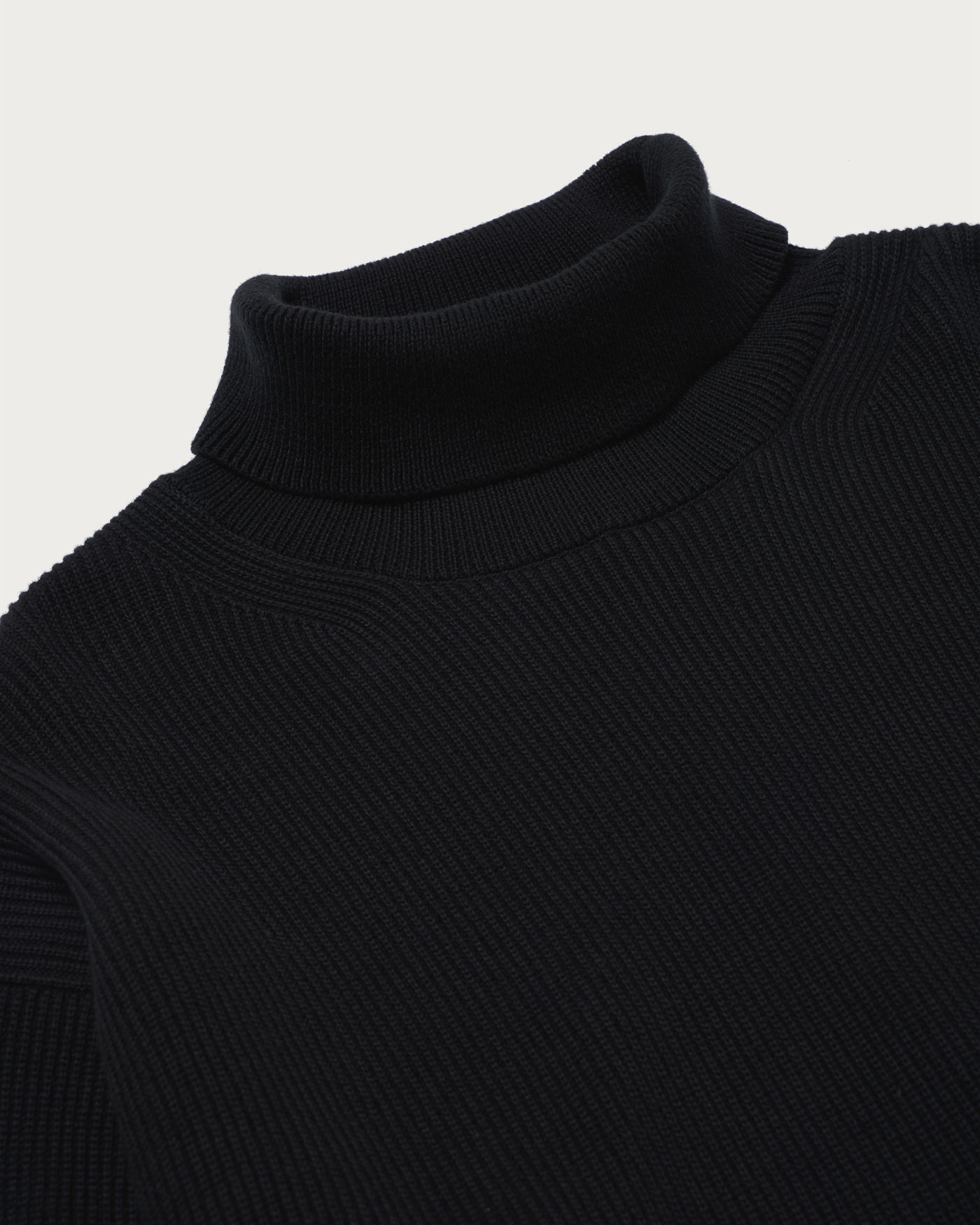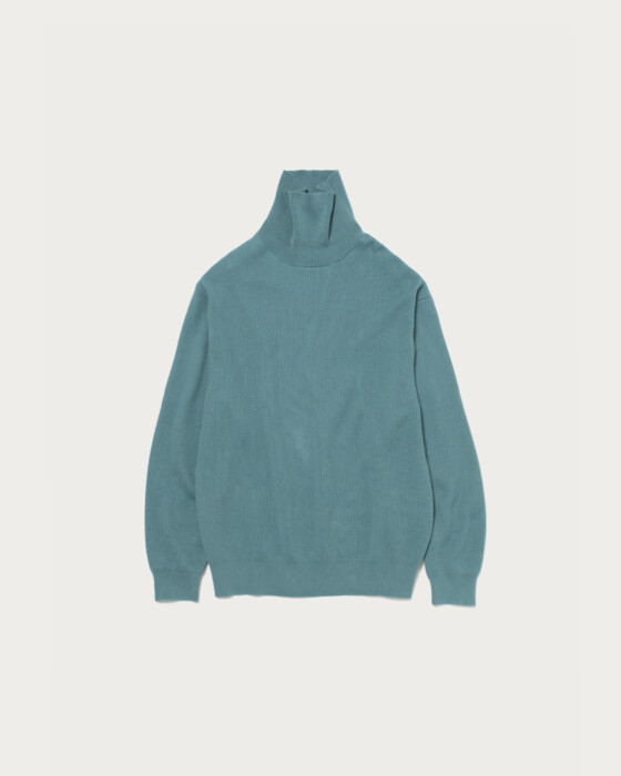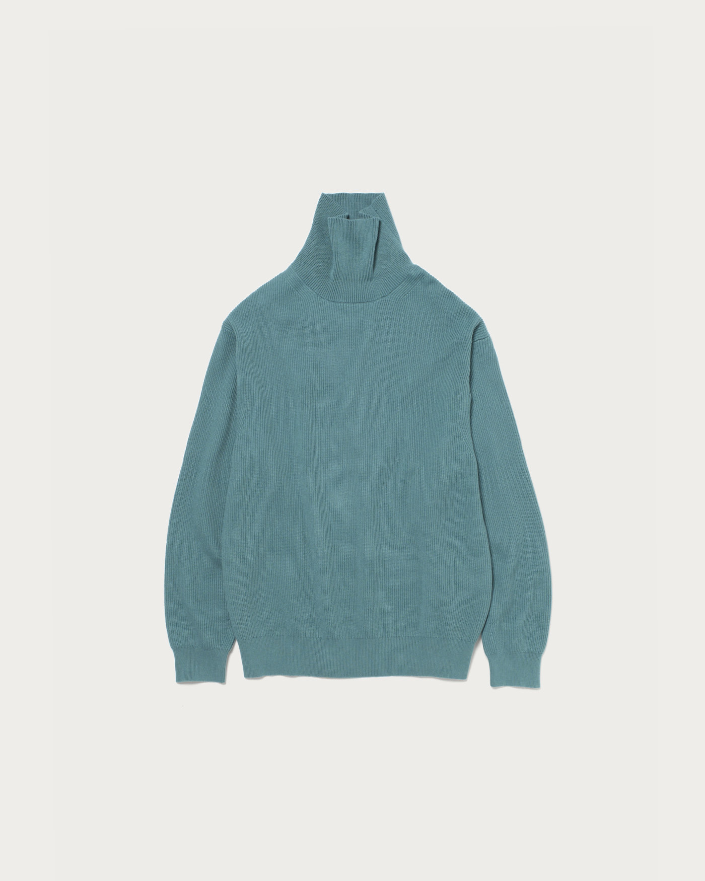 A basic ribbed turtleneck knit, meticulously finished. It offers a moderate fit that makes it easy to pair, whether worn alone or as an inner layer. The wider ribbing at the armholes and other areas serves as a design highlight. Made with compact cotton yarn, it features a smooth and beautiful texture. The ribbed knitting is characterized by its three-dimensional ridges. With a moderate thickness, this cotton knit is comfortable to wear even in the warmer climates of recent years.