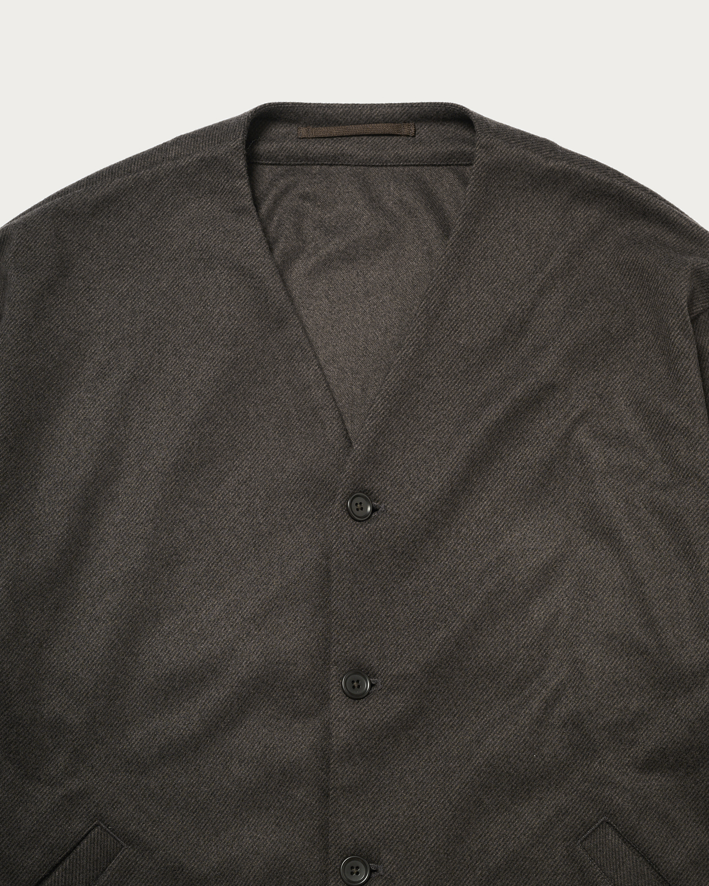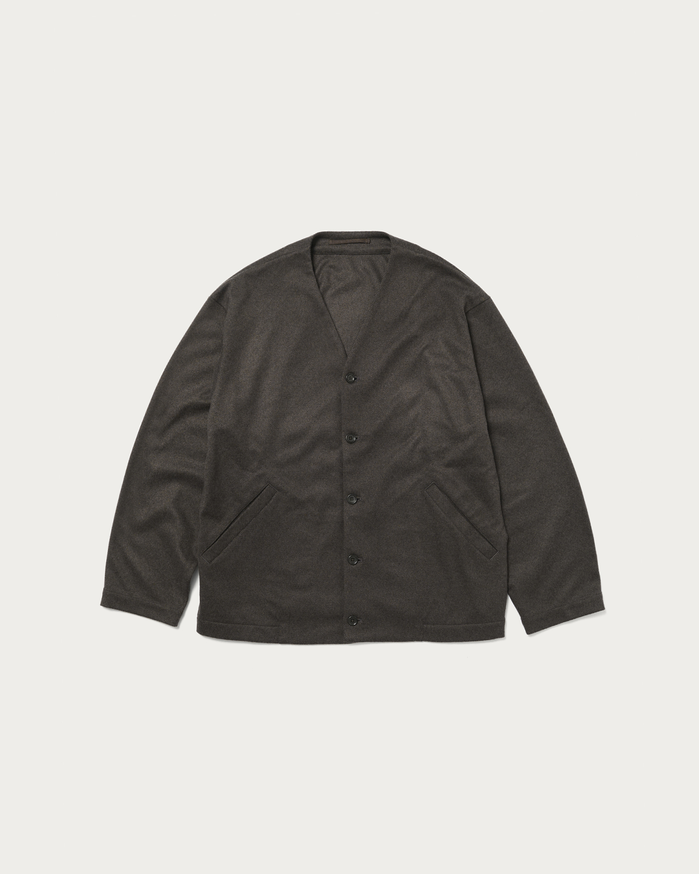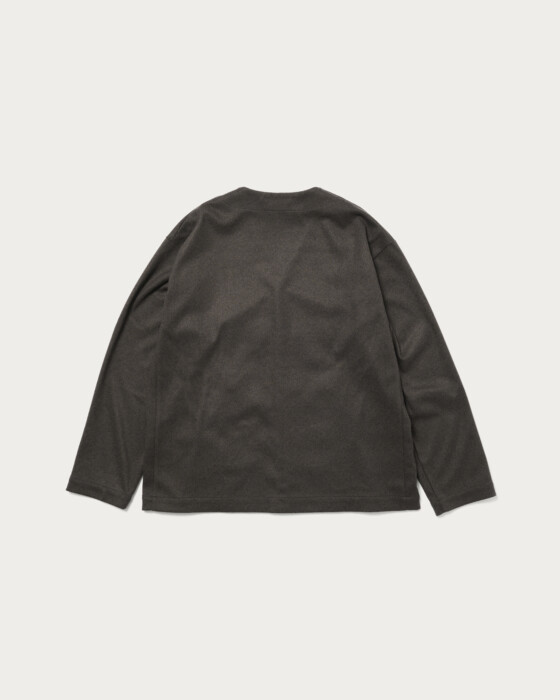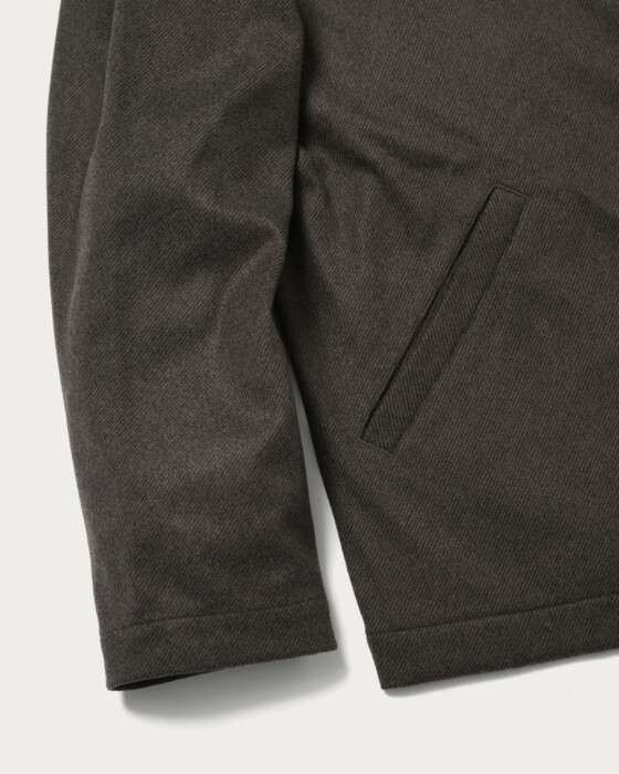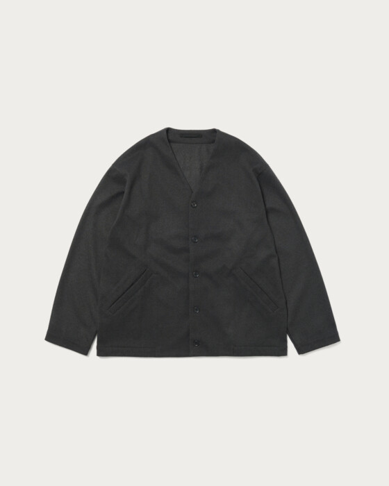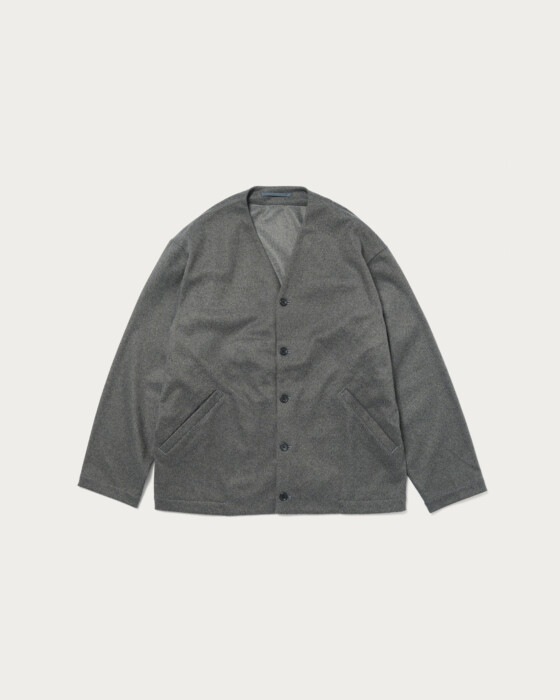 This design combines the cardigan and coach jacket, achieving both ease and lightness. The collarless design allows for versatile inner layering, offering high styling flexibility. The material is from the autumn-winter Wonder Cross series. By weaving together polyester threads that dye differently, it creates a rich, deep texture. Additionally, a brushing process is applied to smooth the nap, resulting in a material with a luxurious wool-like finish. For a set-up, pair it with pants made from the same material and a smart shirt as an inner layer, proposing a new set-up style distinct from traditional jackets.