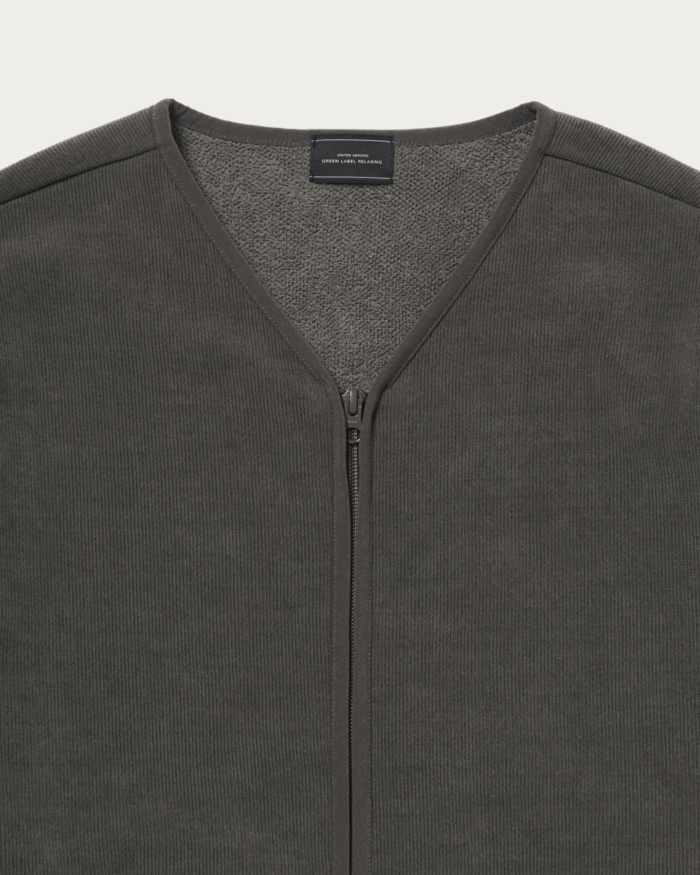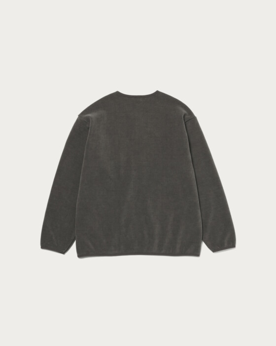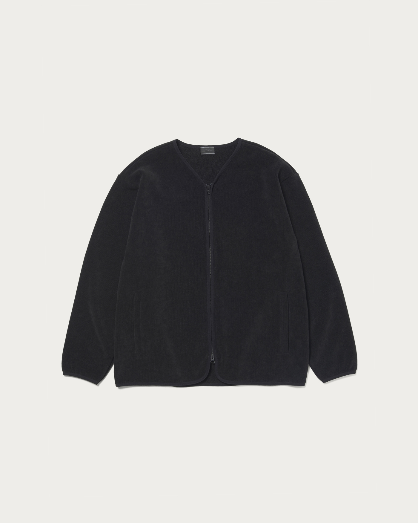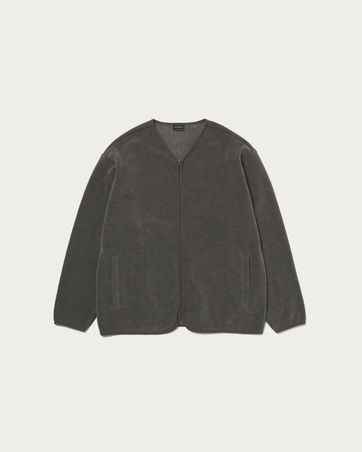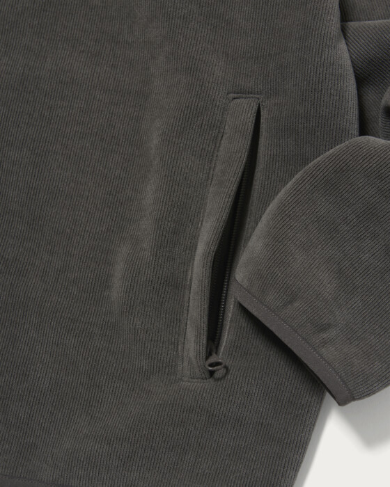 The design features piping in the same color scheme, providing a subtle accent. The front has a zipper closure for smooth opening and closing. The waist pockets are also equipped with zippers, combining practicality and security. The material used is a cut corduroy-like fabric with fine ridges on the surface, and the reverse side is a plush boa. It offers a warm and soft texture, providing a cozy and enveloping feel that is truly appealing.