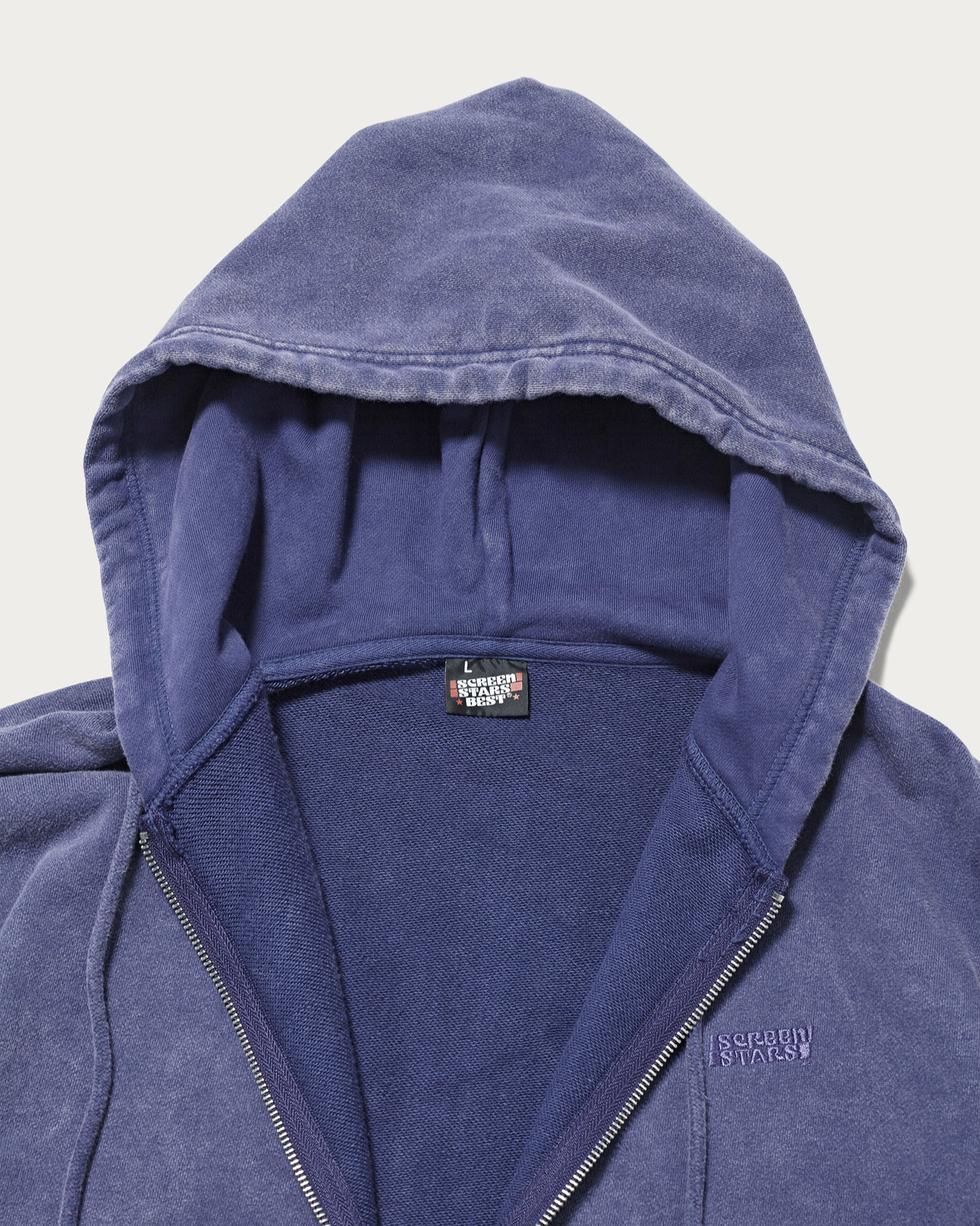 A custom hoodie from "Screen Stars." It features a vintage-like faded appeal that adds a modern touch to clean styling. This versatile full-zip piece is perfect for layering—throw it on when it's warm or use it as an inner layer under outerwear when it's cold.
