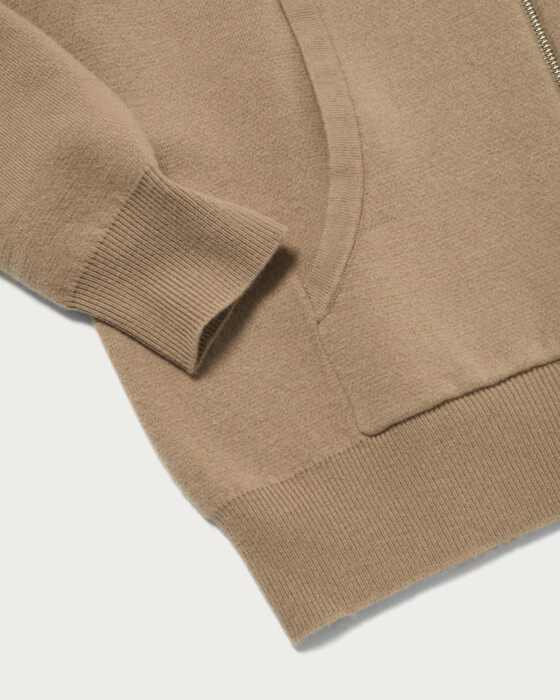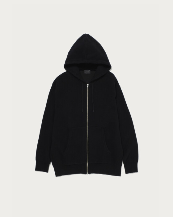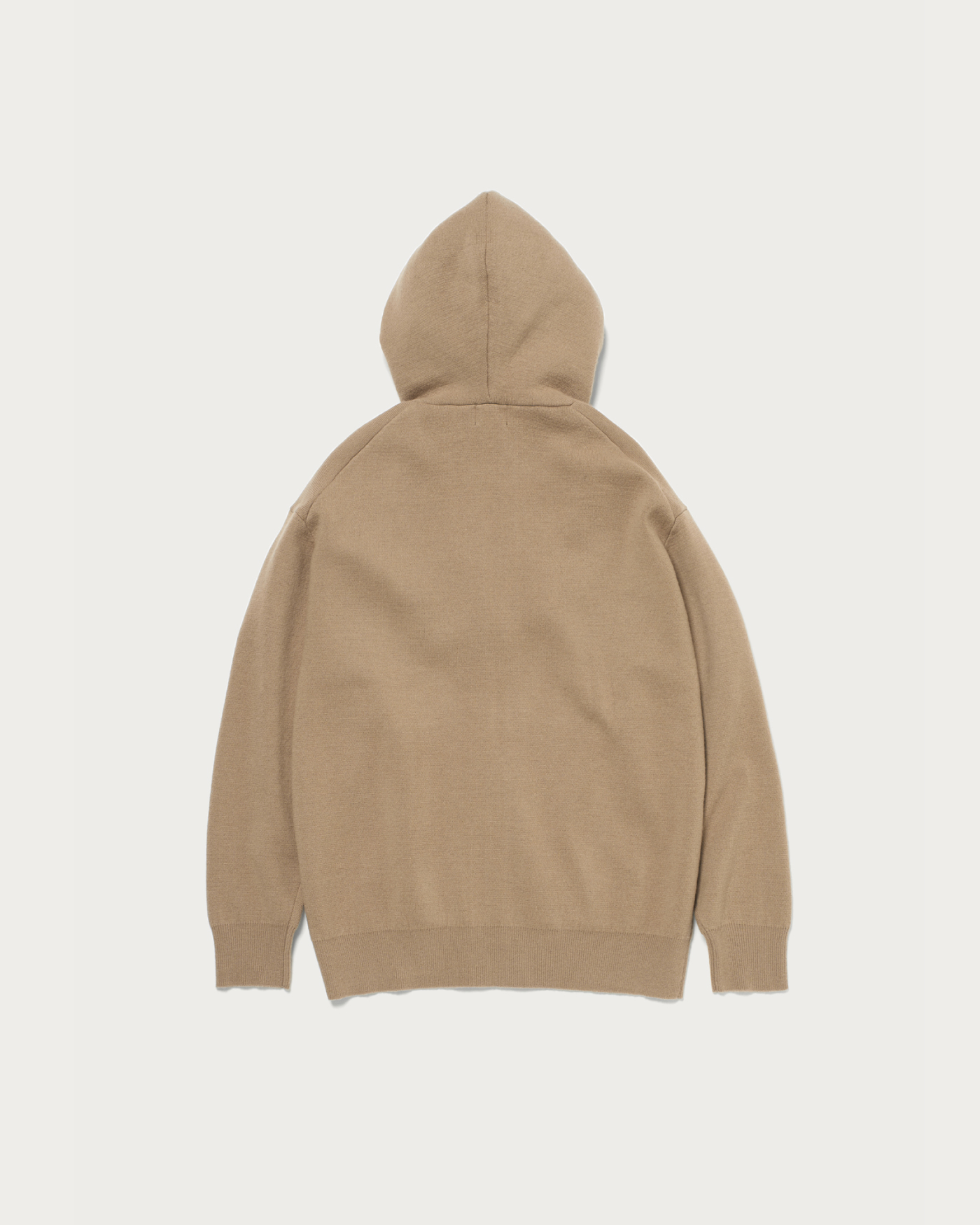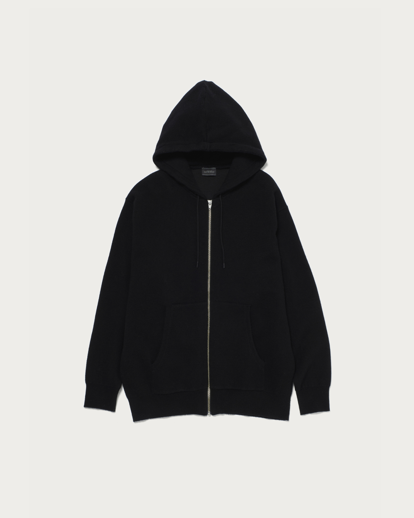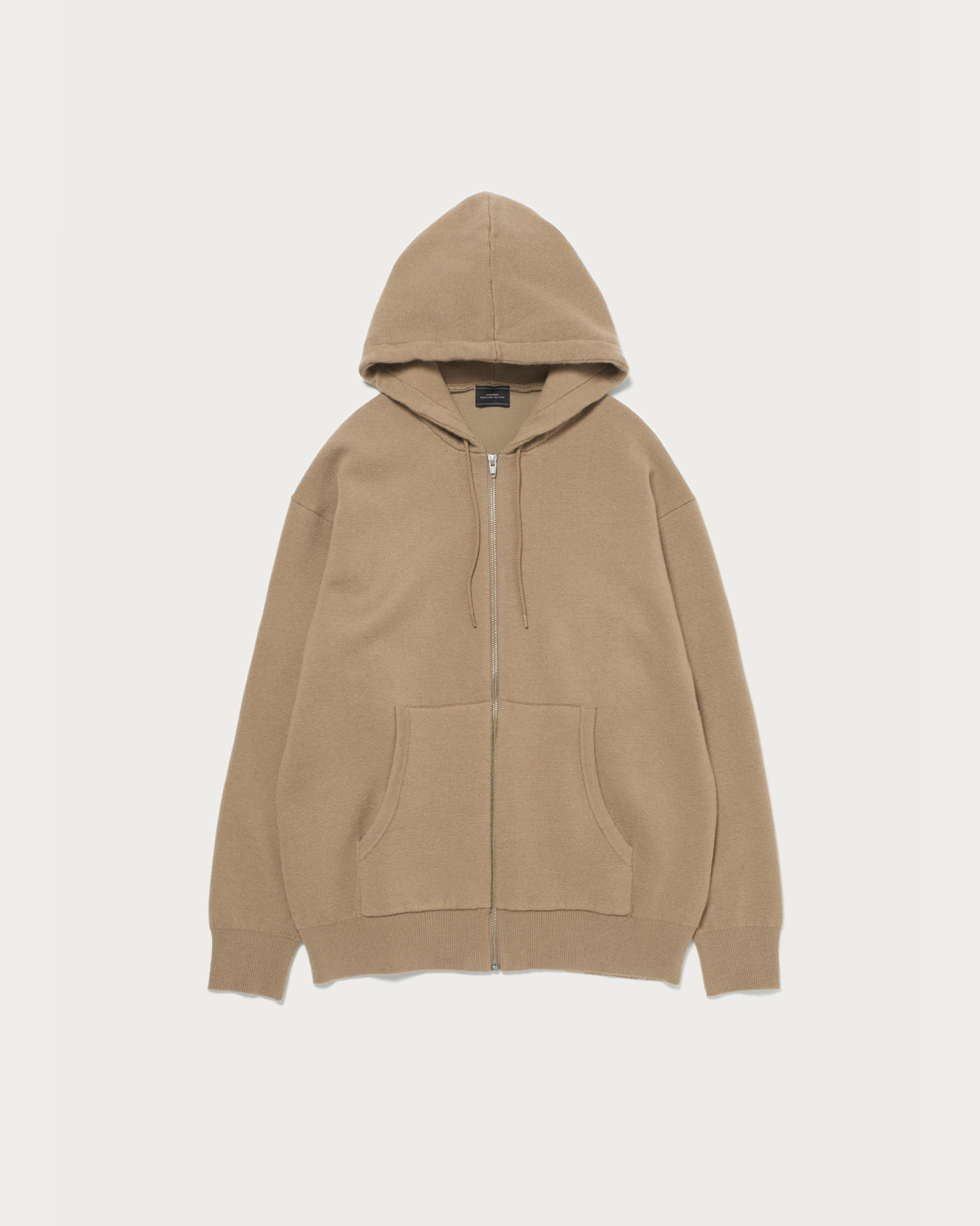 Expressing the increasingly popular zip-up hoodie in recent years with high-quality knit material. The charm lies in the knit's unique fullness, warmth, and soft texture. It features a relaxed silhouette with just the right amount of roominess, and the kangaroo pocket adds a subtle design point. The outer side uses a wool-blend yarn to create a plump, voluminous feel, while the inner side uses polyester yarn for a smooth and comfortable wear.