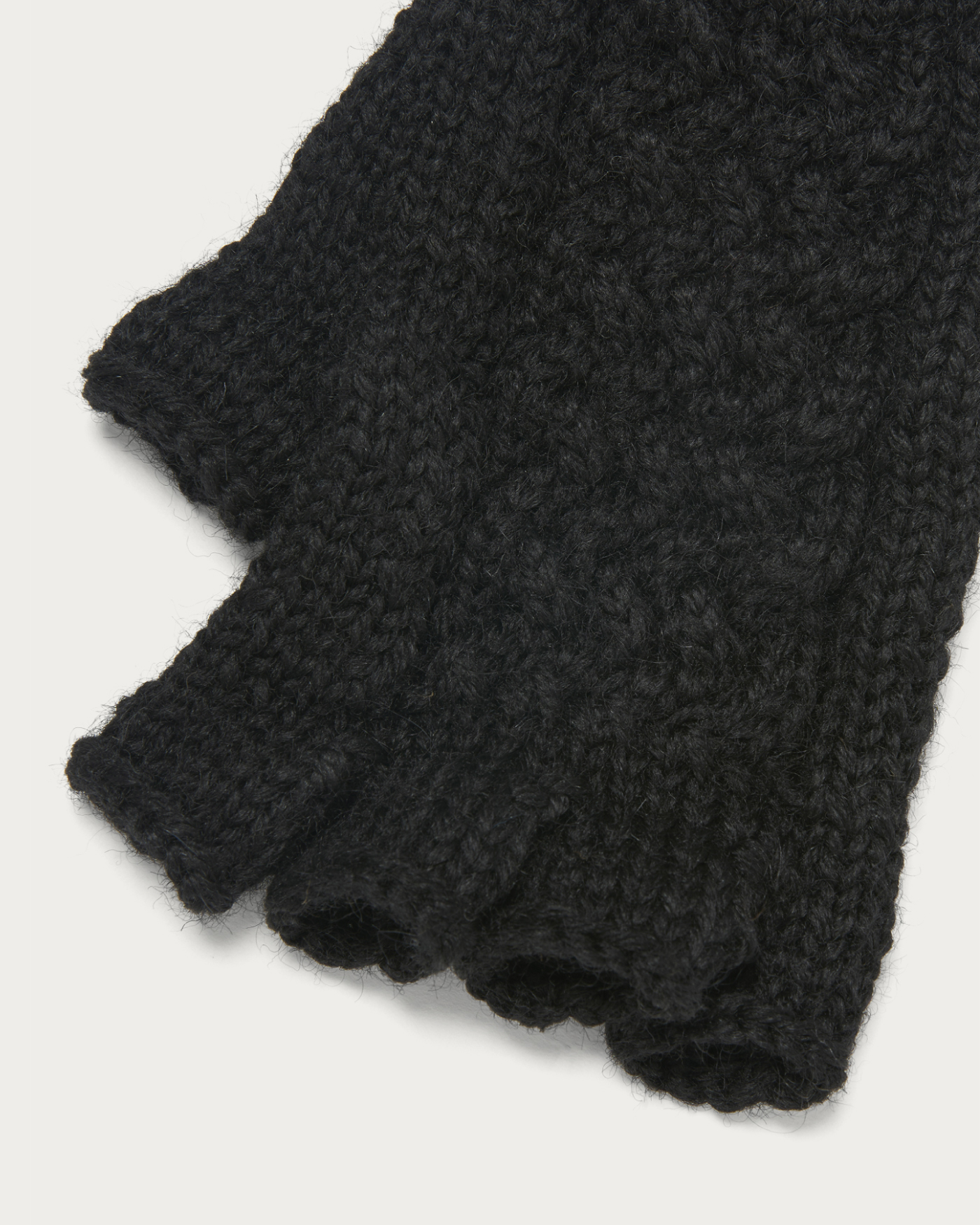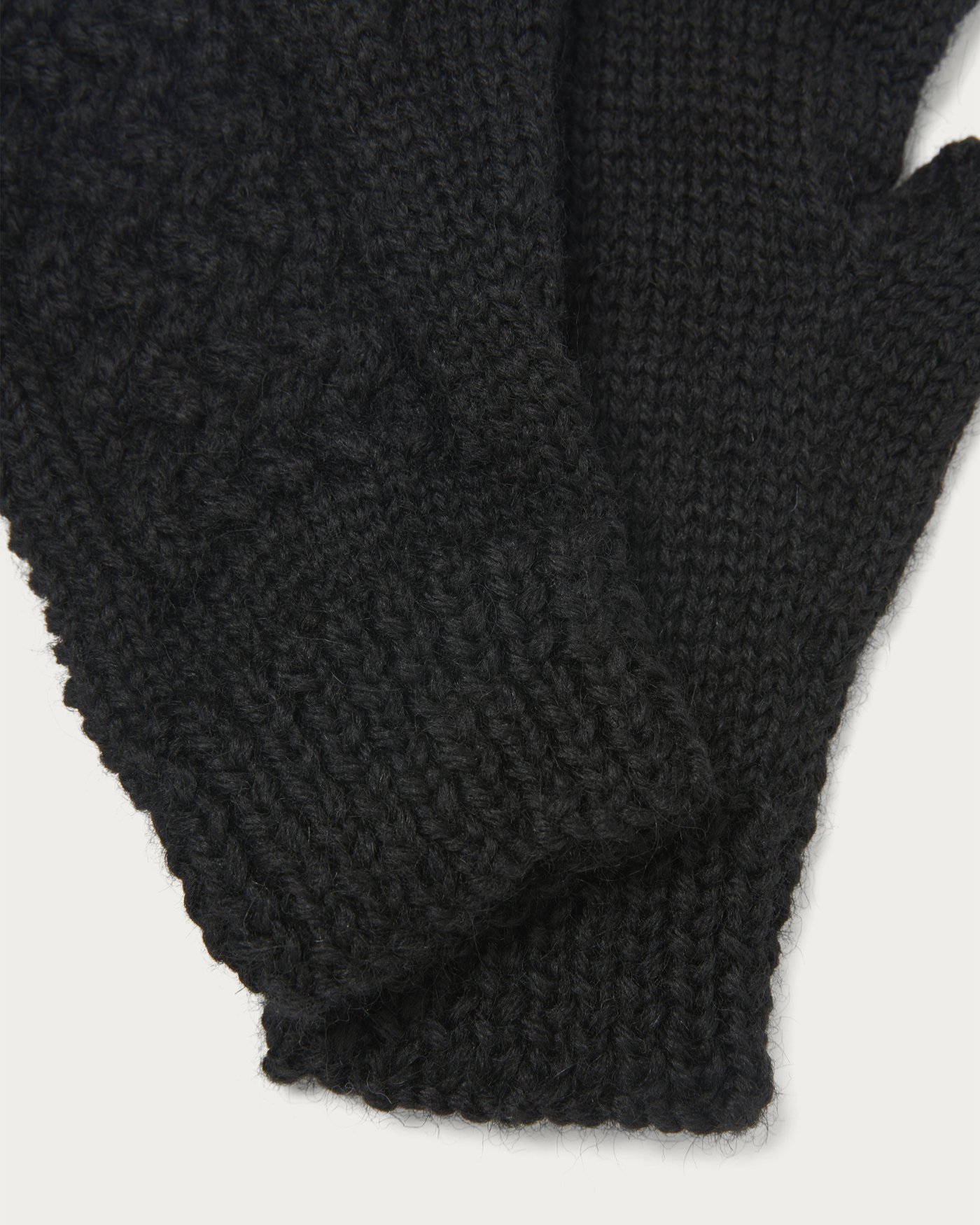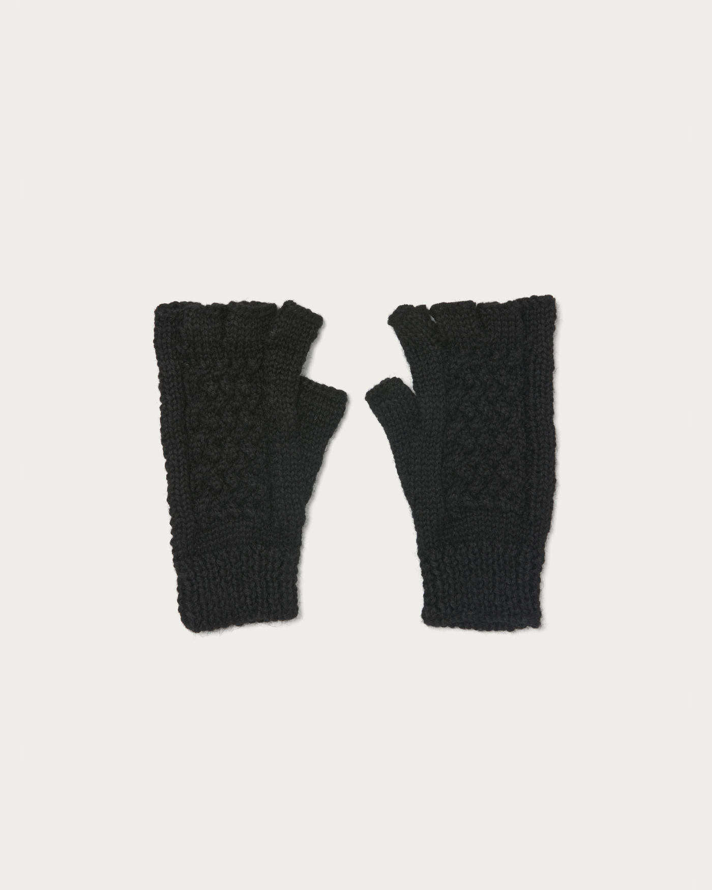 Fingerless gloves made from the rare black wool of British Black Welsh Mountain Sheep. They feature a soft texture with excellent insulation properties and a subtle design point with Aran knitting on the back of the hand. These gloves combine practicality and elegance, making them suitable for modern lifestyles, such as using tablets.
