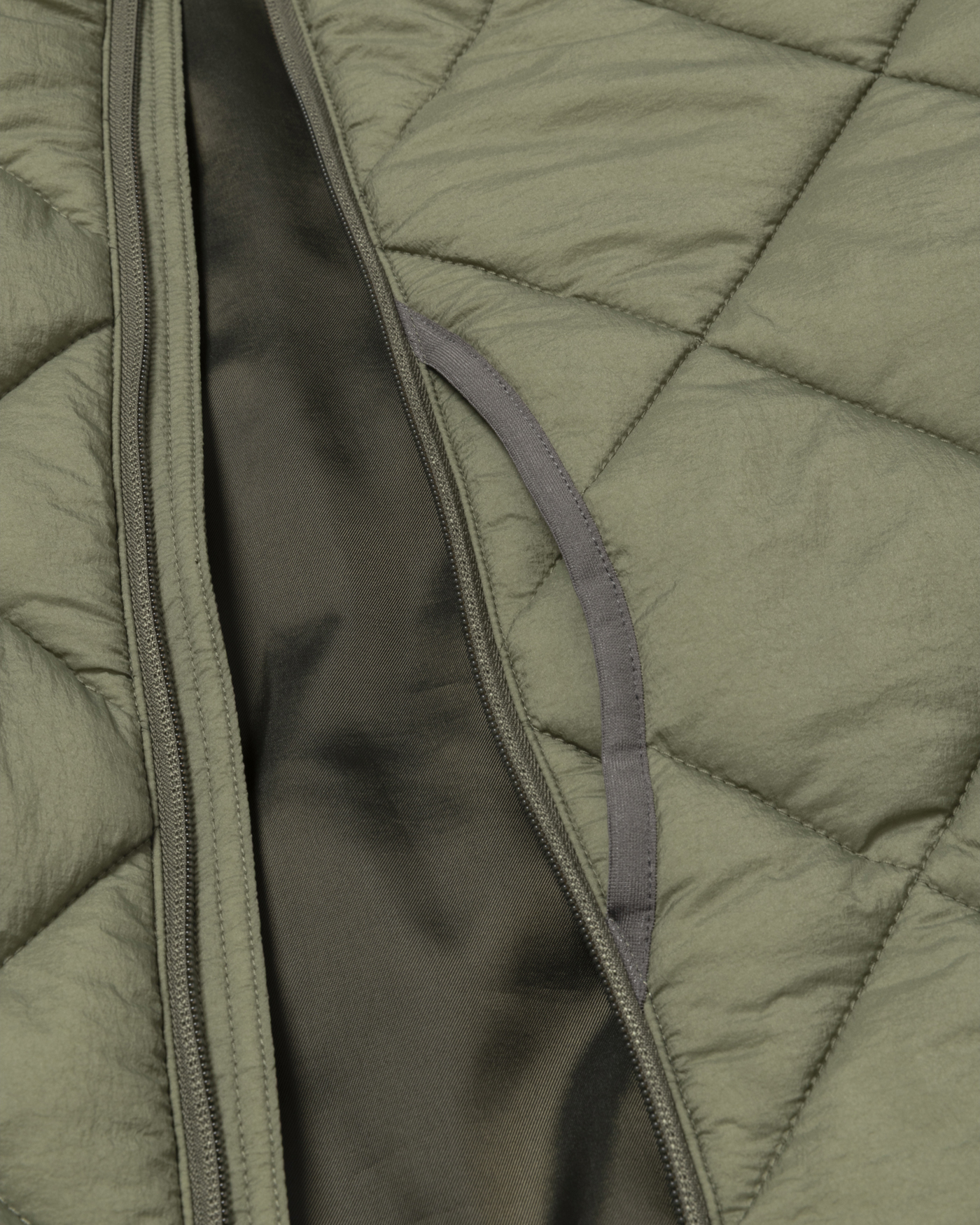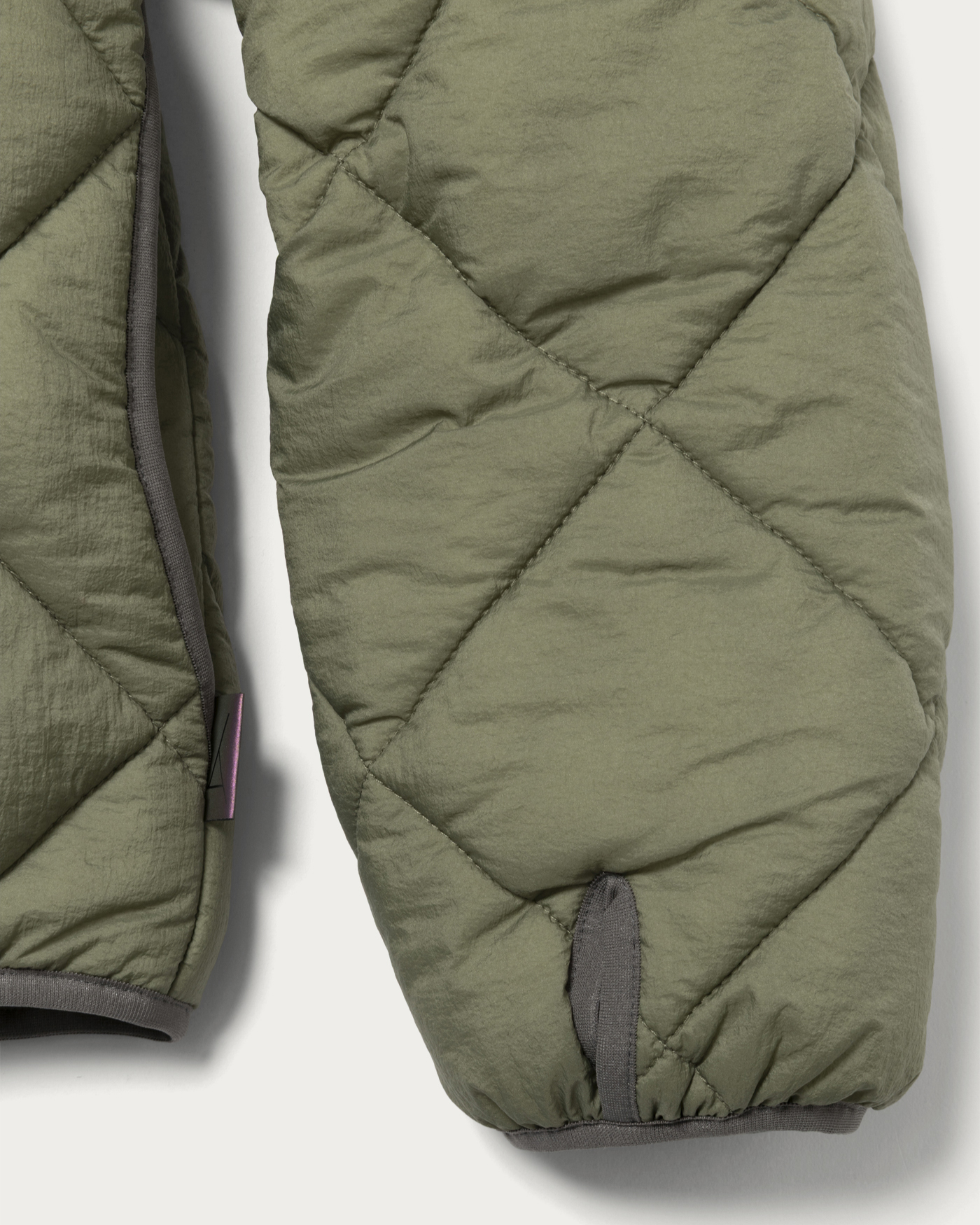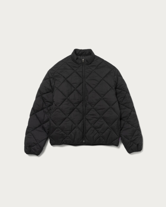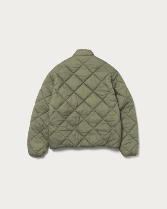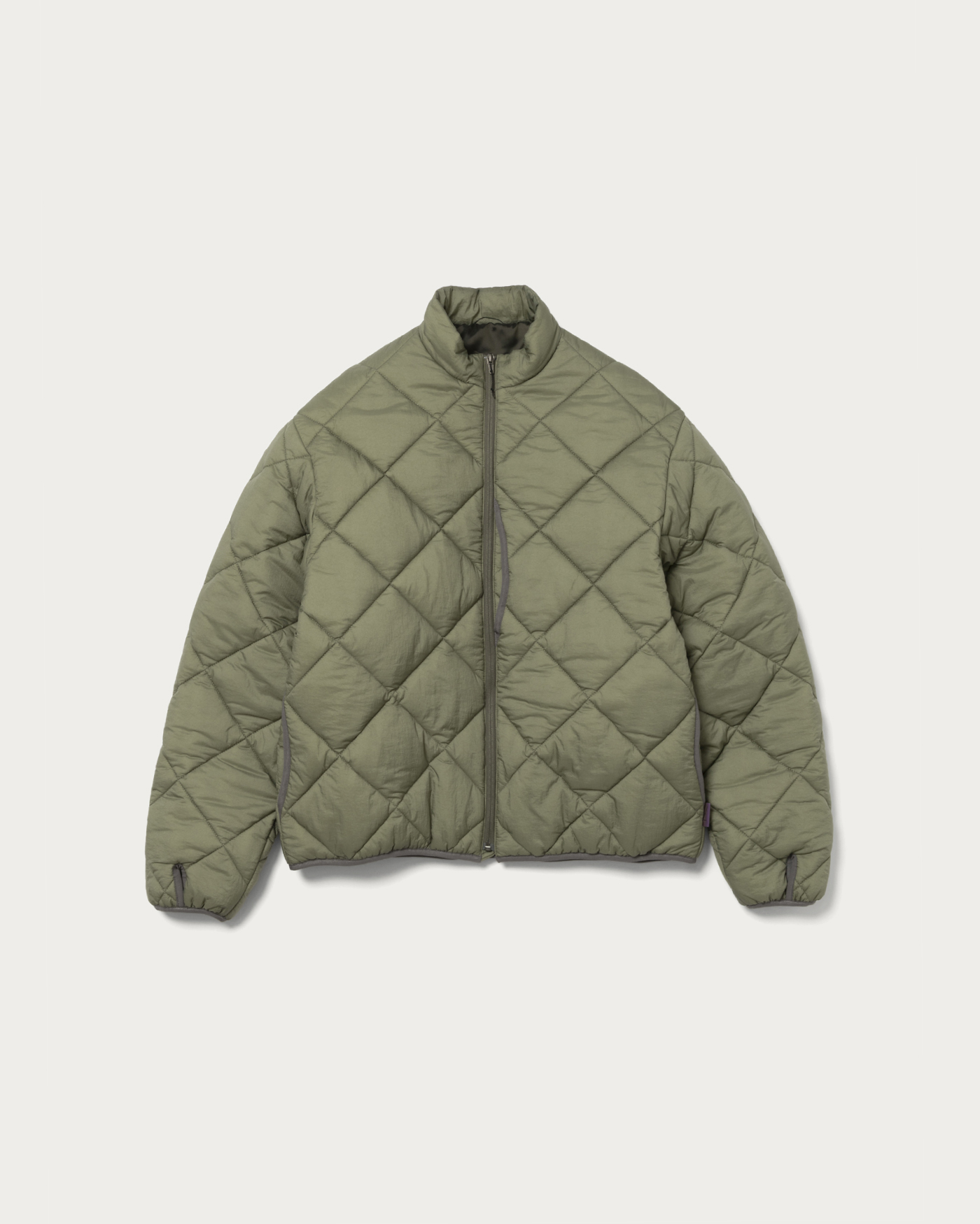 This is a quilted jacket made from sheer taffeta material, woven with fine nylon threads at a high density. It offers a light and comfortable fit with a relaxed sizing. The hem and cuffs feature a binder finish, and there are easily accessible half-moon pockets on the left chest and waist. Additionally, a large-capacity magazine pocket is placed on the inside. The cuffs are equipped with thumbholes.