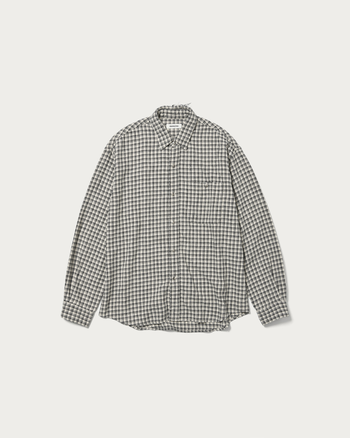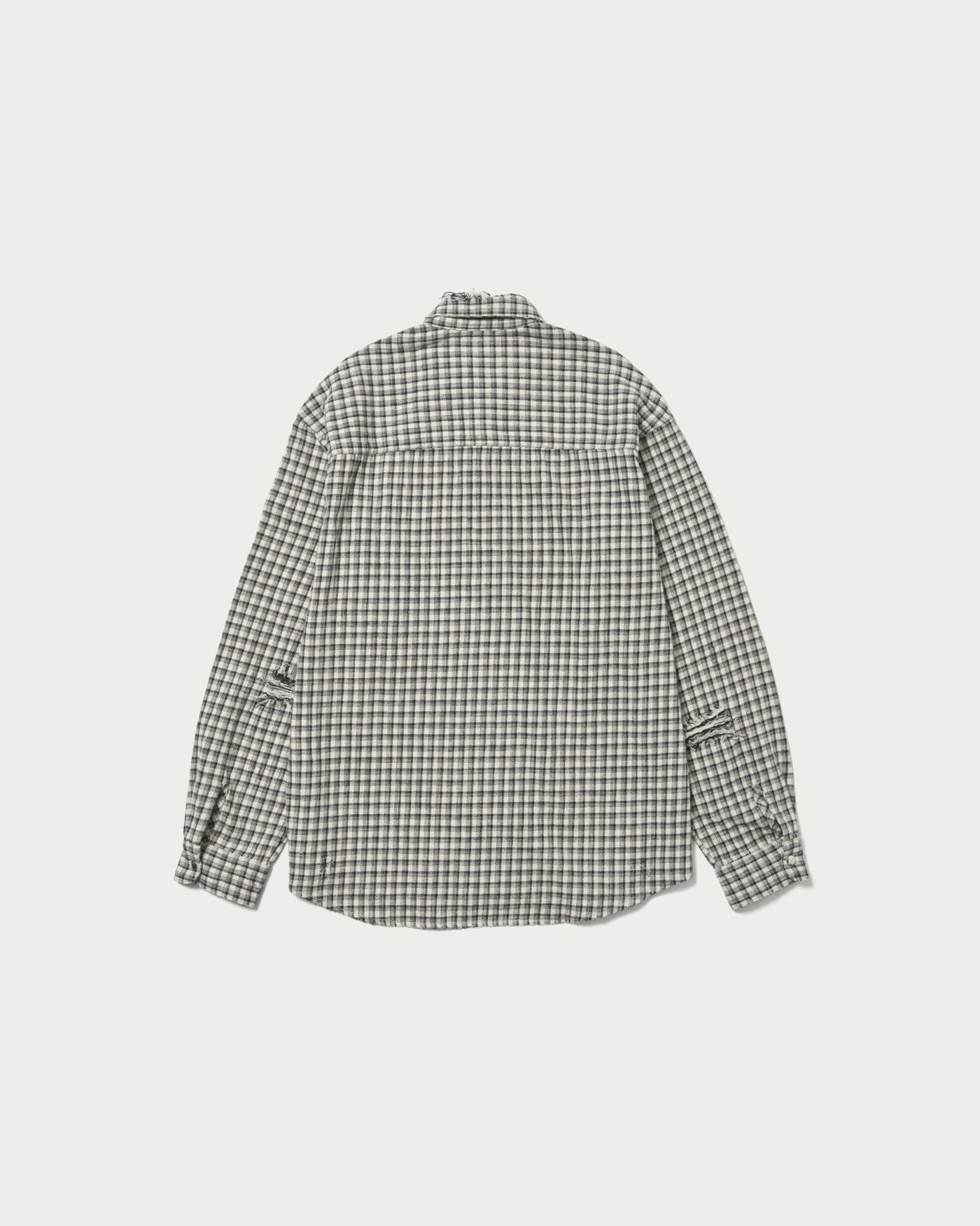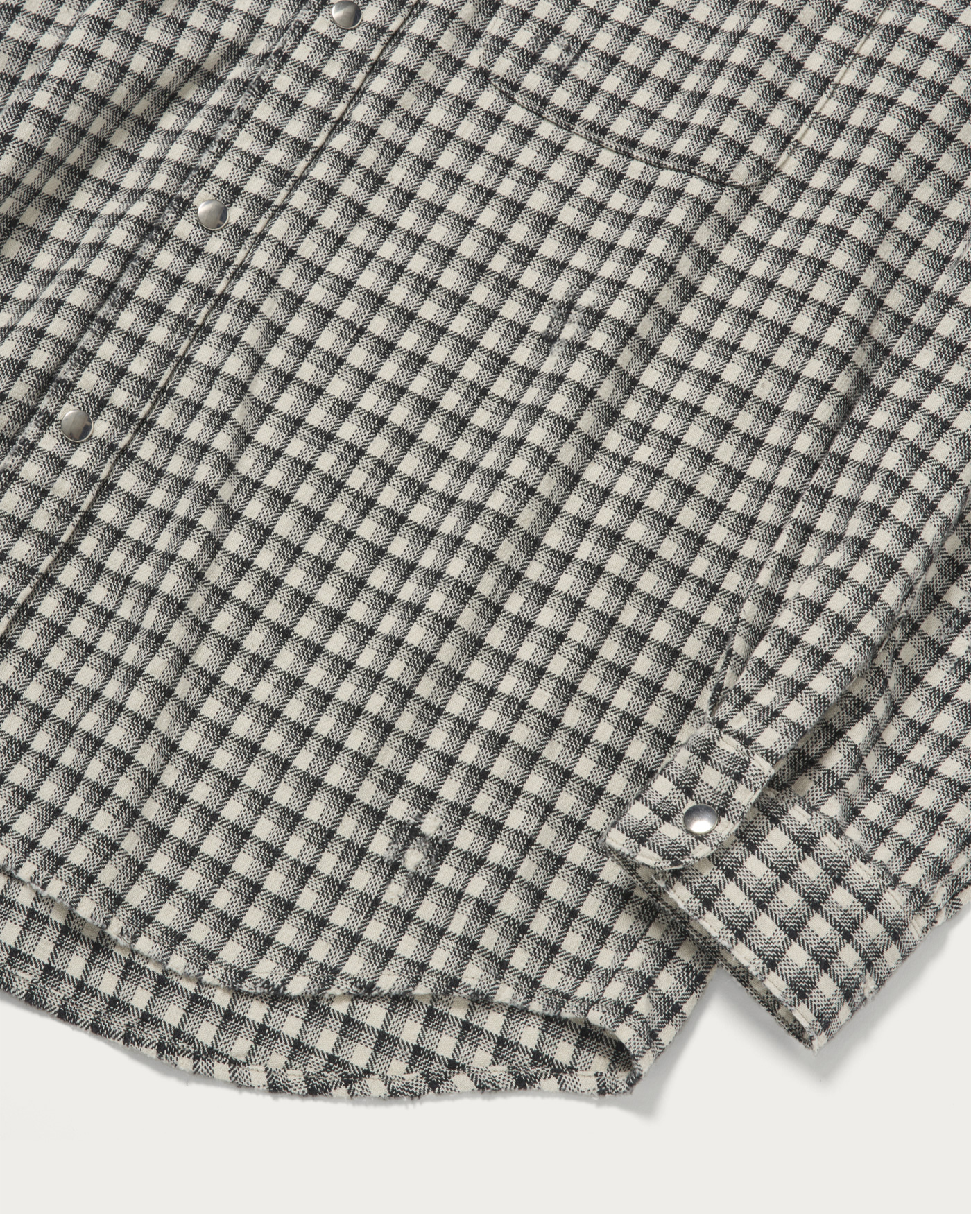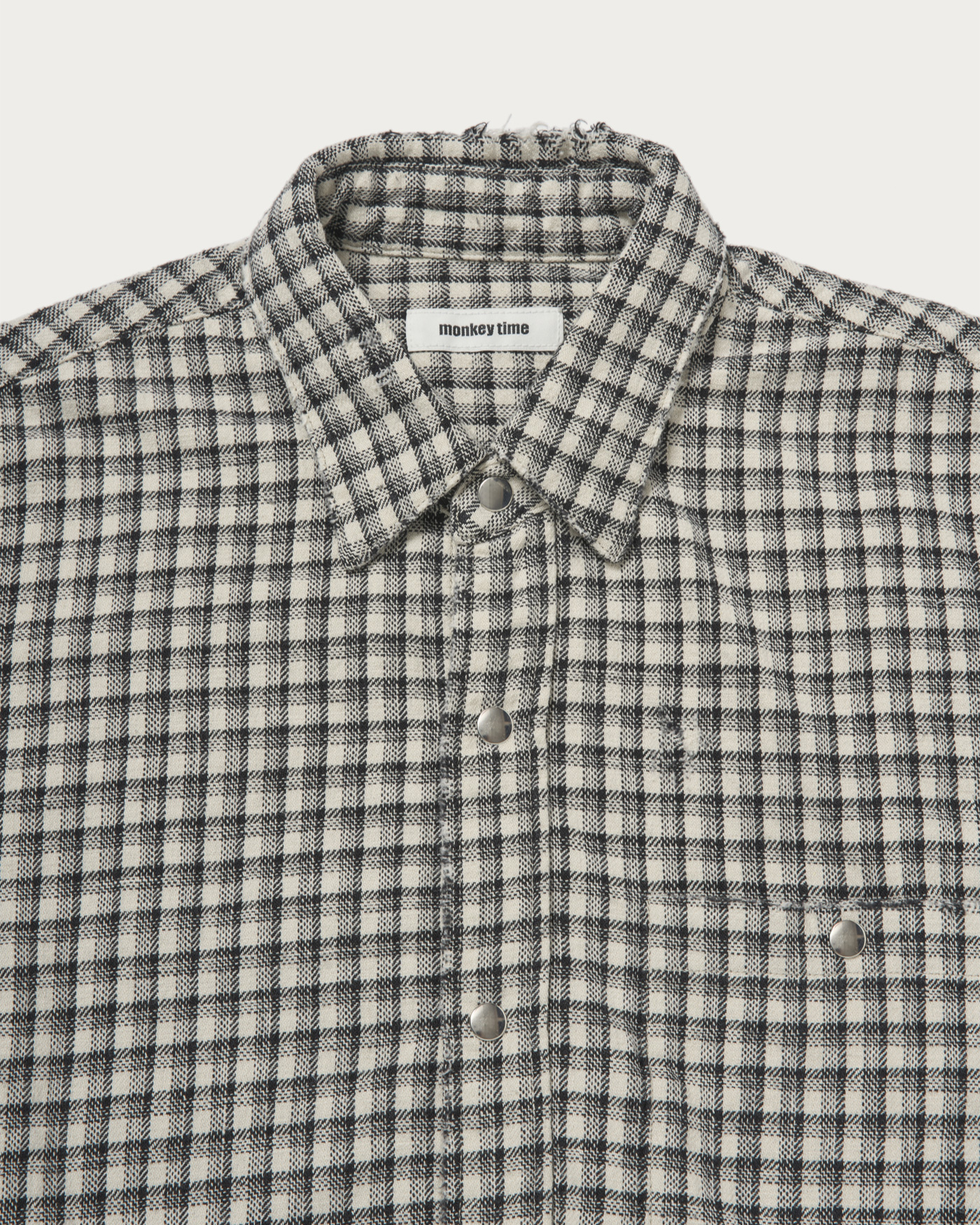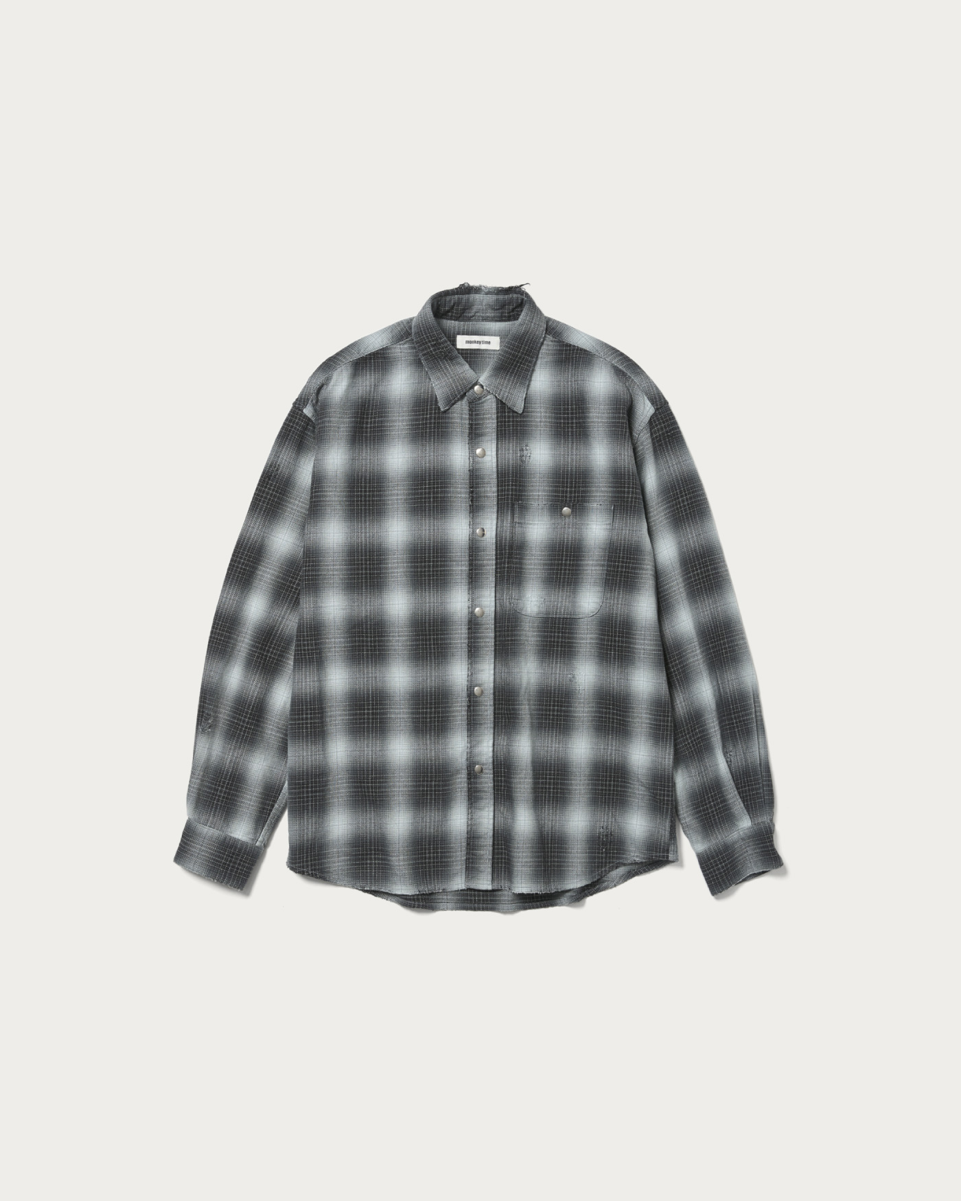 A shirt made from a moderately thick flannel check fabric. It features glossy metal snap buttons and distressed details throughout as accents, making it a versatile item that can be worn as a light jacket or as an inner layer for cold-weather outerwear.