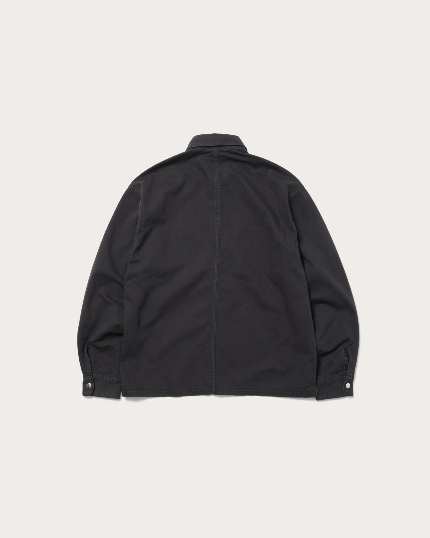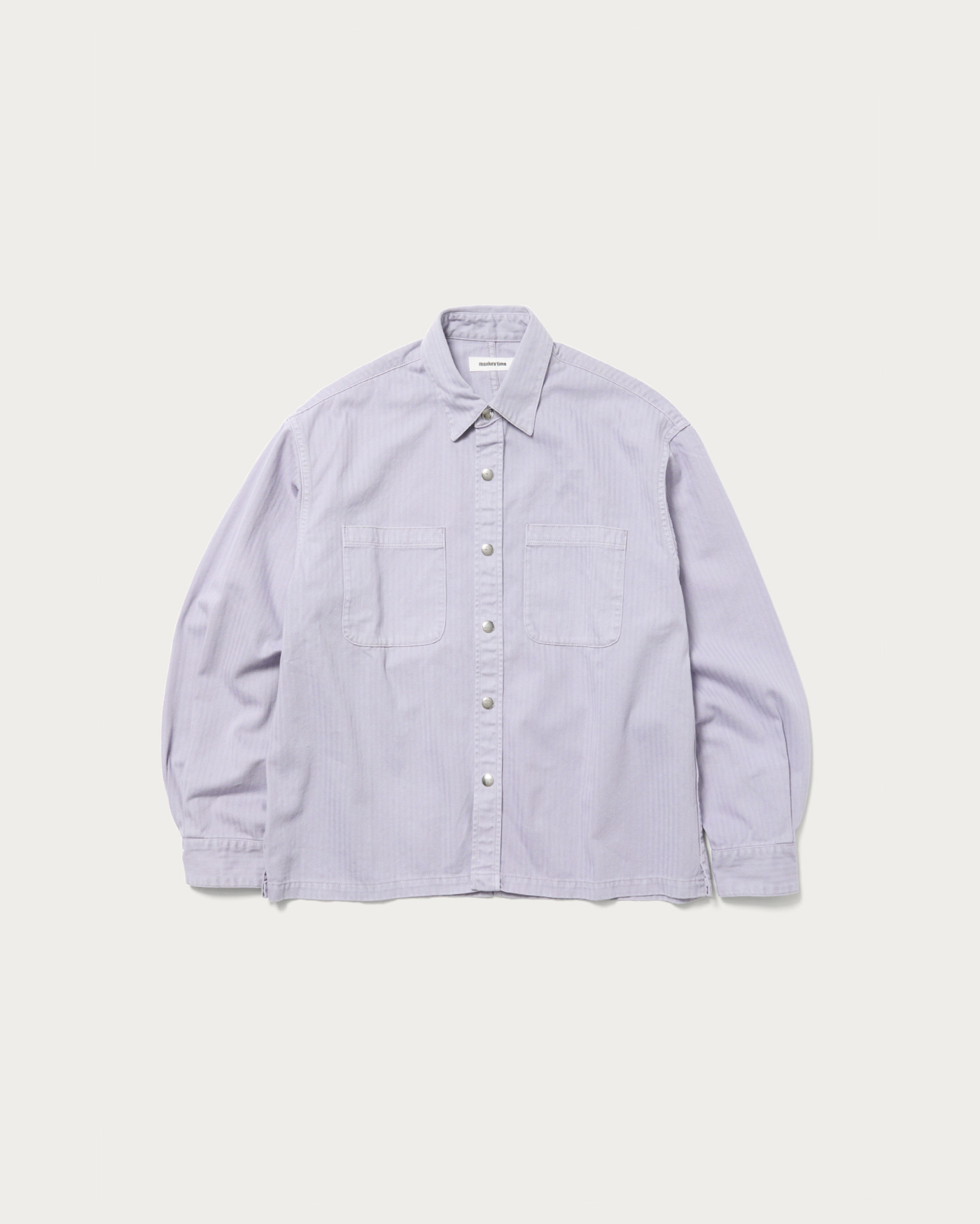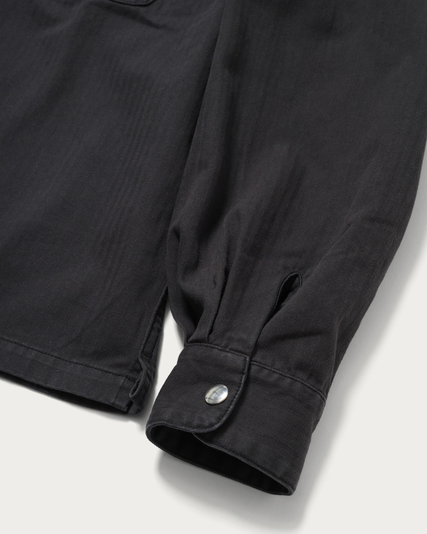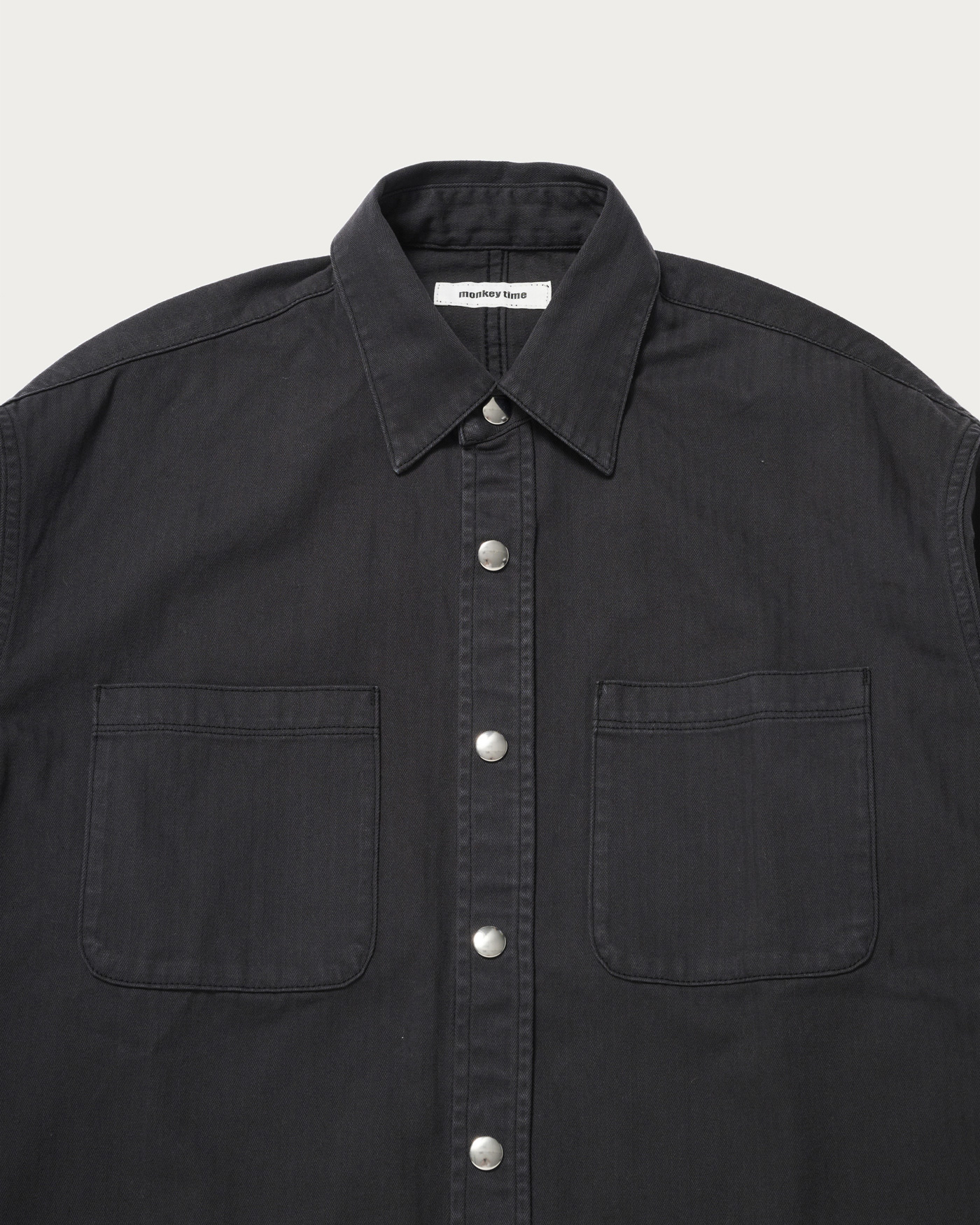 This shirt is made from herringbone fabric with a dobby weave, commonly used in military CPOs and similar garments. It features a slightly shorter length and is accented with glossy metal dot buttons.