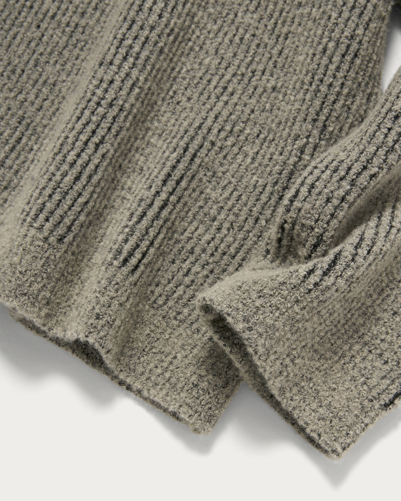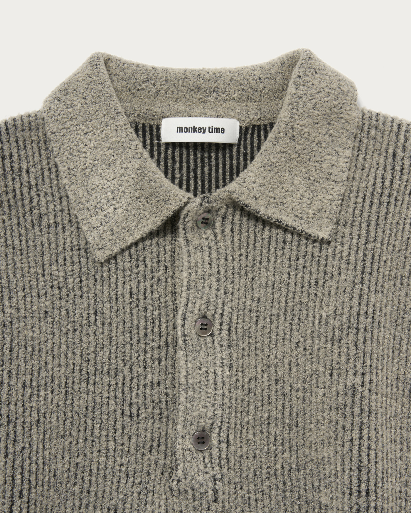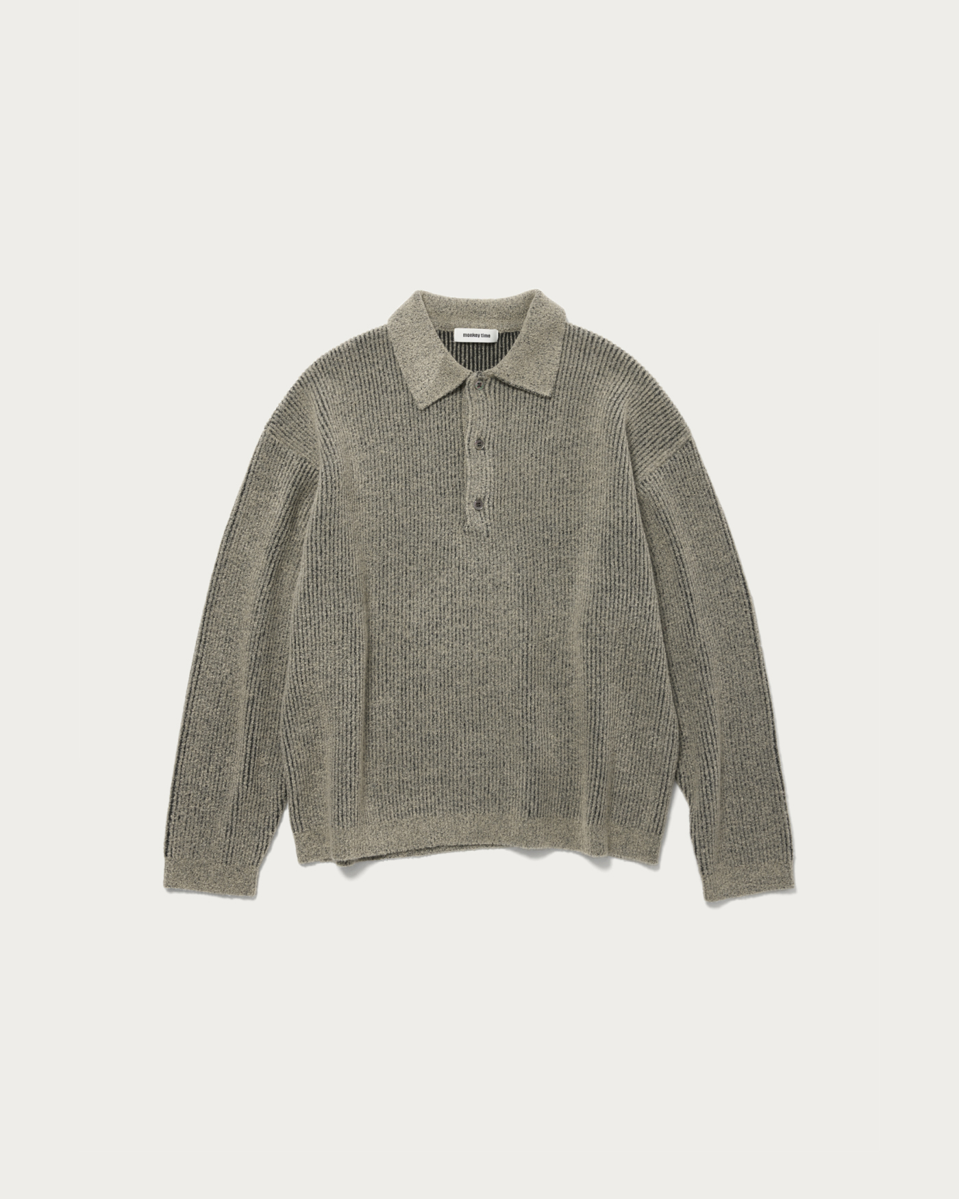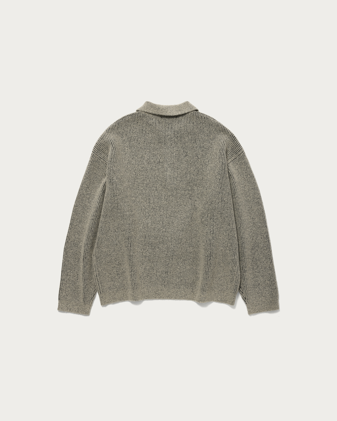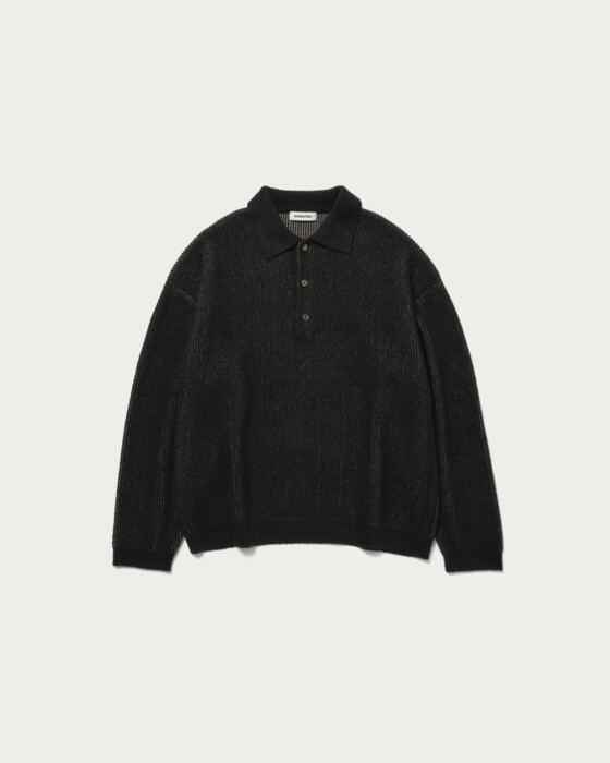 A knit polo that uses fine looped yarn with texture on the surface and is plated with polyester yarn on the reverse side. The compact length and reverse plating reduce the typical itchiness of knitwear, making it a comfortable item that can be worn like a sweatshirt.