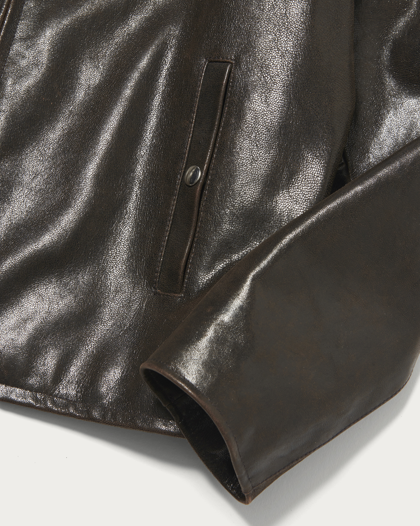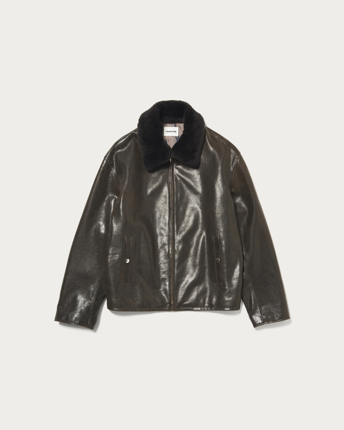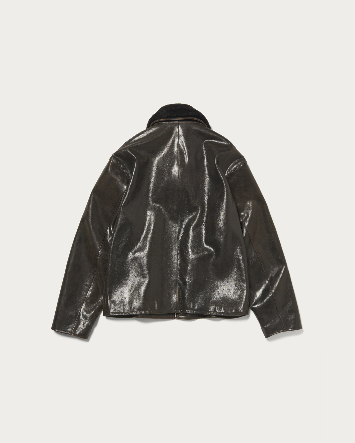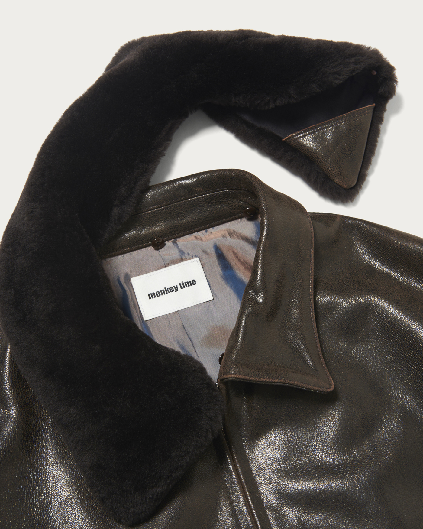 Goat leather jacket. The jacket features a black dye applied over brown leather, allowing the underlying brown to gradually emerge with repeated wear, offering the enjoyment of aging over time. The real shearling collar is detachable, making it a versatile piece suitable for wearing from fall through spring.