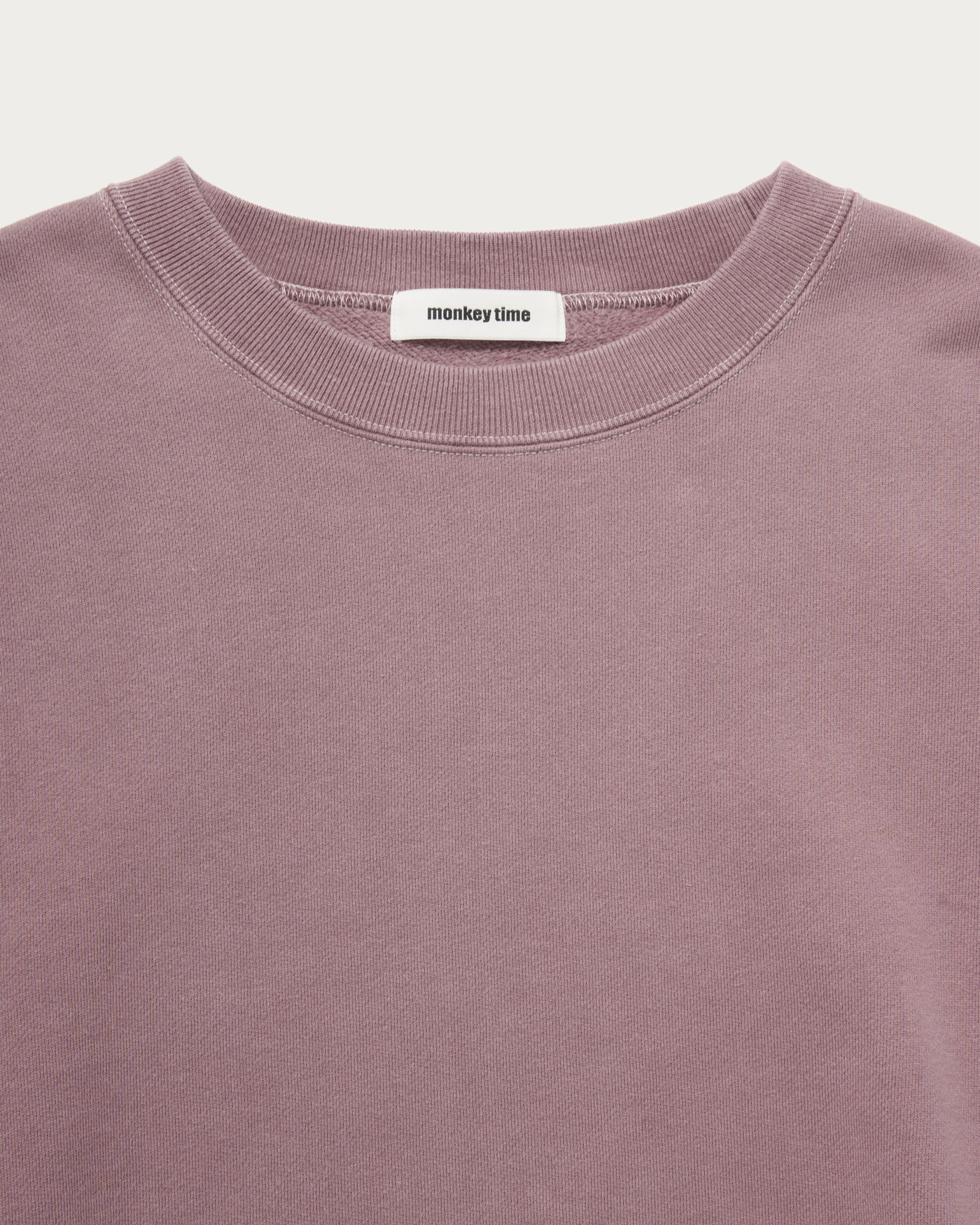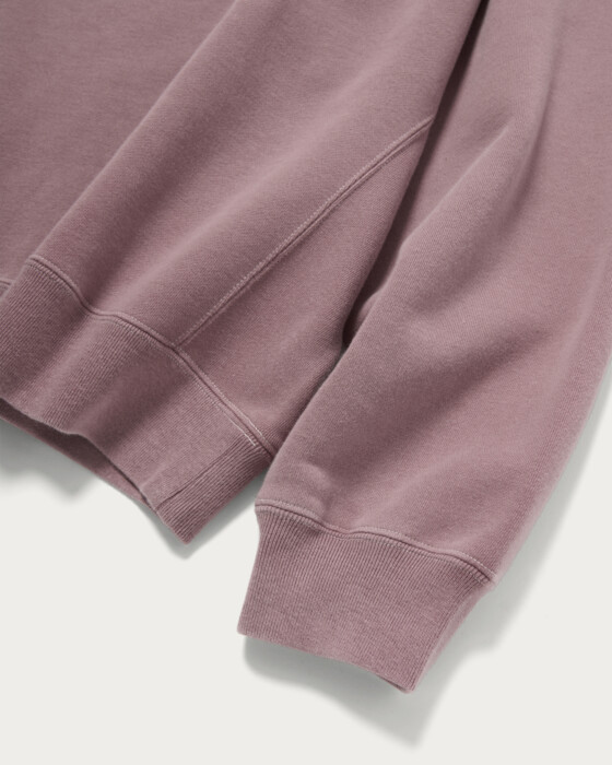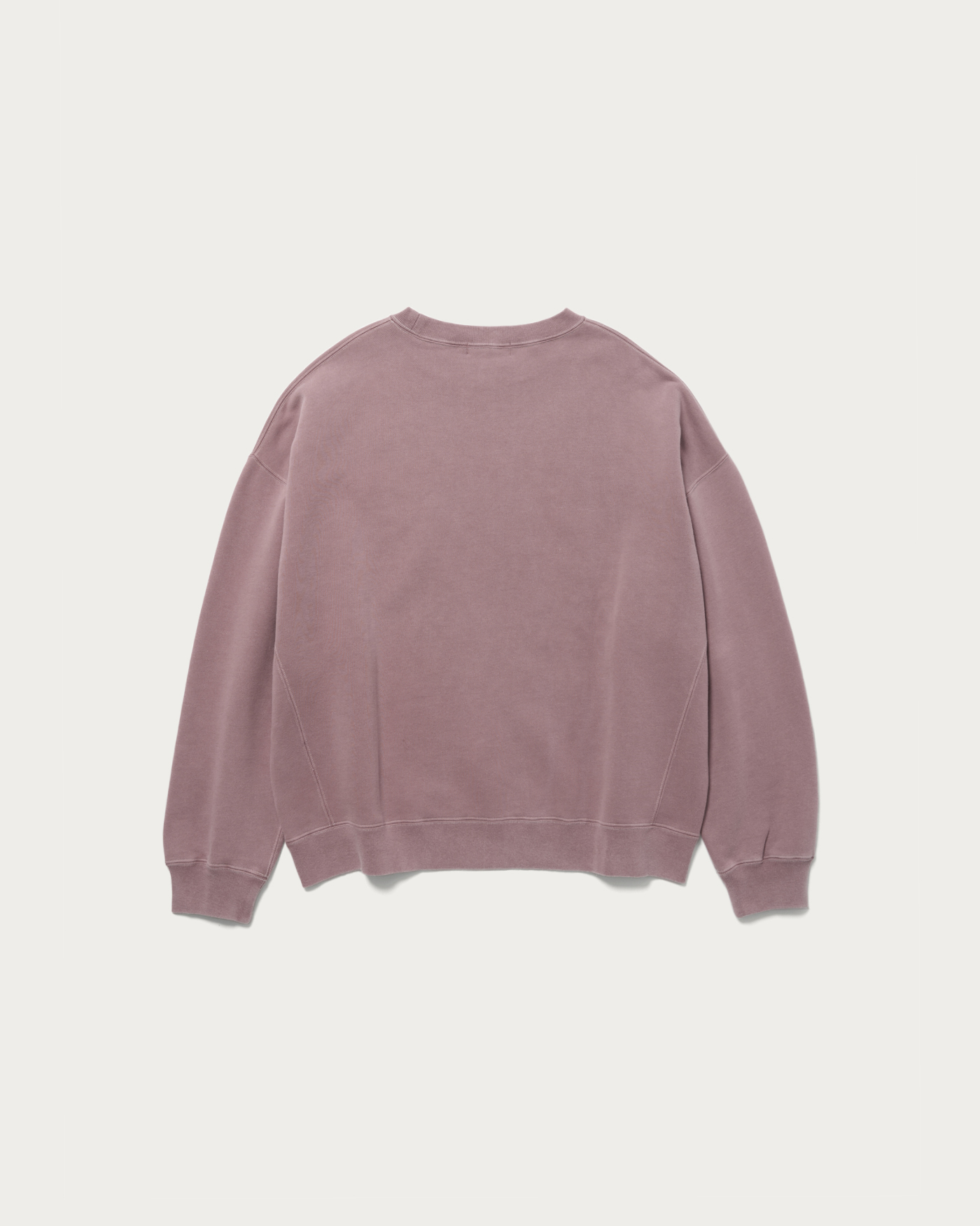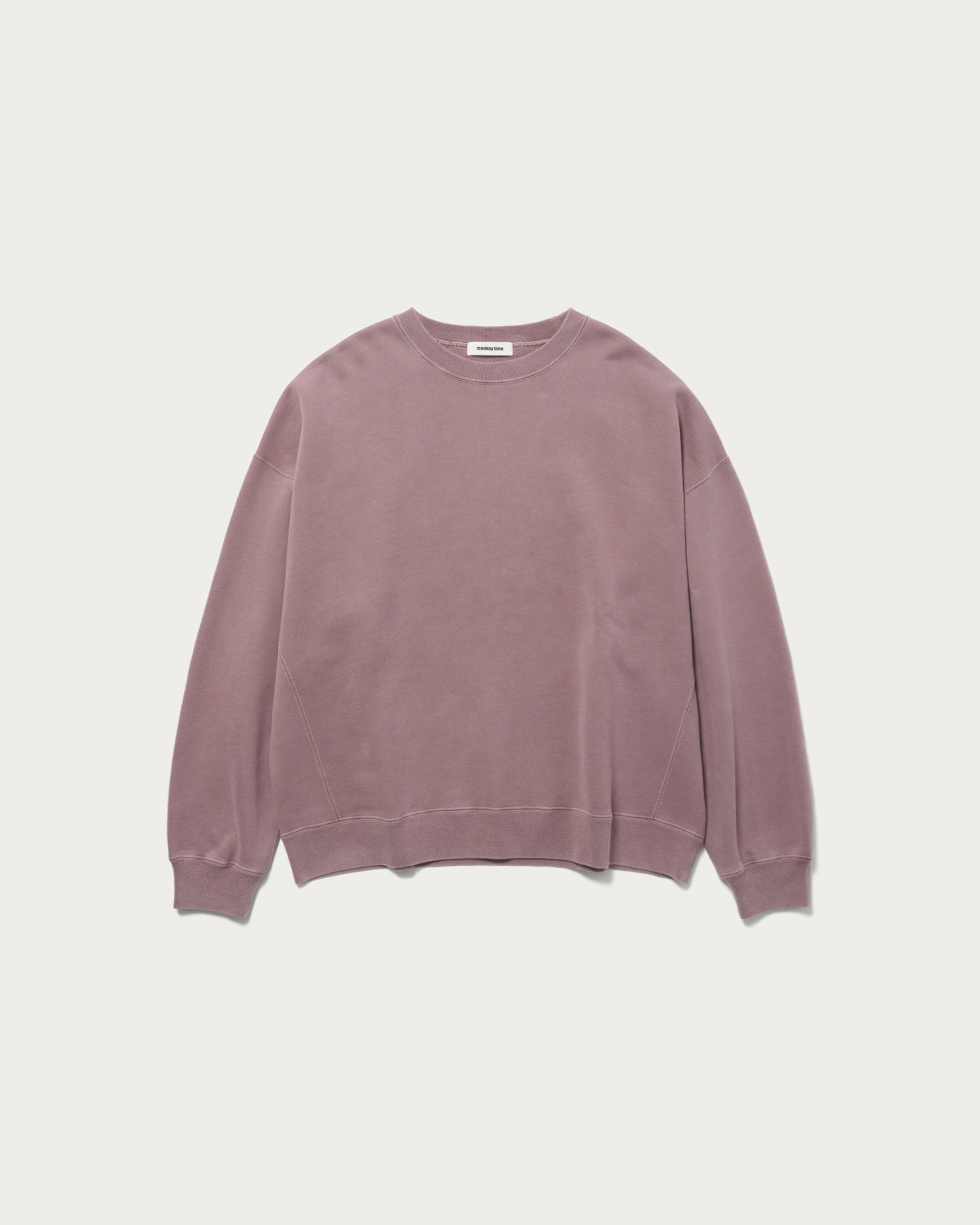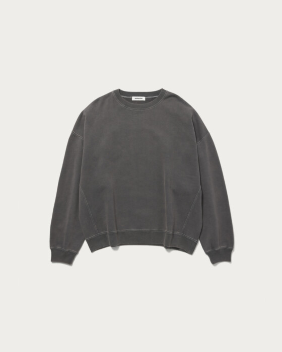 A crew neck sweatshirt with dolman sleeves made from moderately thick fleece. It features a faded look achieved through a special processing technique and has a uniquely designed armhole with a voluminous silhouette, making it stylish even when worn alone.
