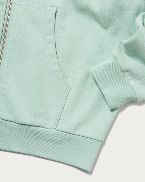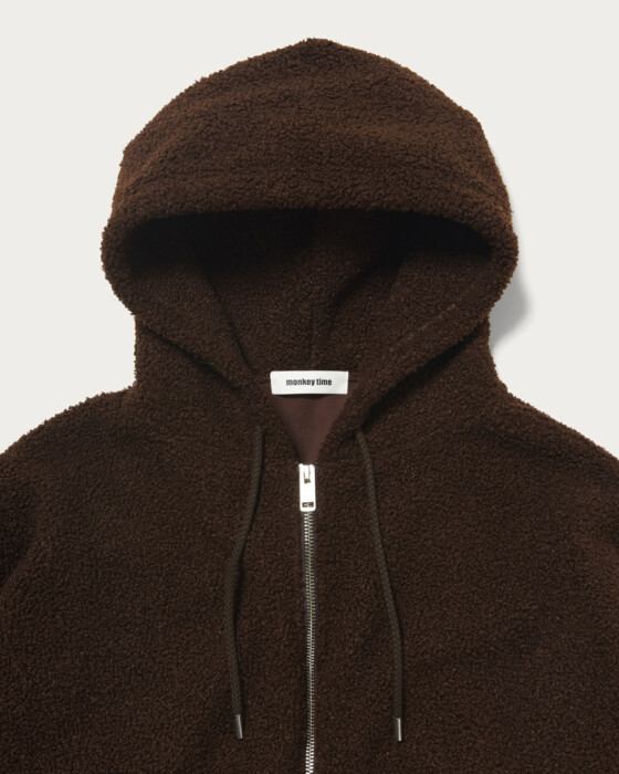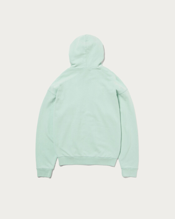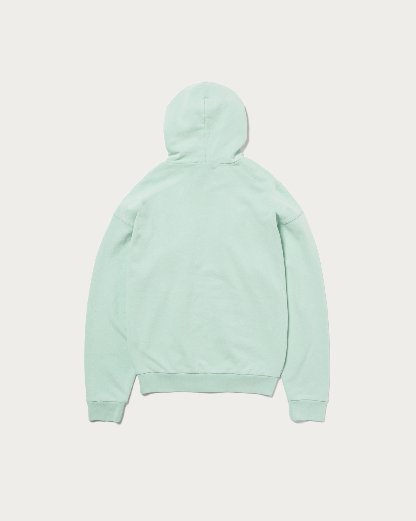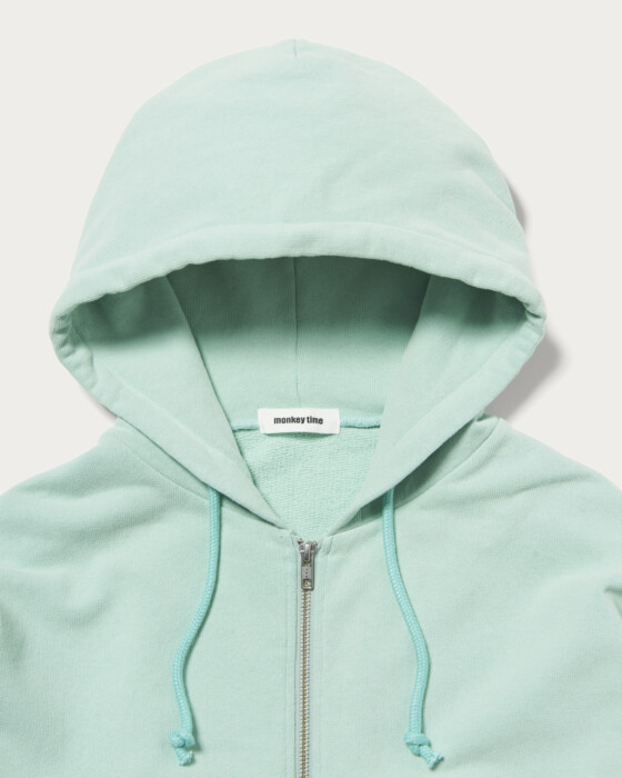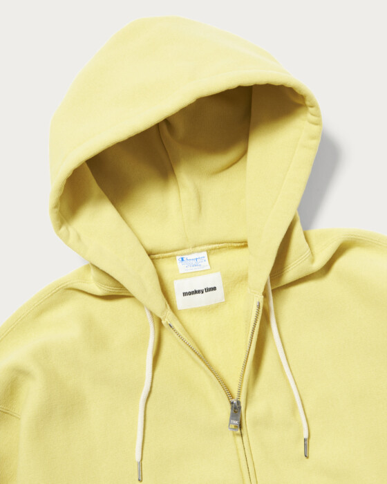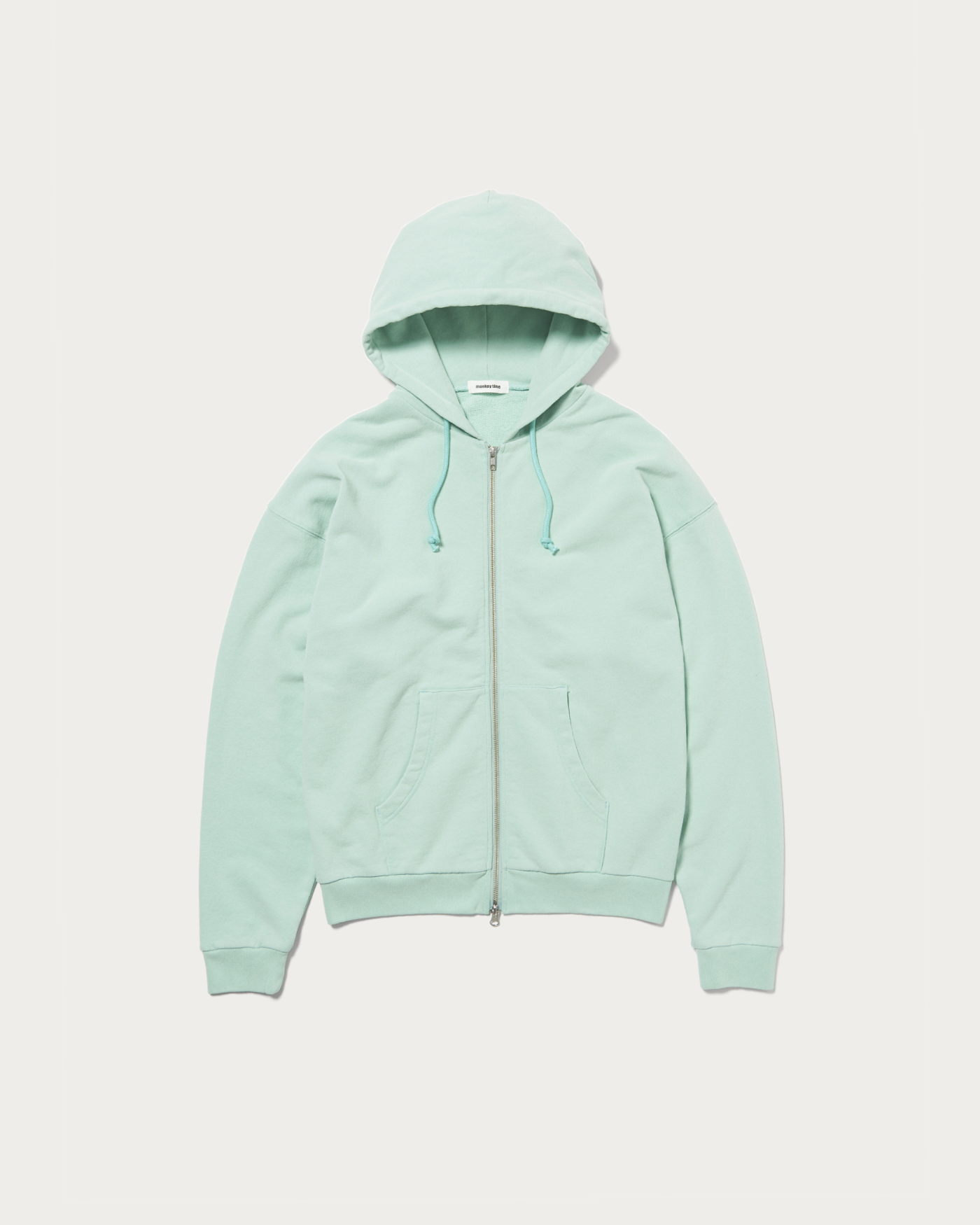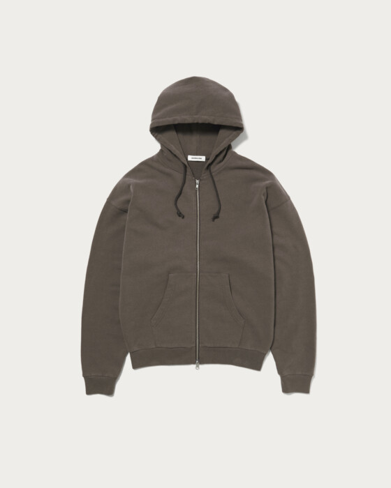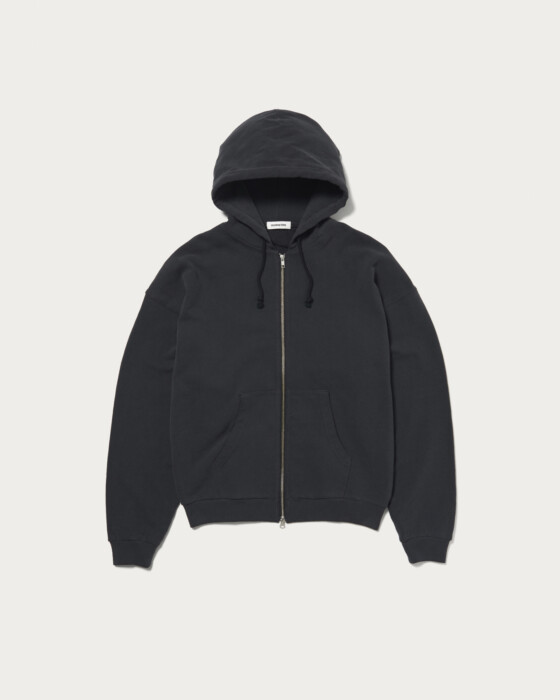 A zip hoodie made from moderately thick French terry (without brushed lining) that has been specially processed to give a faded look. In addition to the popular black, we have introduced new colors for this season: lime green and dark brown.