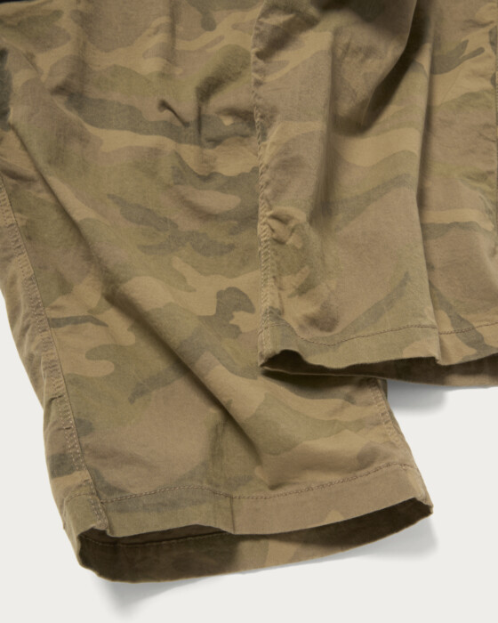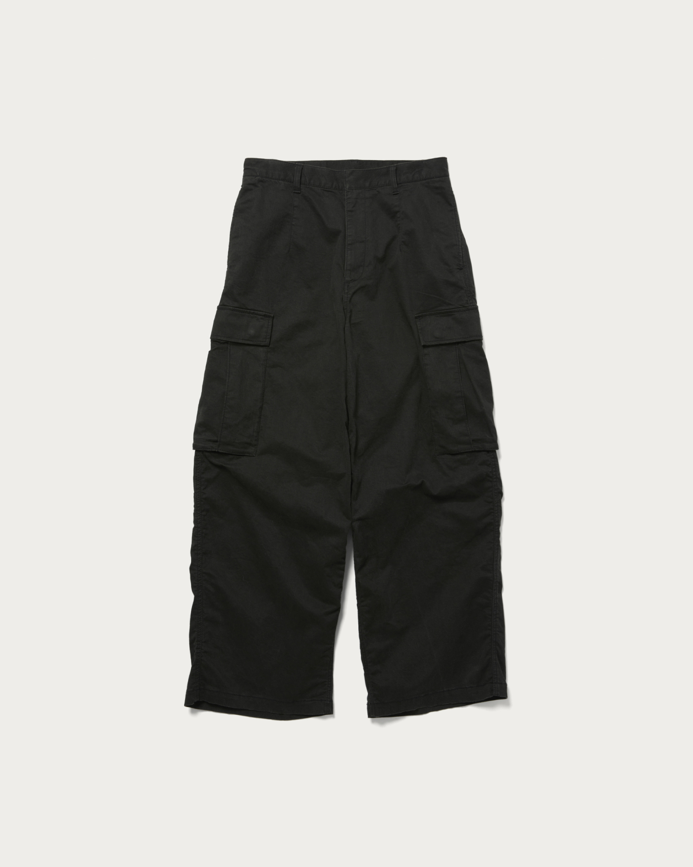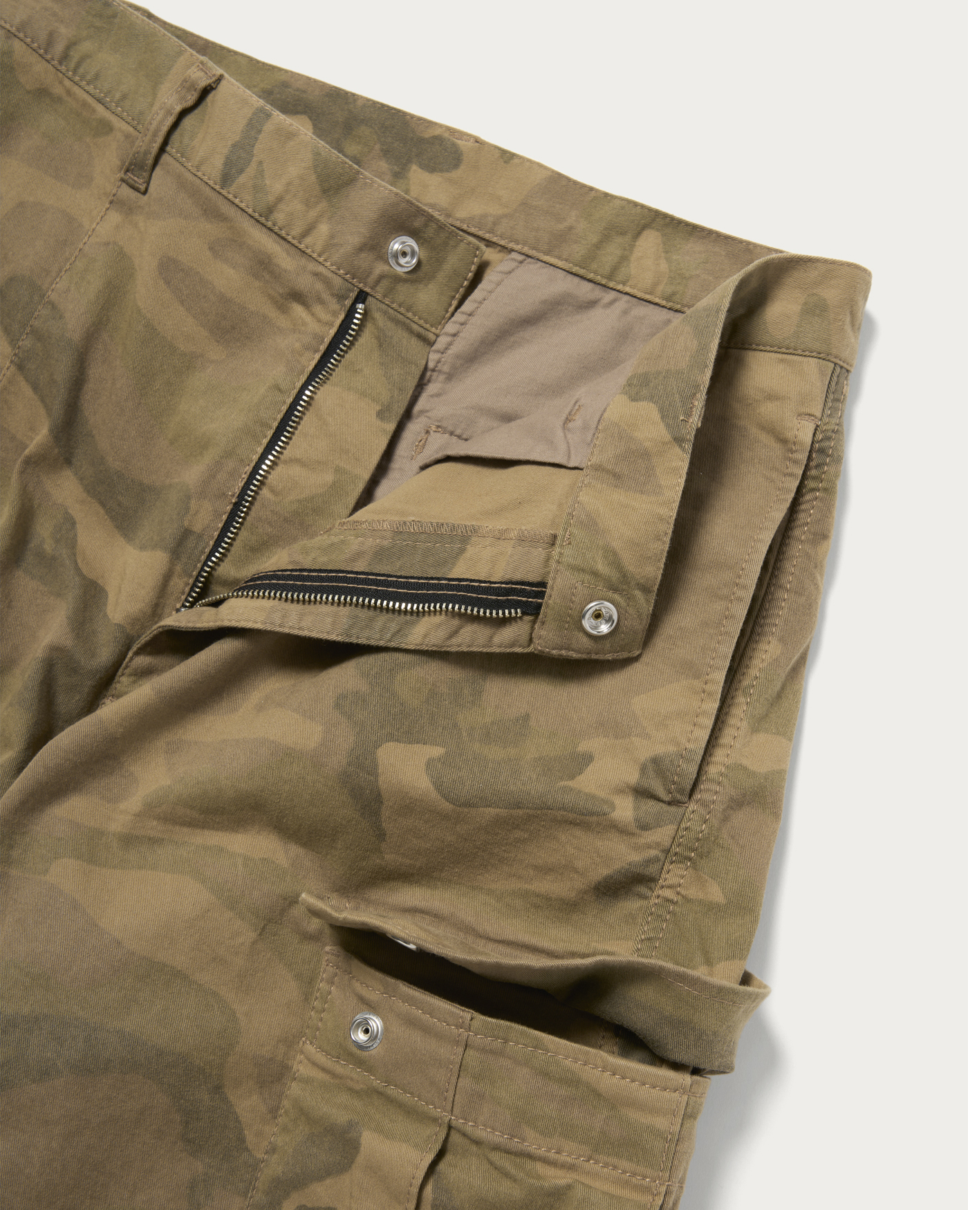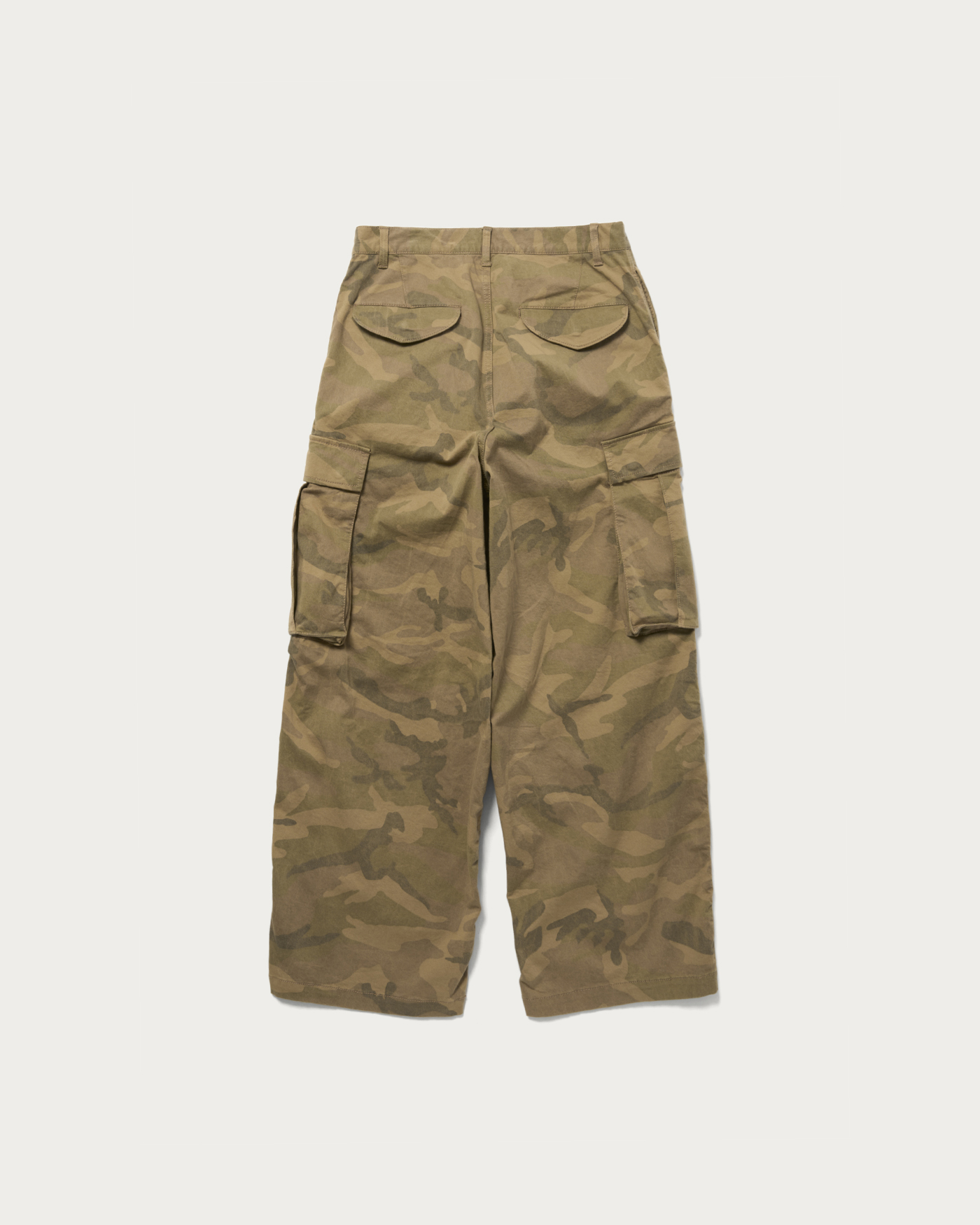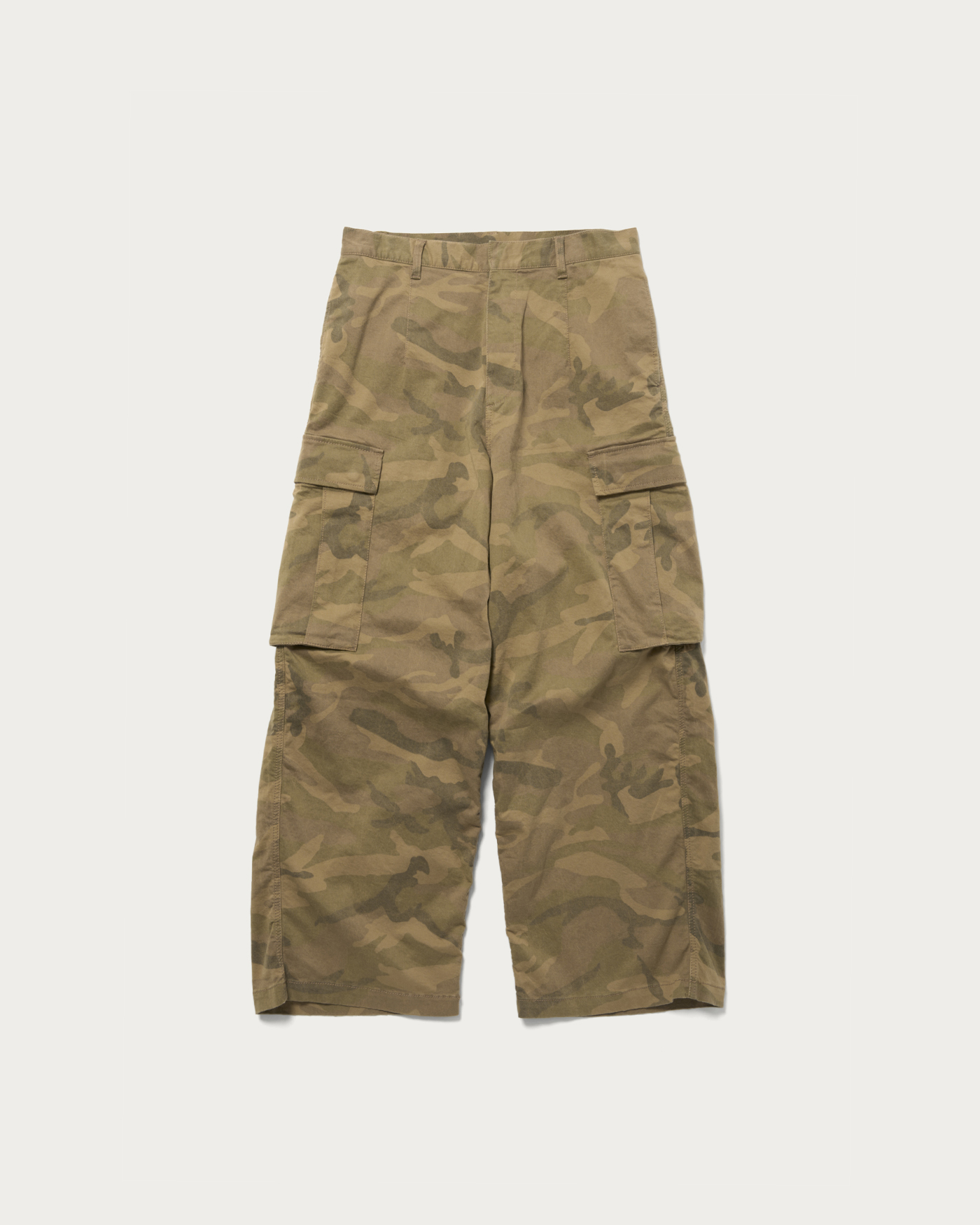 Cargo pants made from a moderately thick twill fabric, featuring a special print on the surface and a washed finish for a faded look. With a voluminous silhouette, these pants pair well with compact tops. A jacket made from the same material is also available.