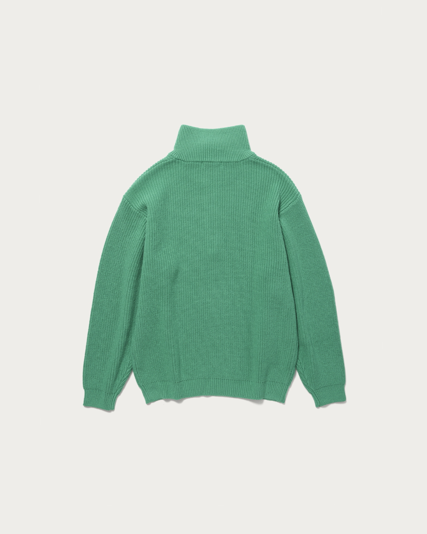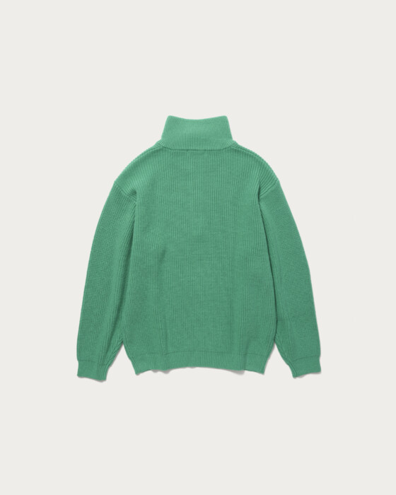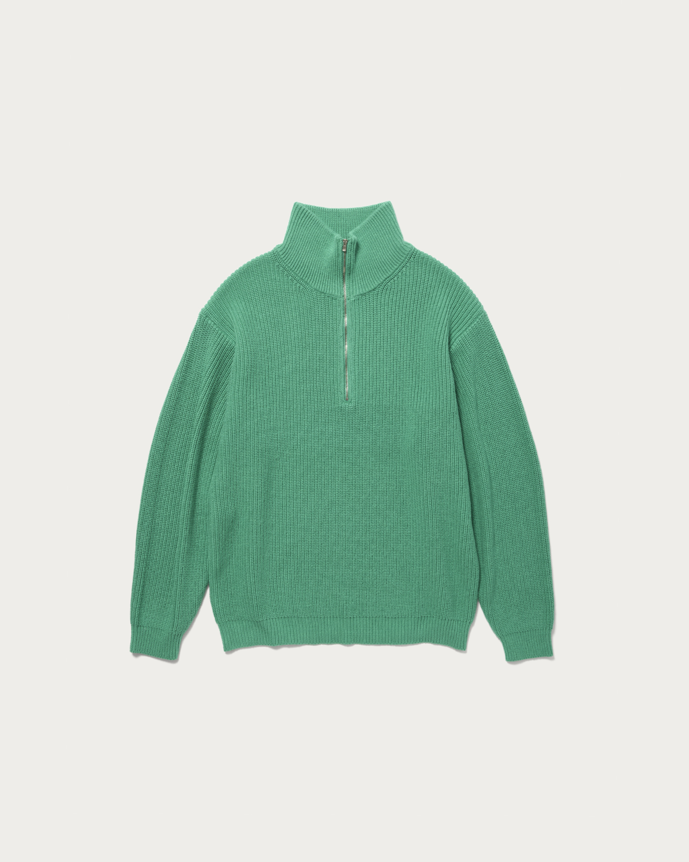A half-zip knit made with a ribbed structure using low-lint cotton/acrylic yarn. This is a staple item at Monkey Time, available in basic colors like black and dark gray, as well as a season-appropriate kelly green.