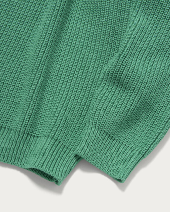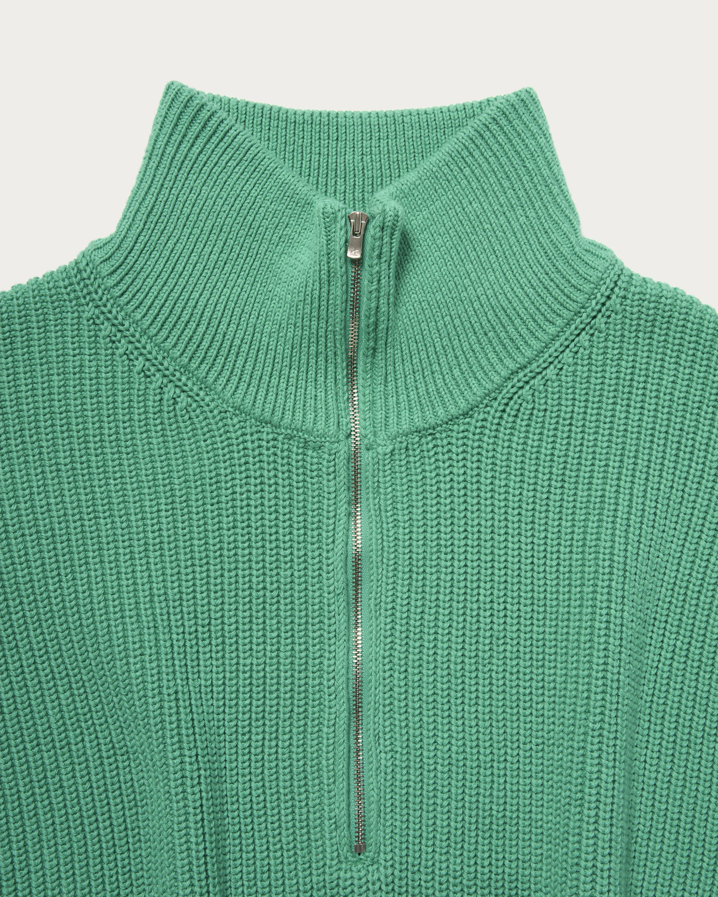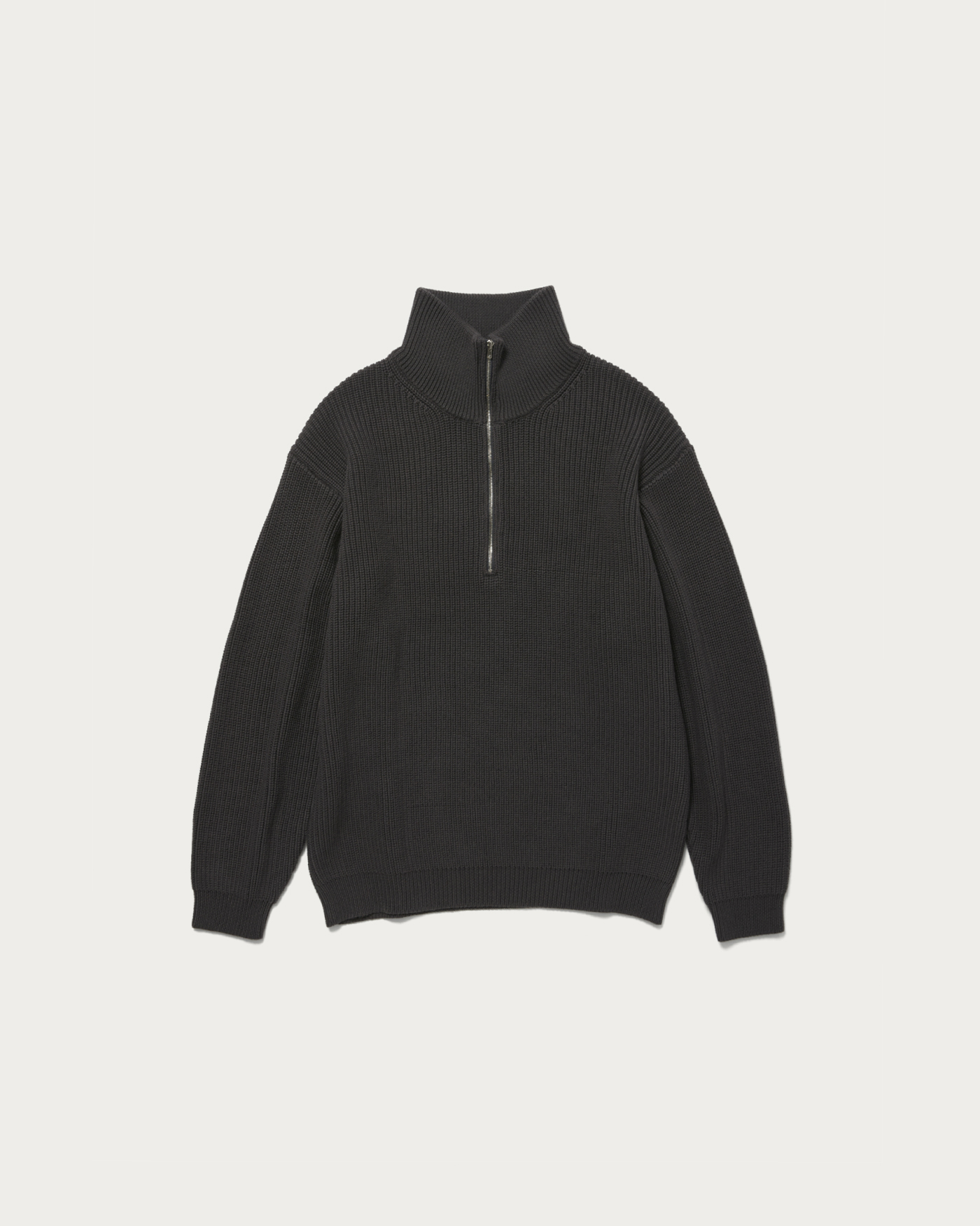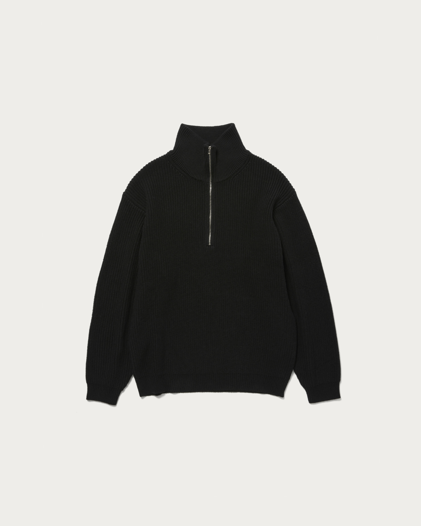 A half-zip knit made with a ribbed structure using low-lint cotton/acrylic yarn. This is a staple item at Monkey Time, available in basic colors like black and dark gray, as well as a season-appropriate kelly green.