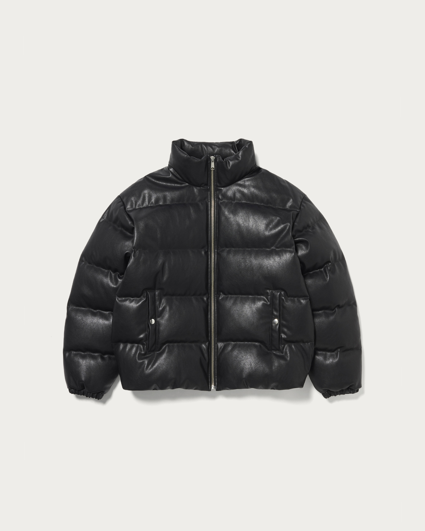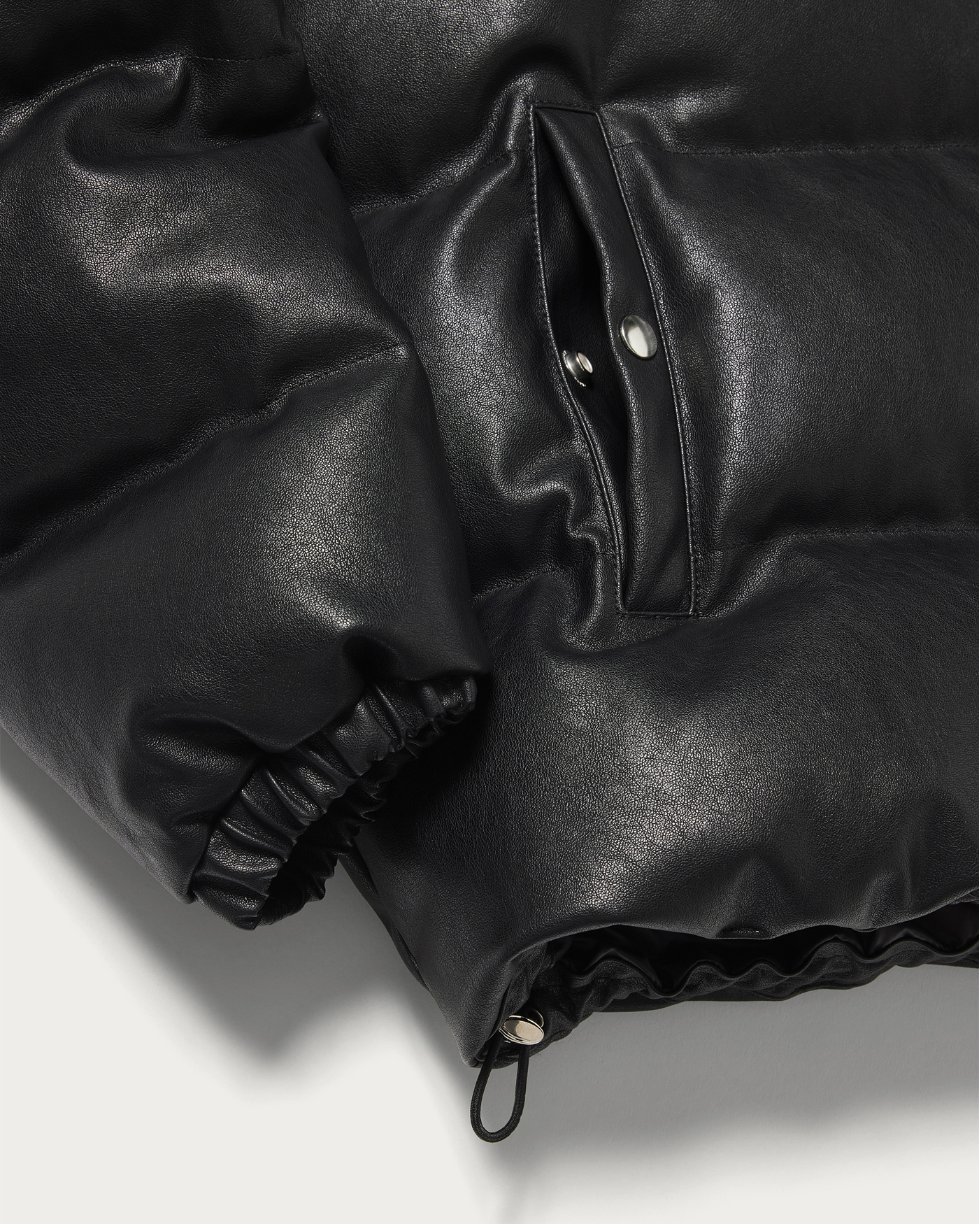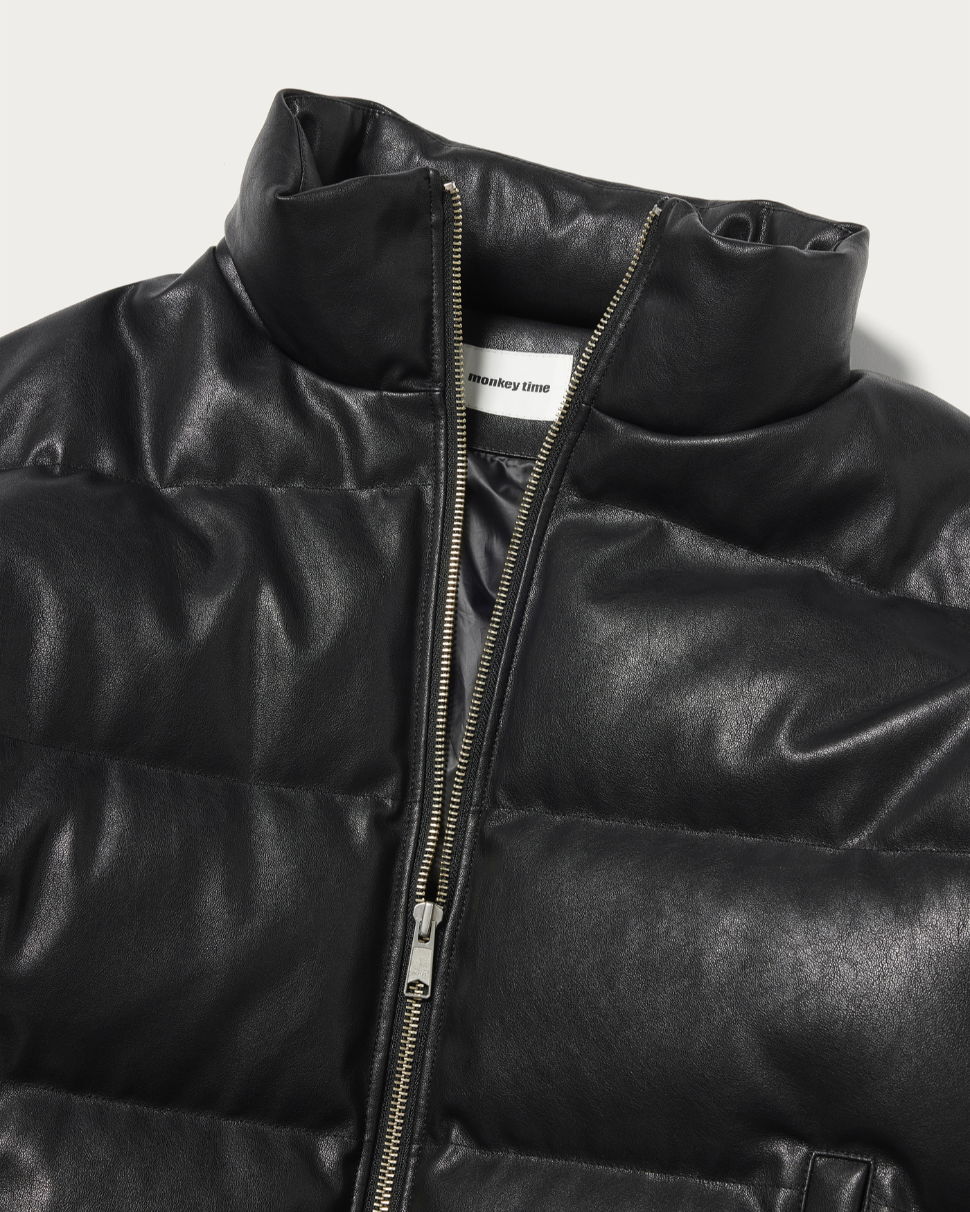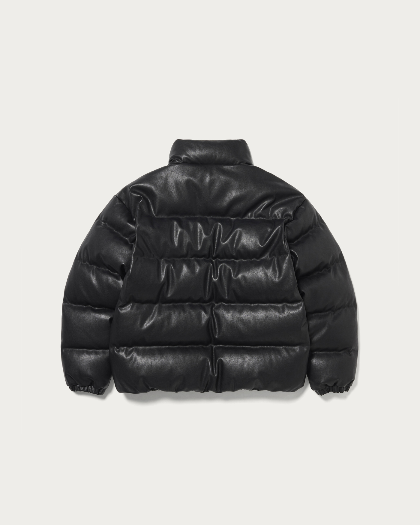 A down jacket made with leather-like material. This outerwear is designed to keep you warm by securely enclosing the down, while also providing a stylish lift in appearance. In addition to last year's popular black, this season we are also offering a new color: dark brown.