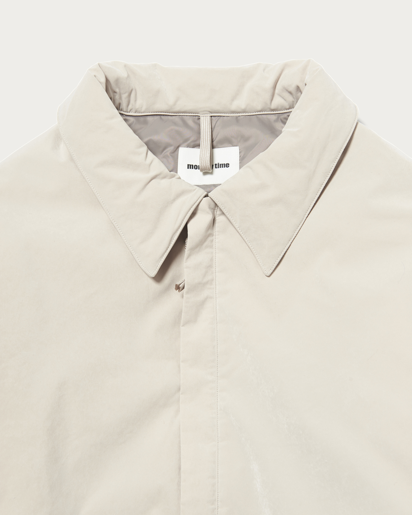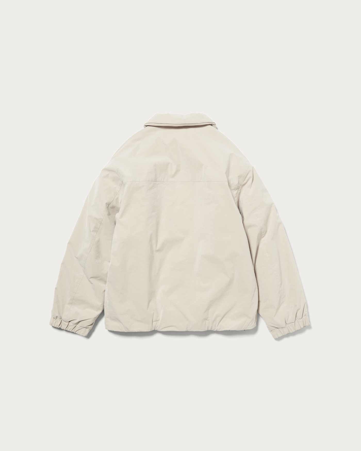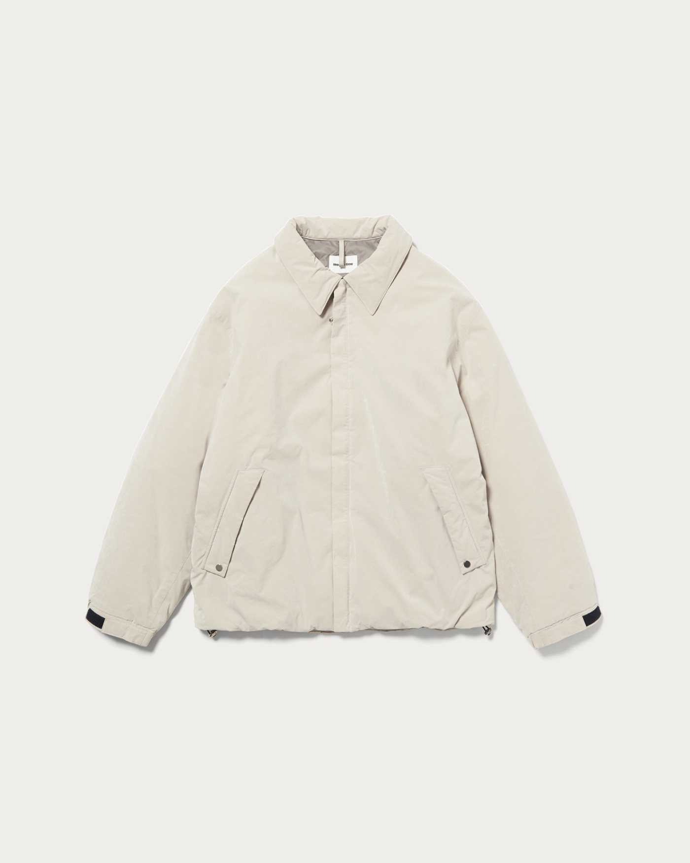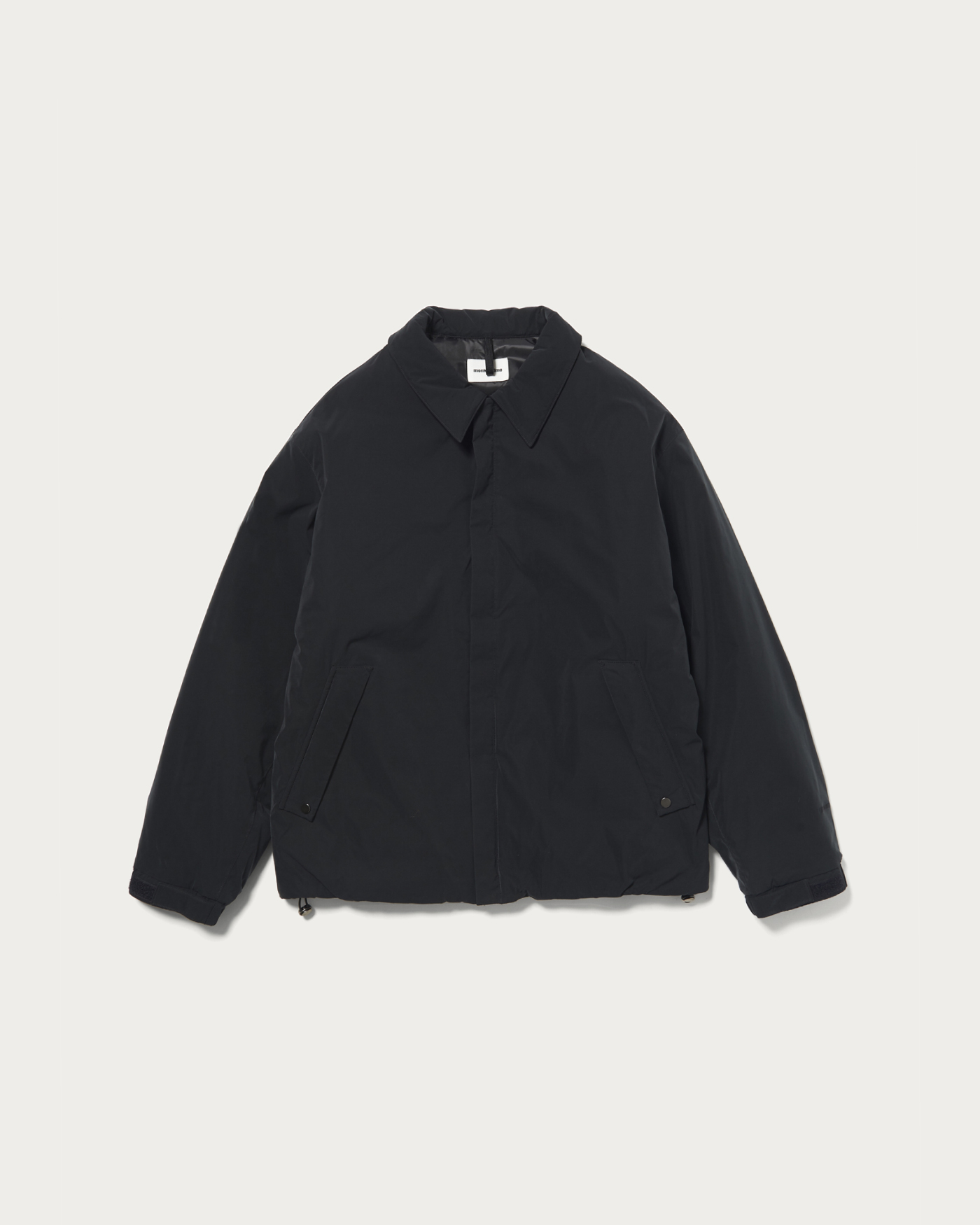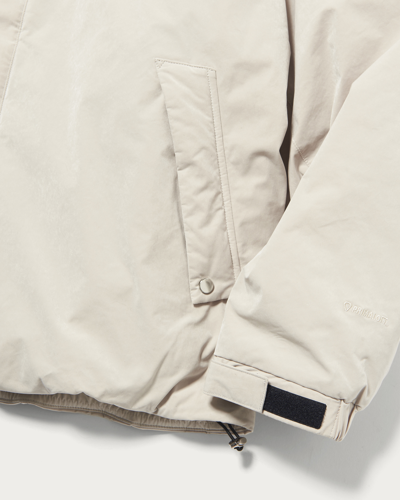 This is a cold-weather jacket made from a refined taffeta material that features a lightly brushed finish and water-repellent treatment on the outer fabric. It uses PRIMALOFT® BLACK INSULATION for the padding. Unlike typical outdoor gear, this item is designed for urban use. The inside of the collar contains a magnet, allowing it to be styled as a stand-up collar. Additionally, by tightening the stretch cord at the hem, you can reduce wind penetration and enhance warmth.