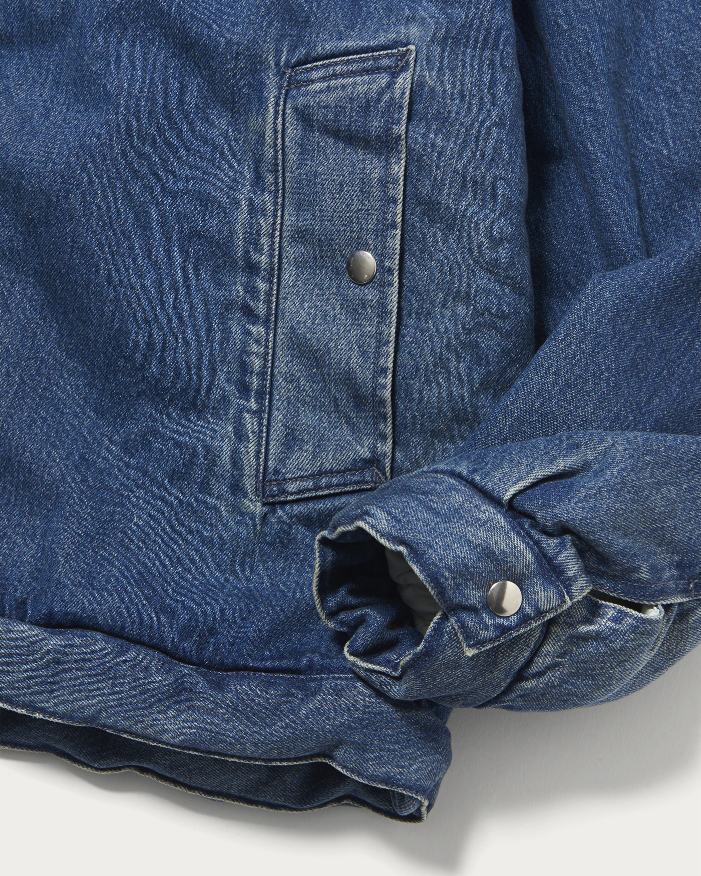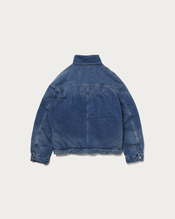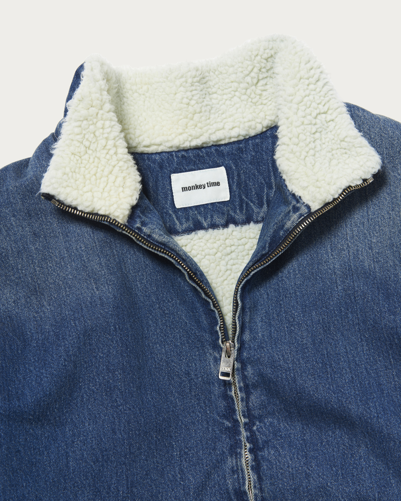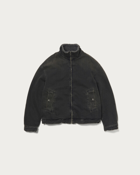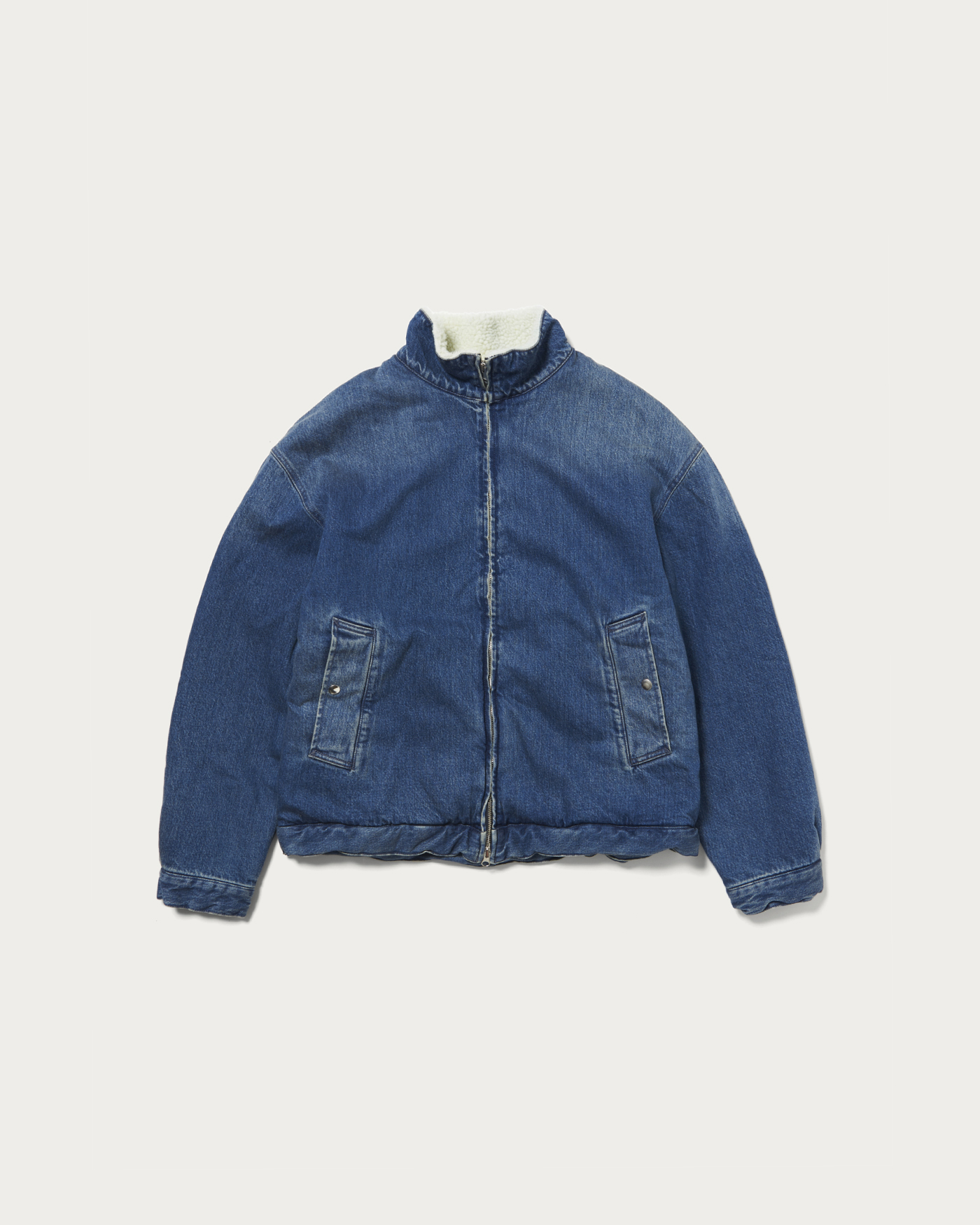 A cold-weather jacket featuring a denim-like texture and a sturdy ounce denim on the exterior, with a boa lining on the interior. It has a simple stand-collar design, making it a casual item that pairs well with refined bottoms like elegant slacks.