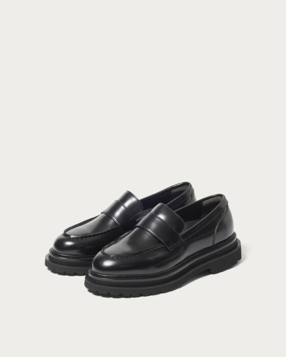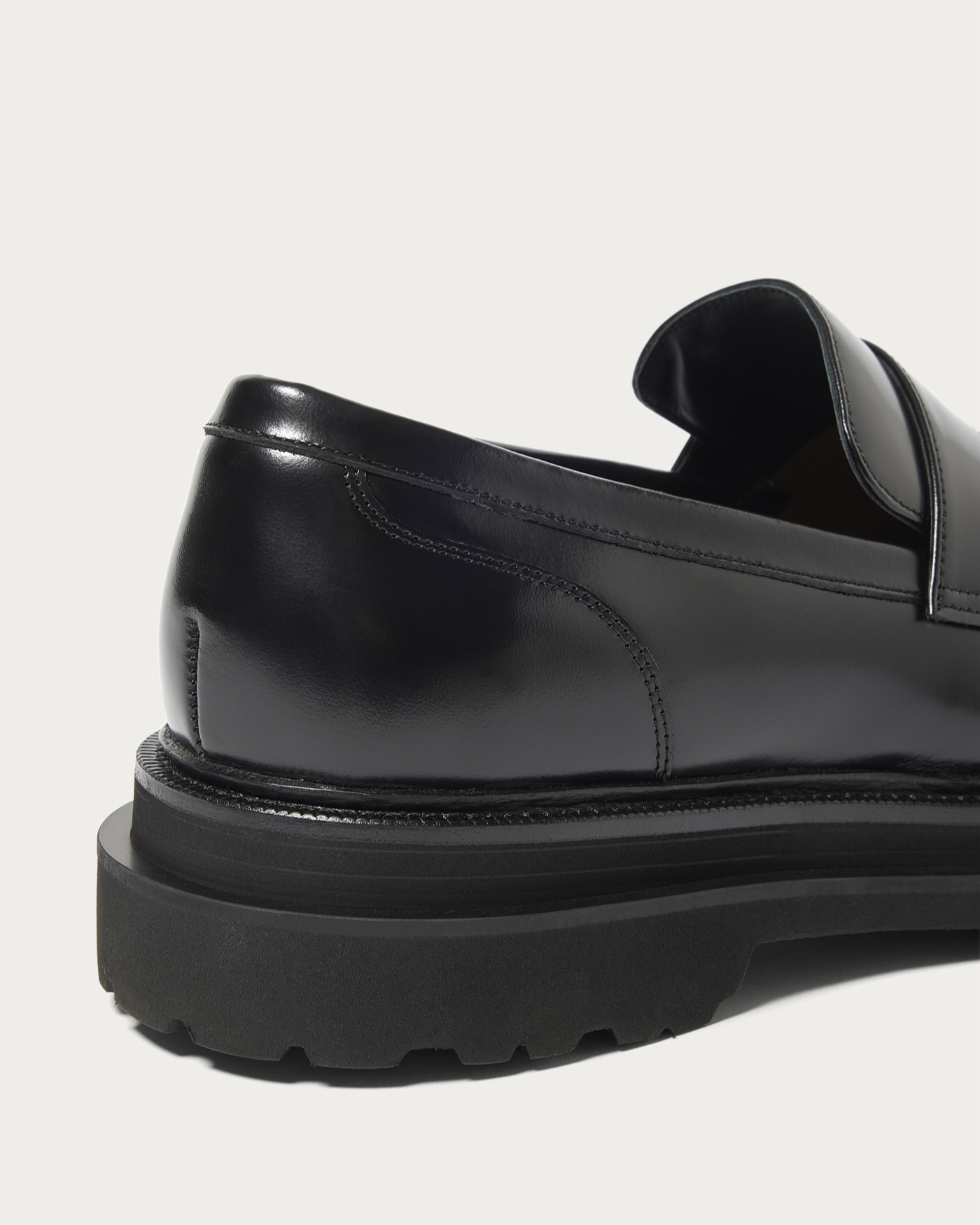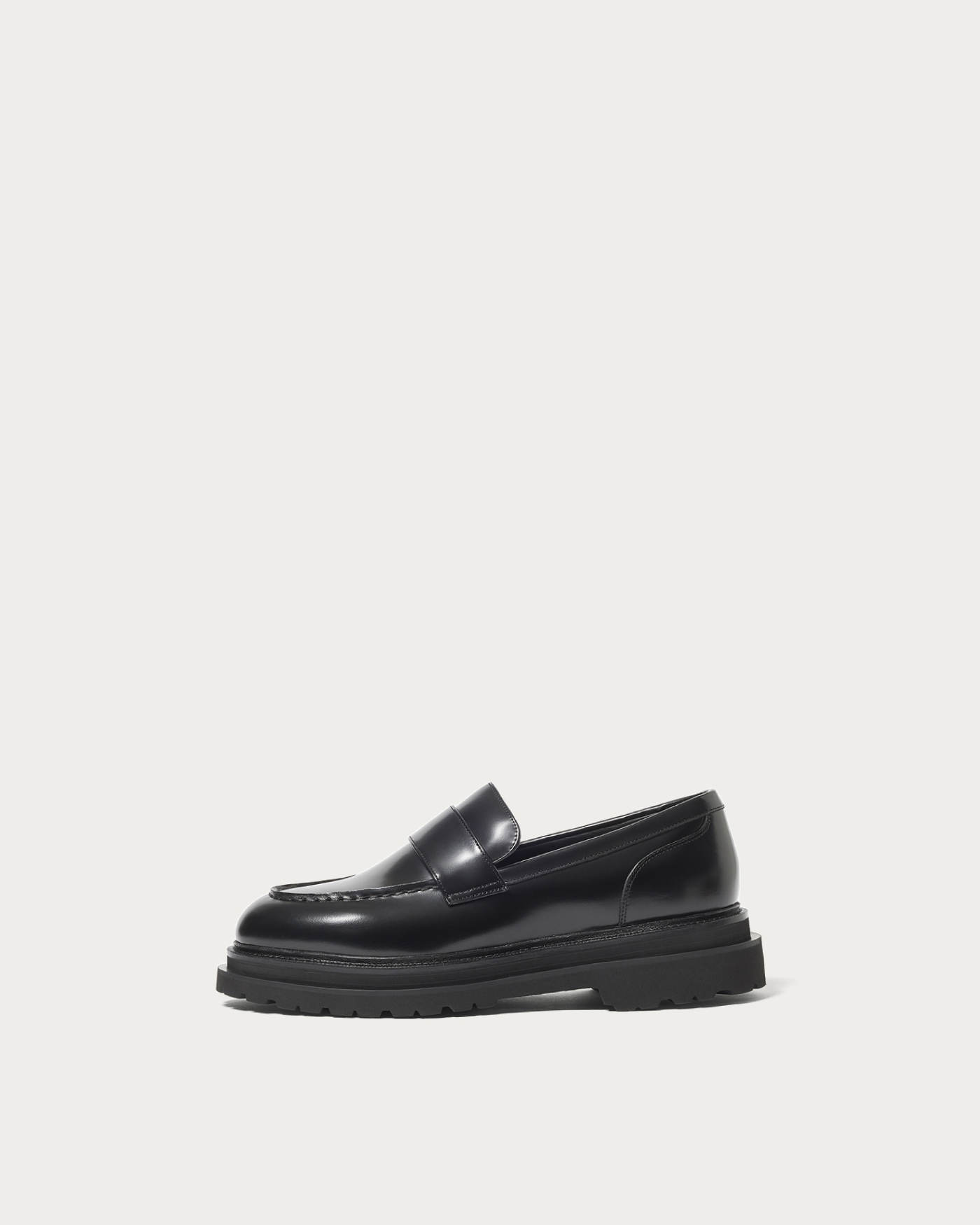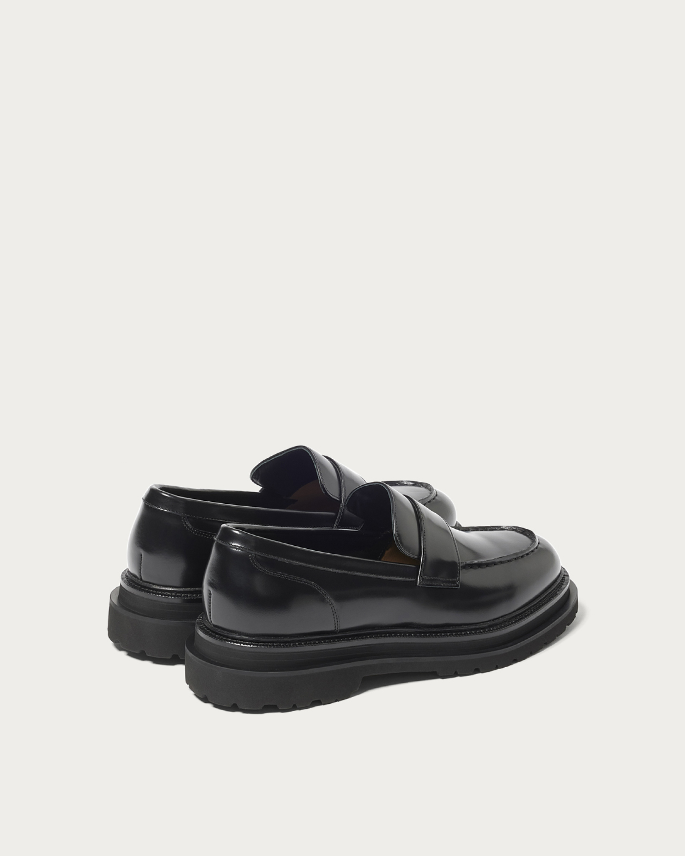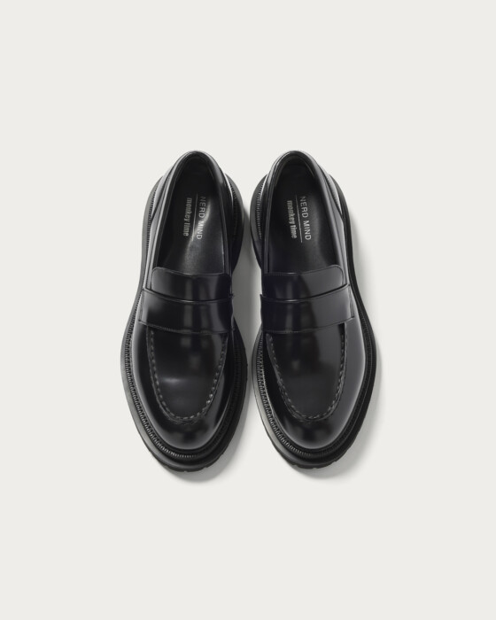 This is a custom loafer based on the popular "DUE" from the domestic leather shoe brand 〈NERD MIND〉's inline collection. The interior color is black, and the upper design has been partially modified to create a more solid look. The insoles feature the logos of both brands engraved in silver.