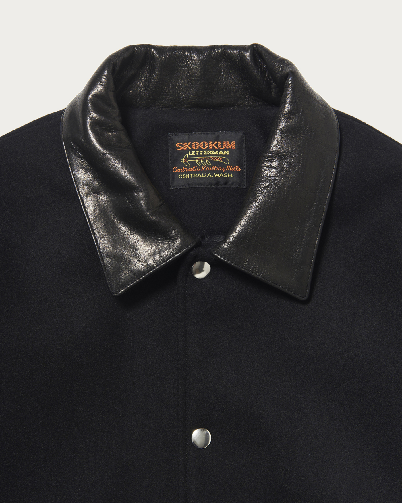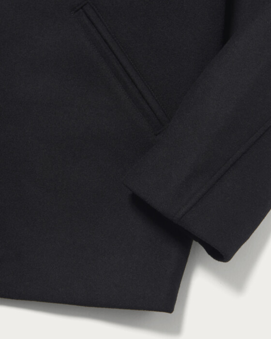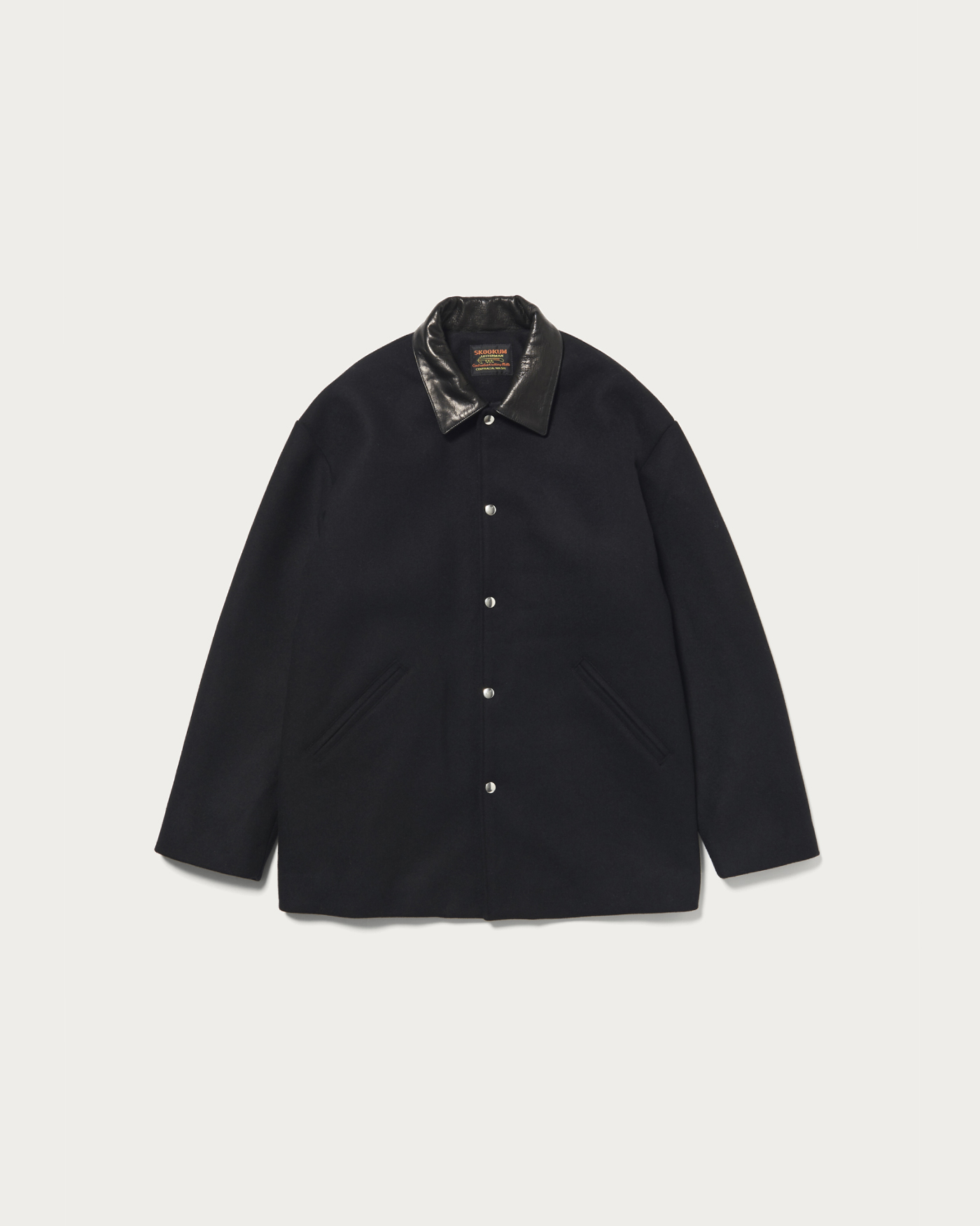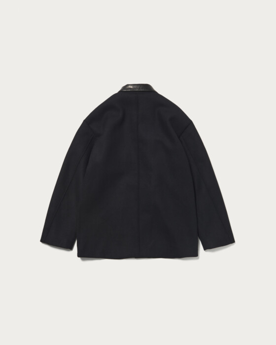 A custom outerwear piece designed based on the SKOOKUM car coat. The material is a refined and soft melton, and by incorporating a cow leather collar, it has been elevated into an elegant casual outerwear.