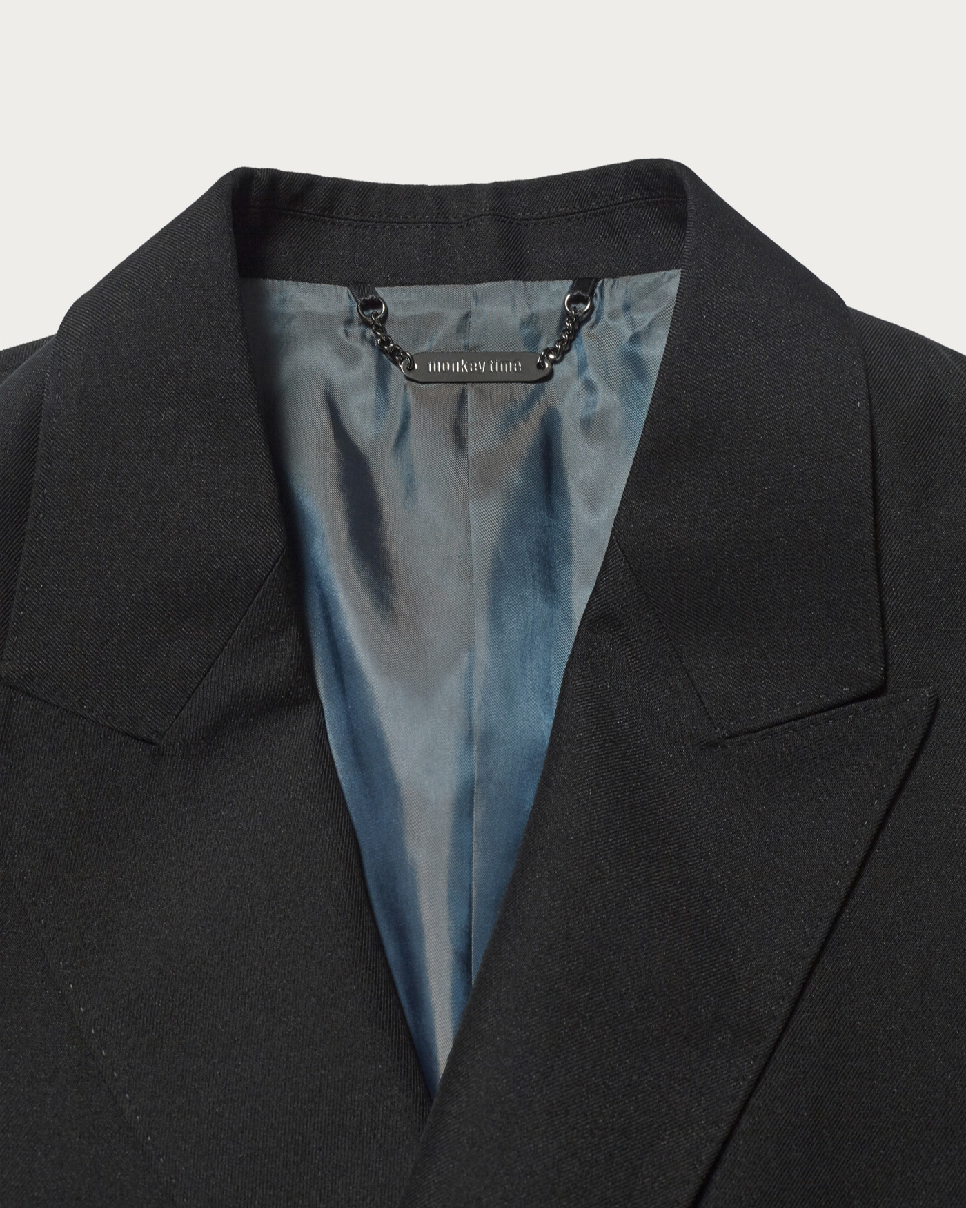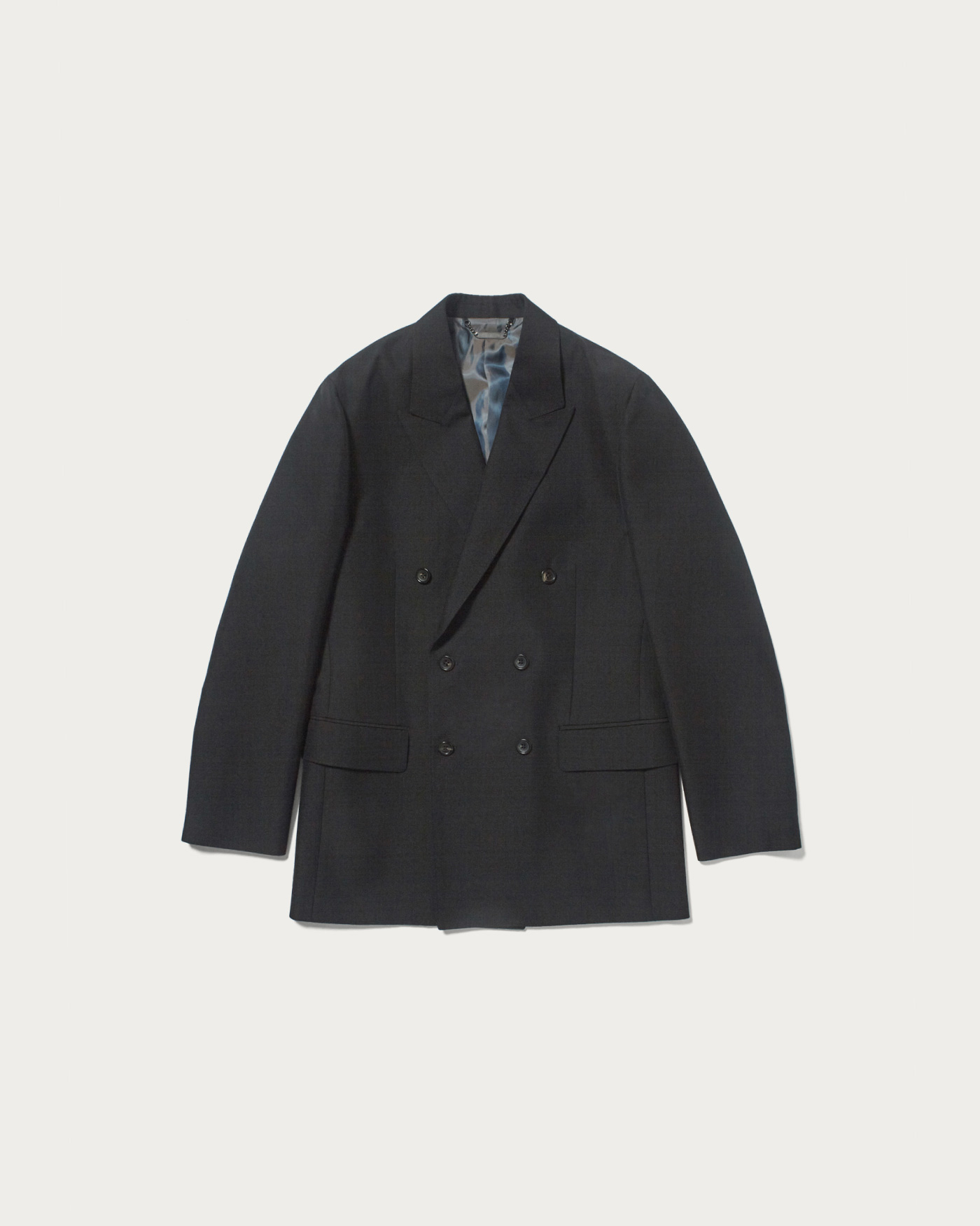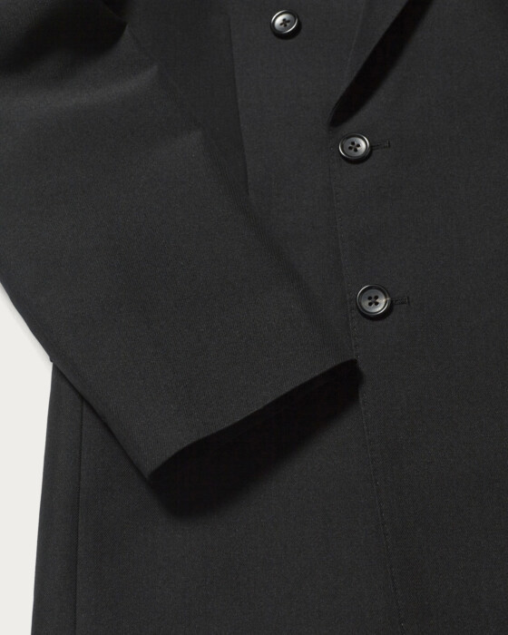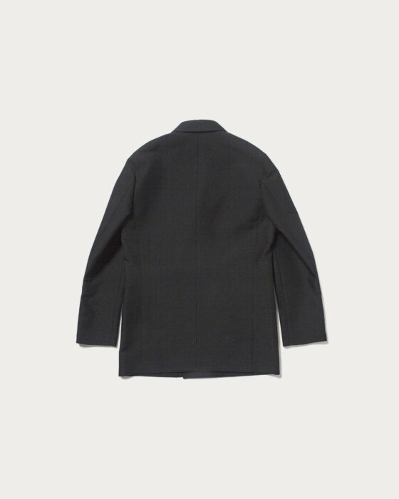 A double-breasted jacket made from an original fabric that combines wool and polyester twill, specially processed to achieve a moderate sheen and firmness. There are also bottoms available made from the same fabric.