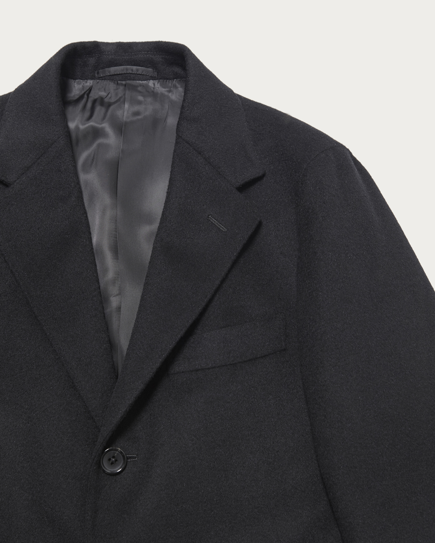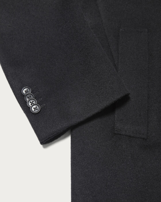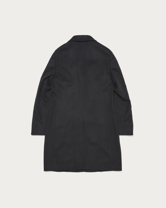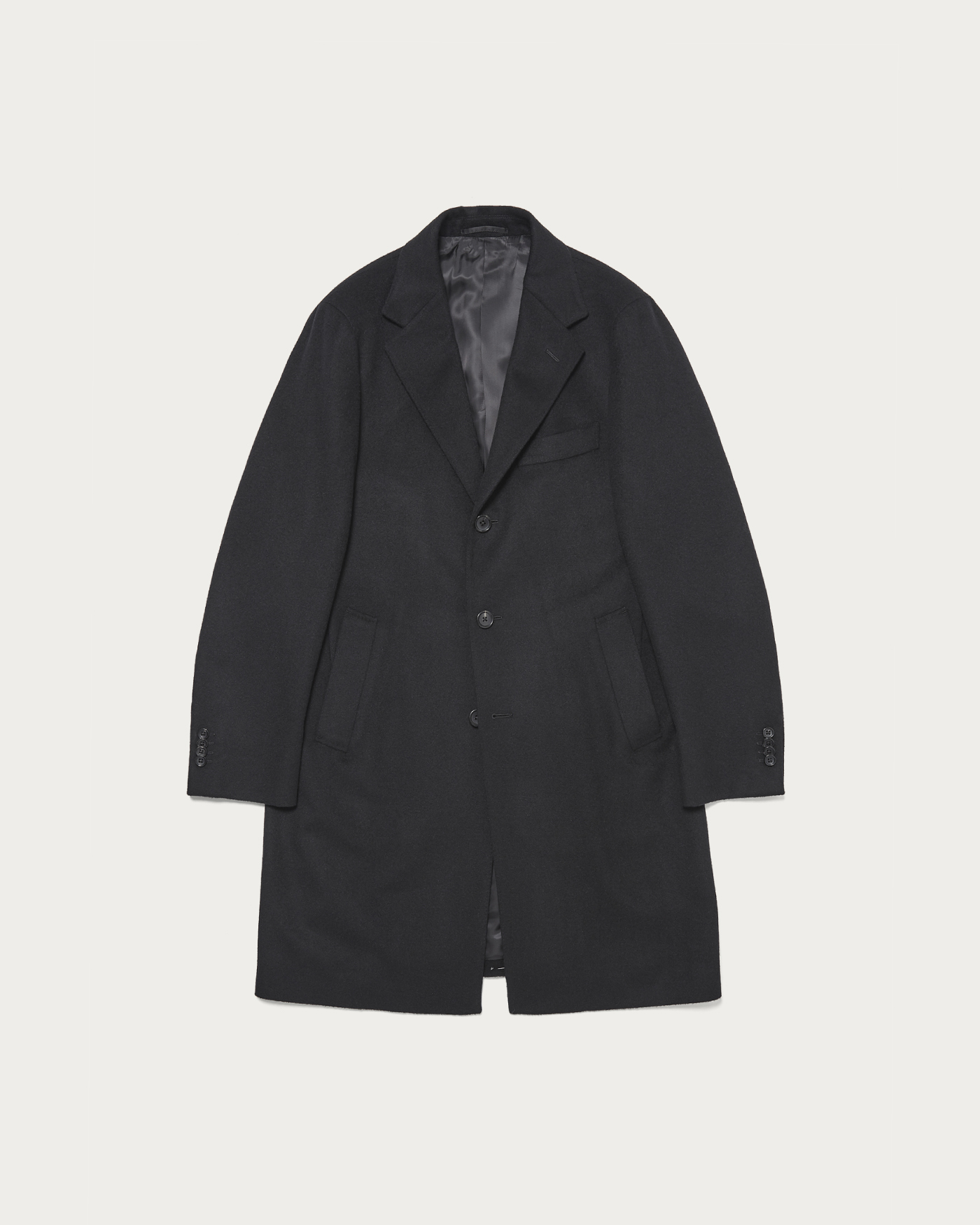 Chesterfield coat with a three-button design and a stepped lapel. It features a rounded natural shoulder line, a natural waist shape, and a beautiful A-line that flares out towards the hem. This coat combines masculinity and elegance, presenting a soft, modern classic appearance. The material is a wool-cashmere short beaver fabric. It has a texture that is not too long-haired or overly dressy, making it an excellent choice for everyday use with its high-quality feel. The cashmere blend provides a supple touch, high thermal insulation, and a dignified luster.