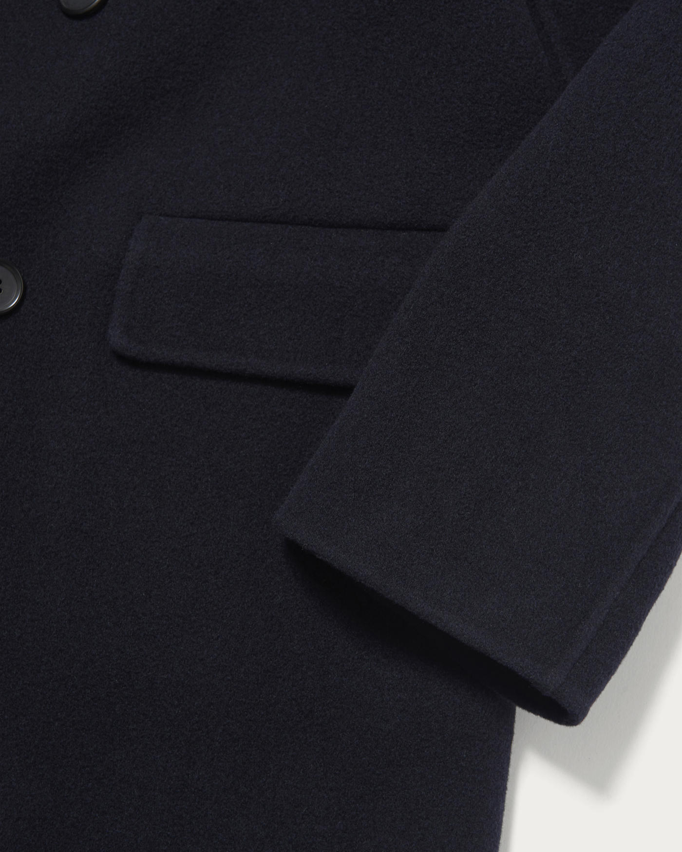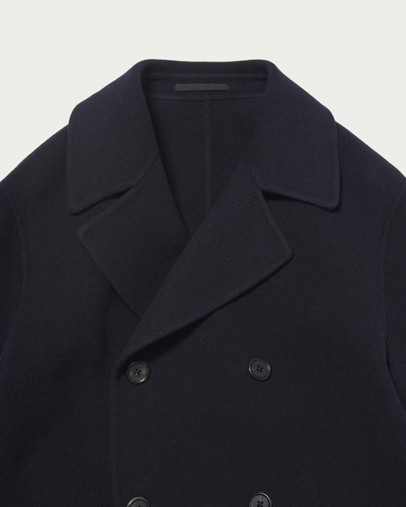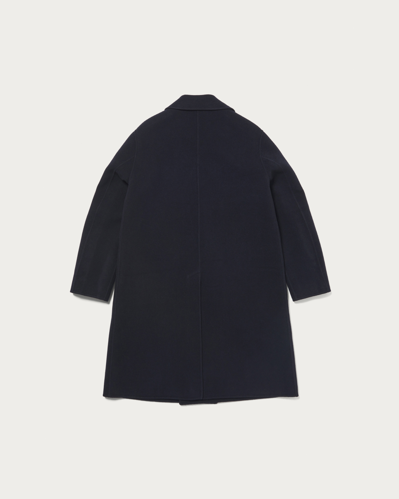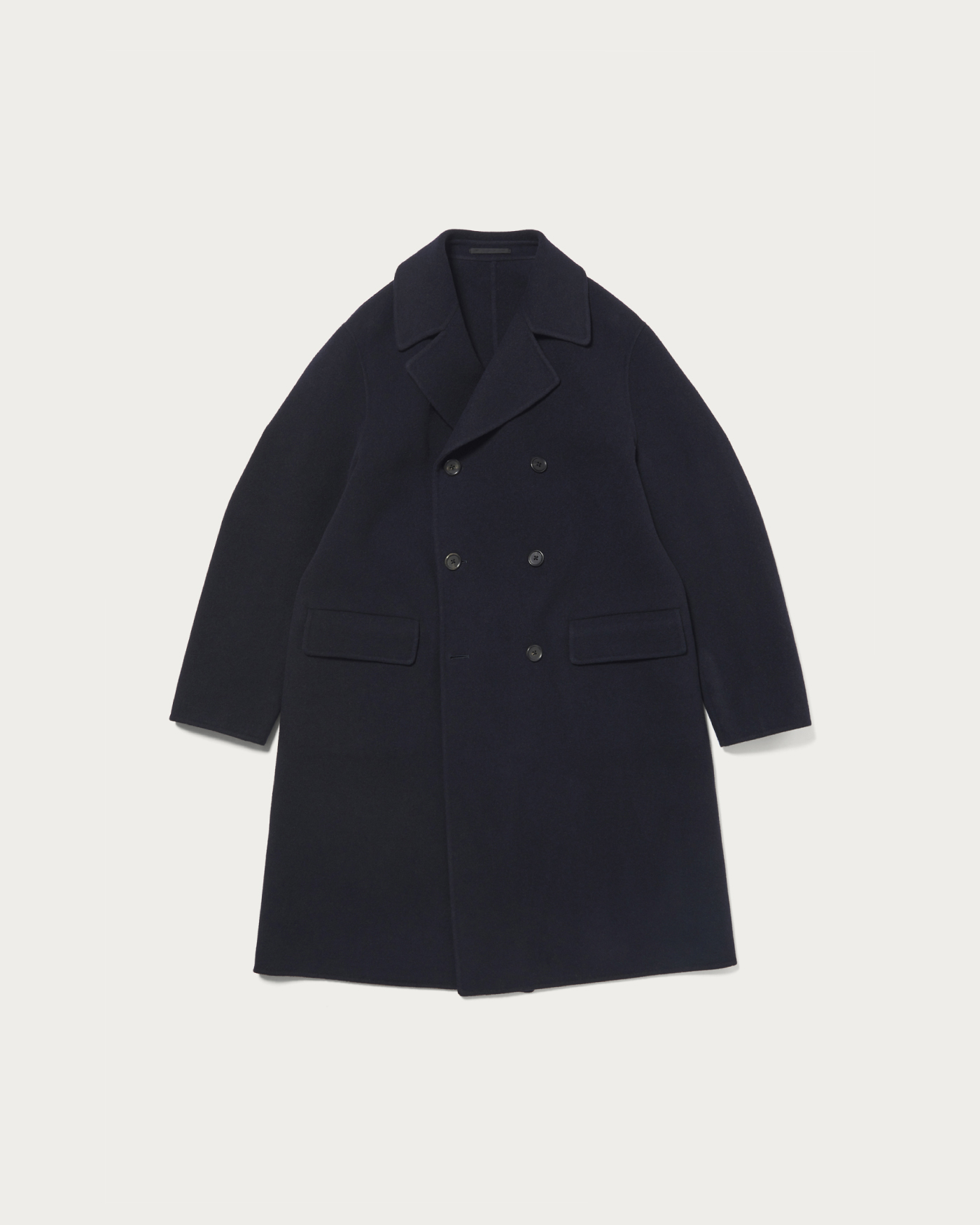An Ulster coat made from a wool-cashmere double-face fabric. Crafted with reversible stitching, it offers a soft, elegant appearance and a lightweight feel despite its thickness. The coat takes the classic look of a polo coat and, through reversible tailoring, gives it a modern and lively impression. The material is a double-face fabric, woven by bonding two layers into one. By blending cashmere, it achieves both a voluminous thickness and suppleness, and the velour finish provides a soft and warm texture.