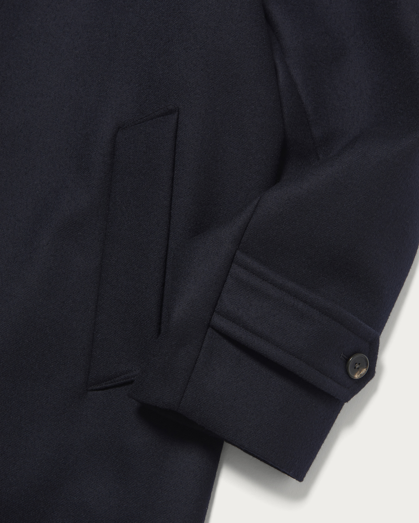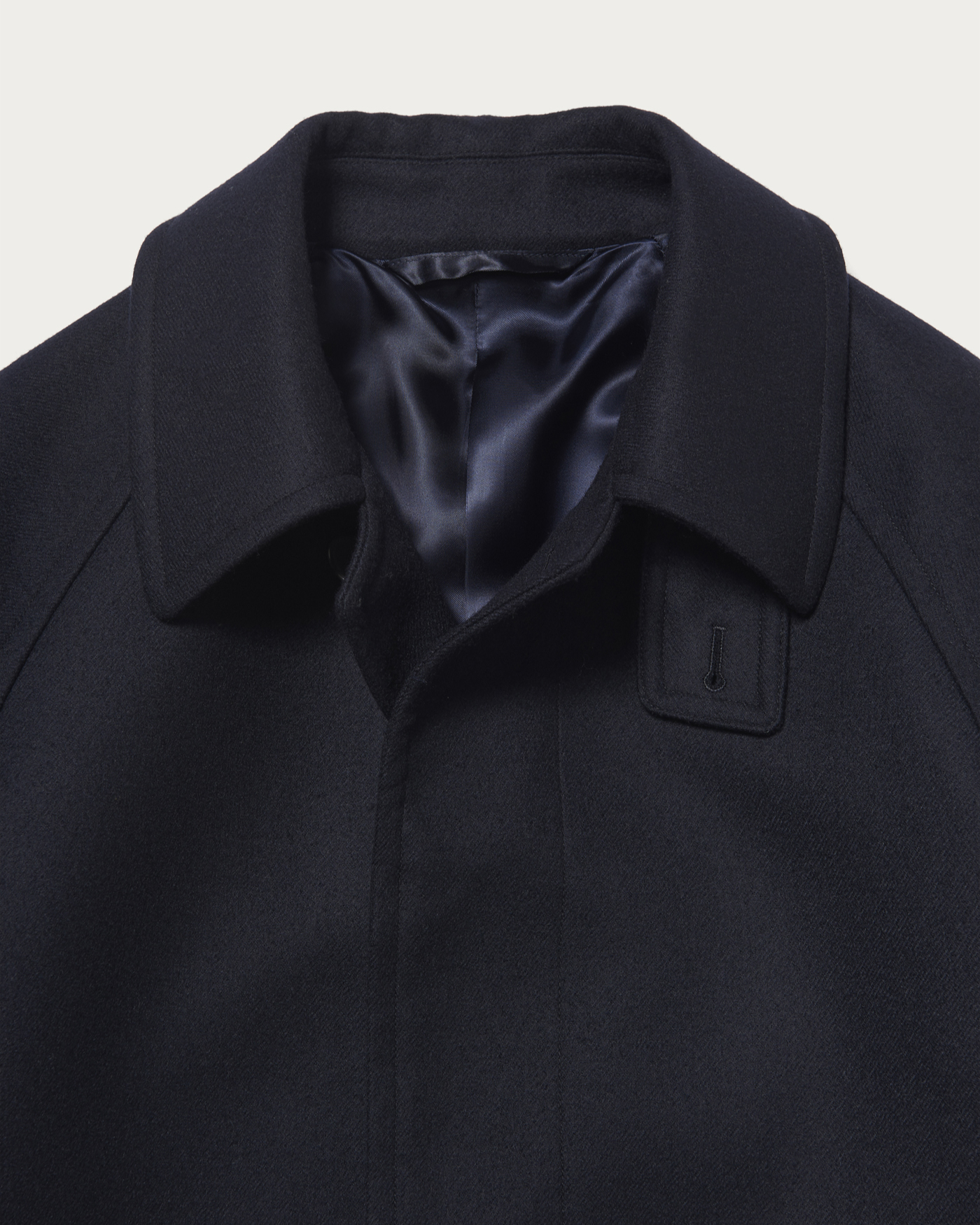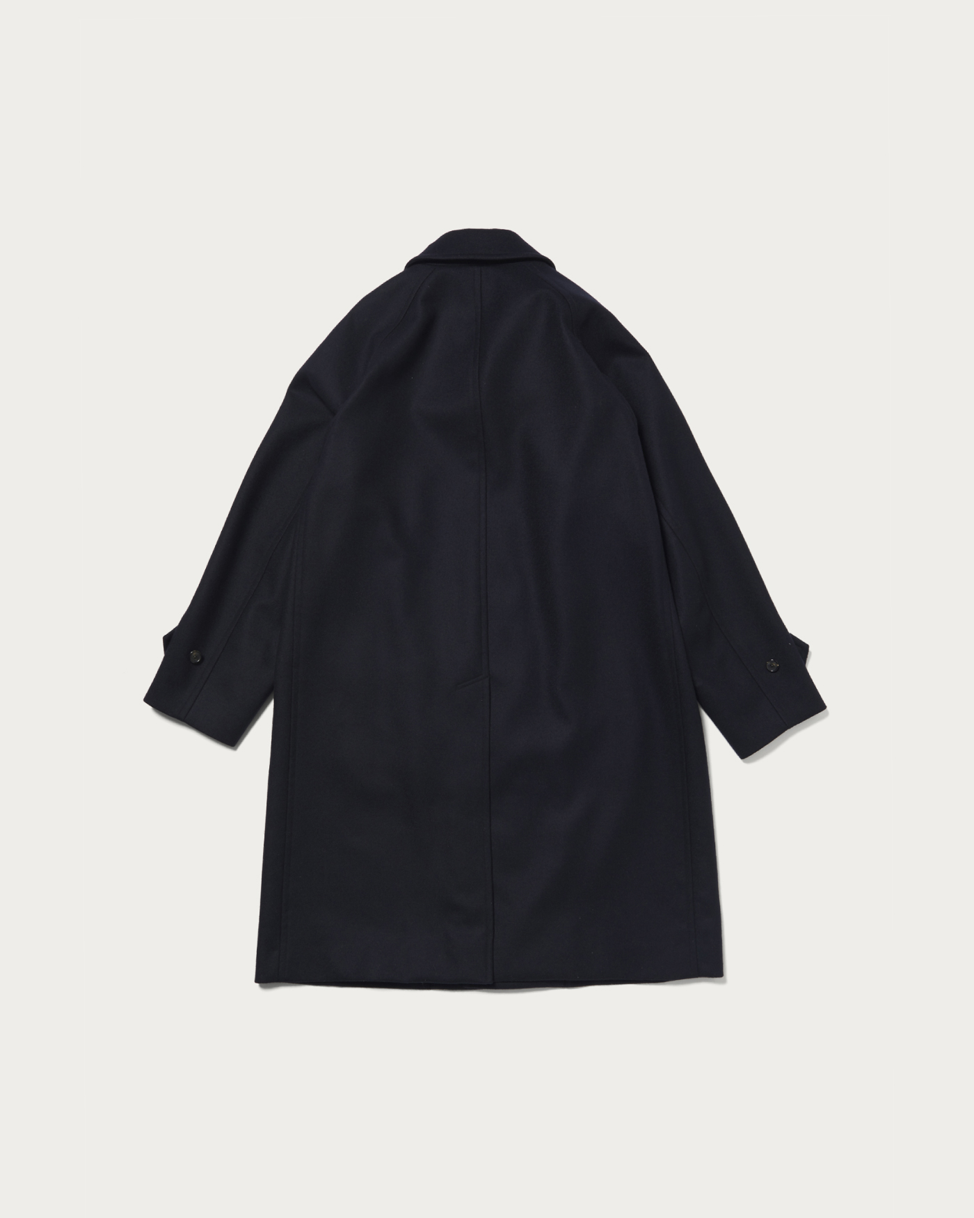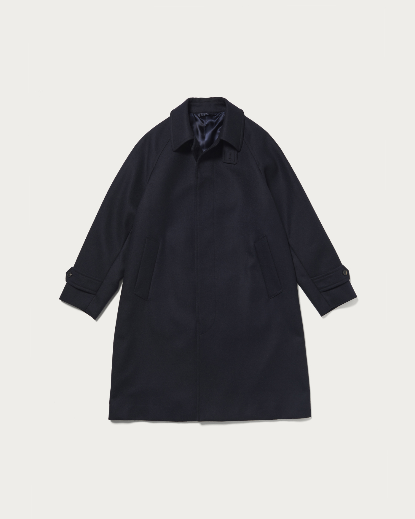 The classic Balmacaan coat has been updated this season with a melton fabric that boasts a wonderful texture. This versatile piece is suitable for a variety of occasions, whether on or off duty. This season, the coat length has been set slightly shorter for a more lively impression. Its lightness when worn and beautiful drape are also appealing features.The material used is a high-quality melton with no nap. While woolen yarns are typically used, this coat is finished with fine worsted yarns, achieving a natural sheen and suppleness. It is crafted to be soft yet resilient, providing a light and comfortable wearing experience.