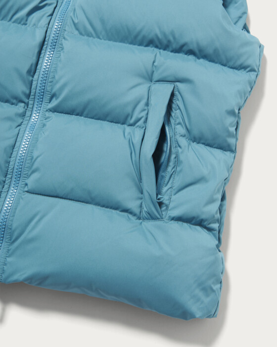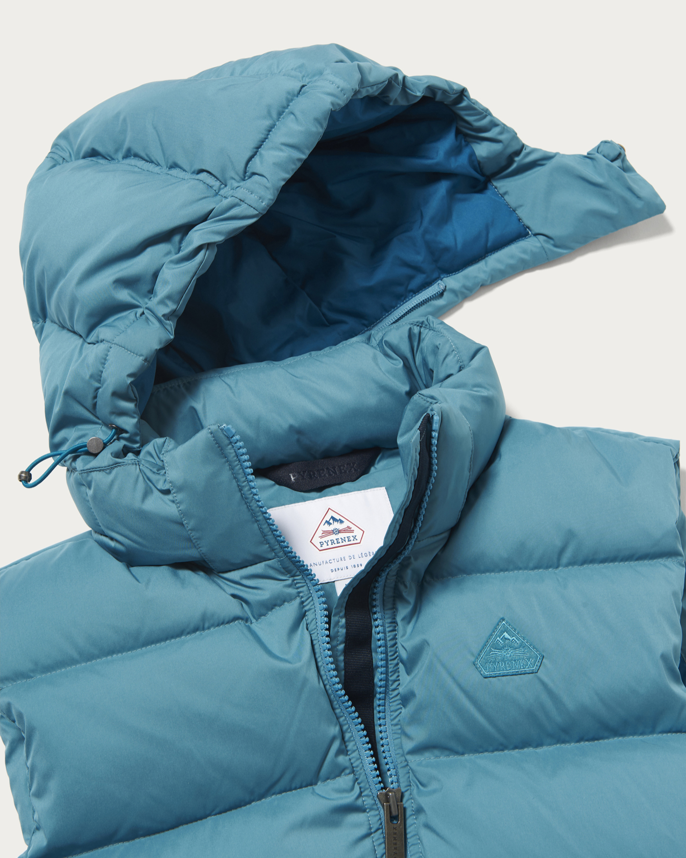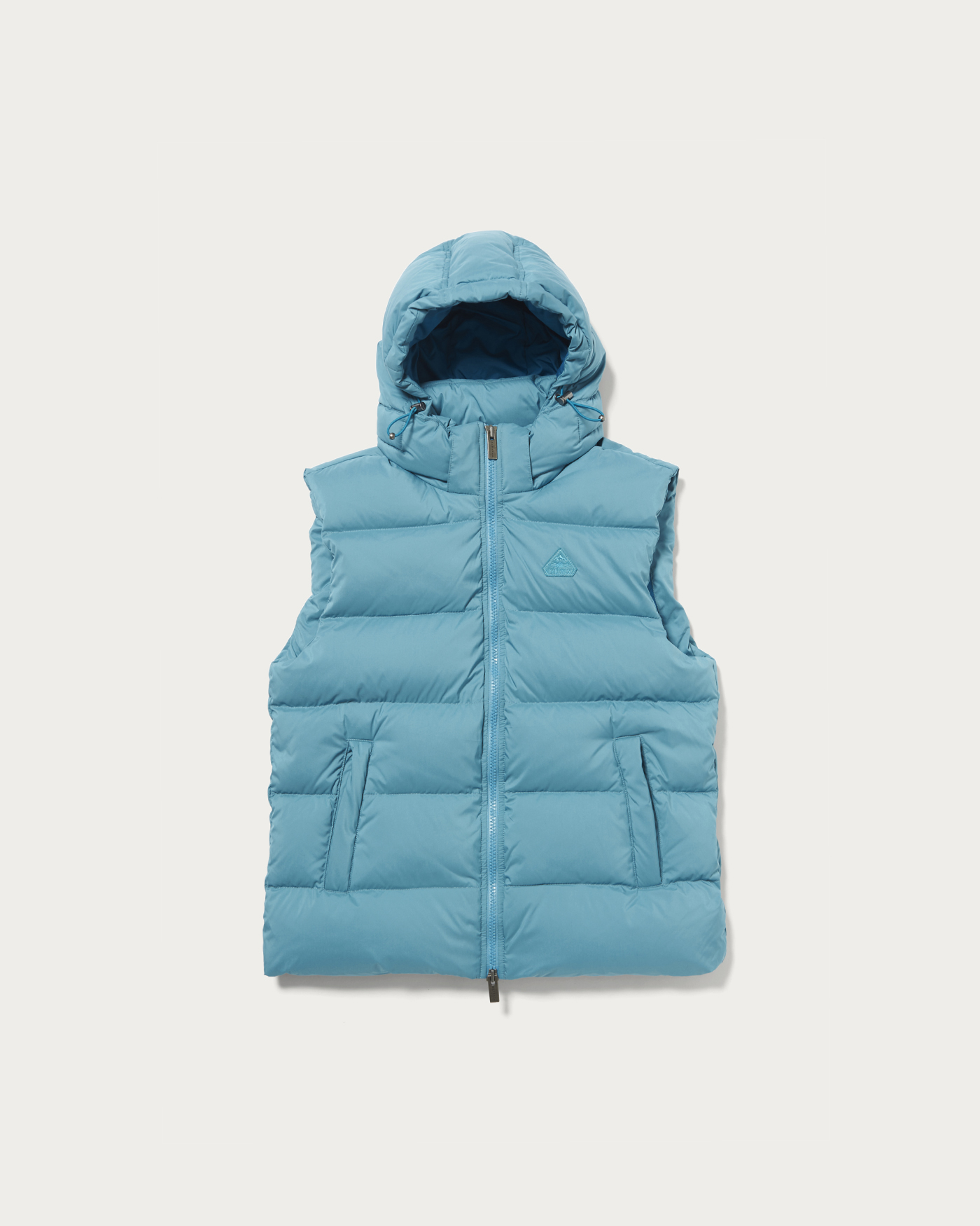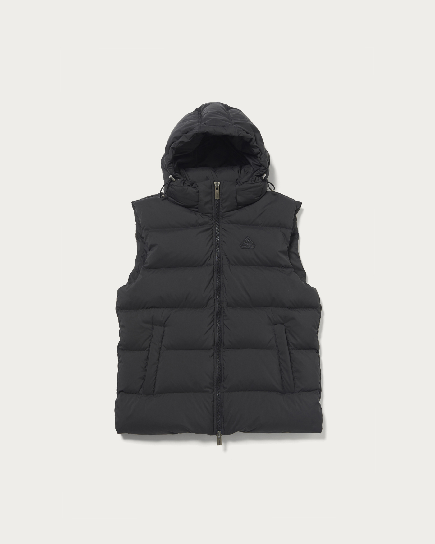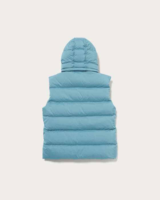 The iconic model "SPOUTNIC VEST" represents 〈PYRENEX〉. It features a simple design with quilt stitching throughout, offering both practicality and versatility in a hip-length down vest. For the United Arrows exclusive edition, an exceptionally soft material with a peach skin-like texture and reduced gloss is used. The brand logo is in the same color, creating a clean and elegant impression.