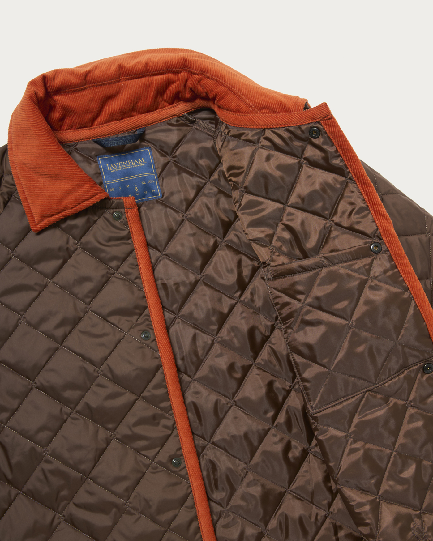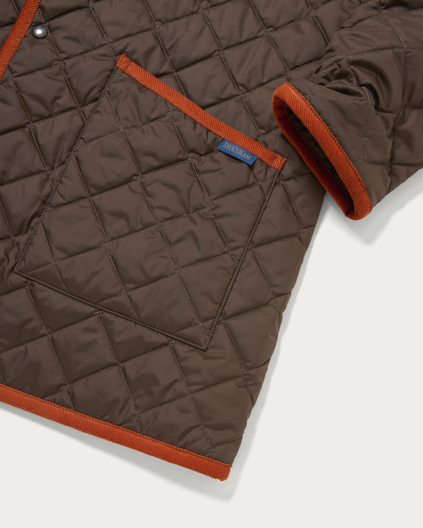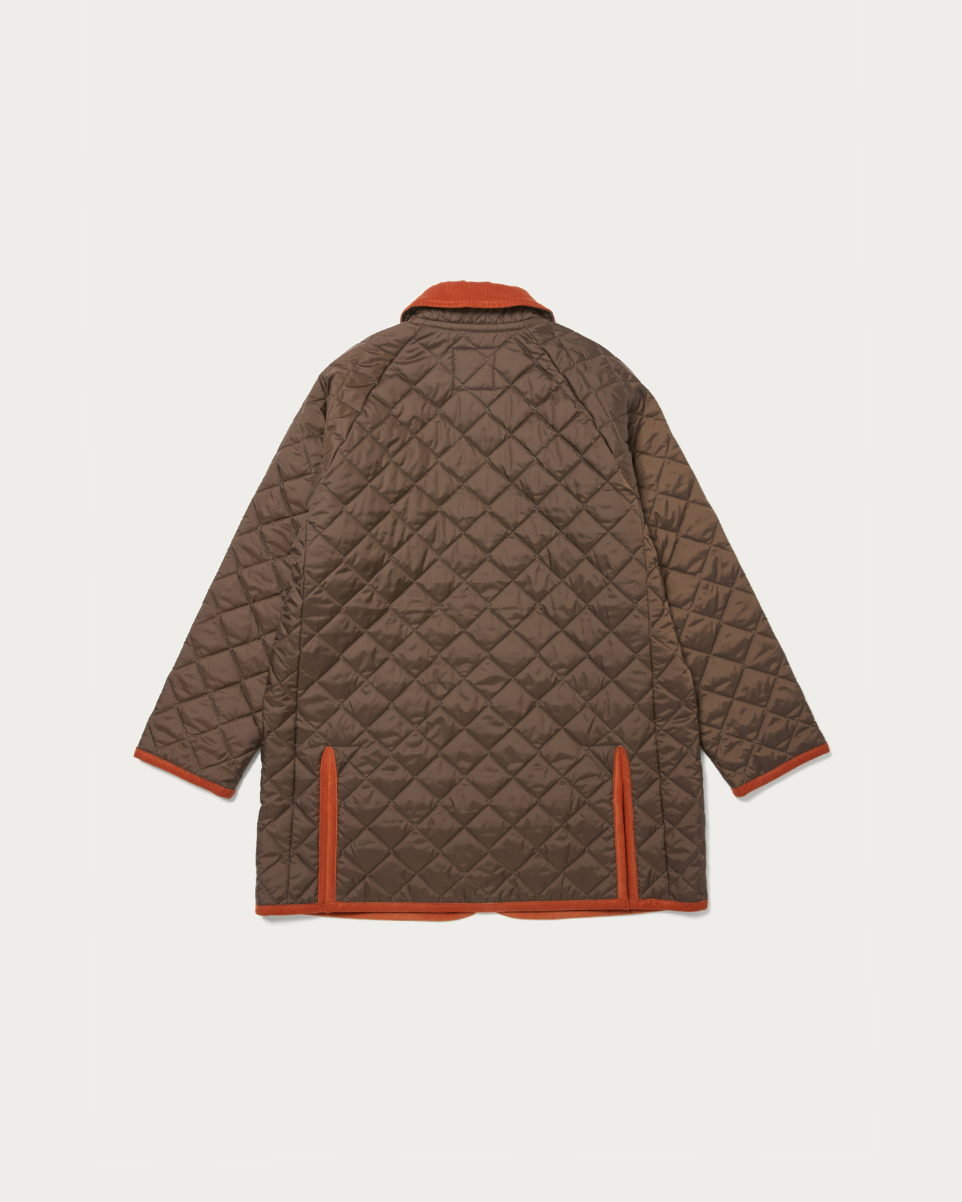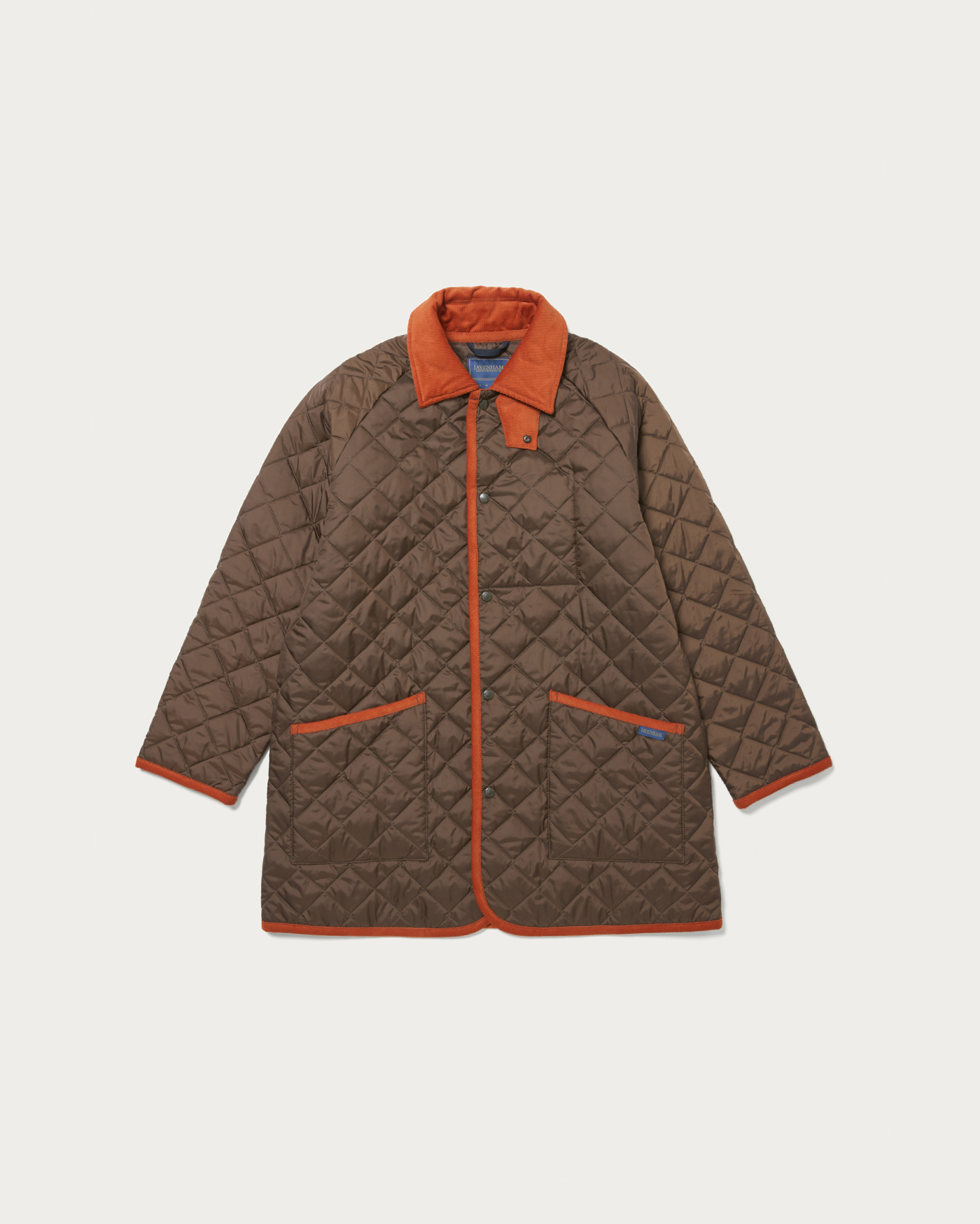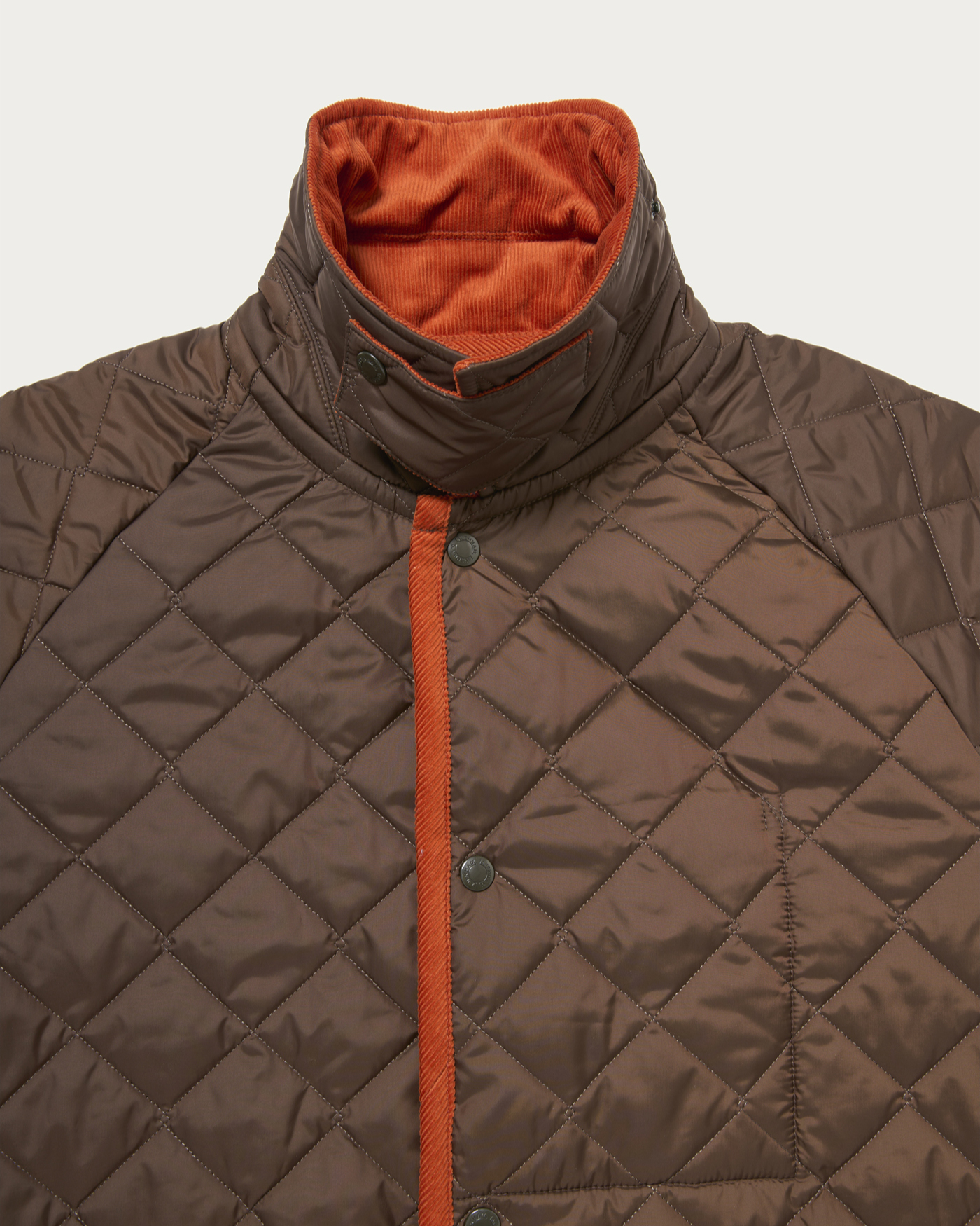 This exclusive model is modified from a horse riding coat to a car coat length. The size and angle of the collar have been newly designed for a well-balanced update. It features a sporty impression with raglan sleeves and a fresh waist-length silhouette. The brown and orange color scheme evokes a nostalgic yet fresh French traditional vibe.