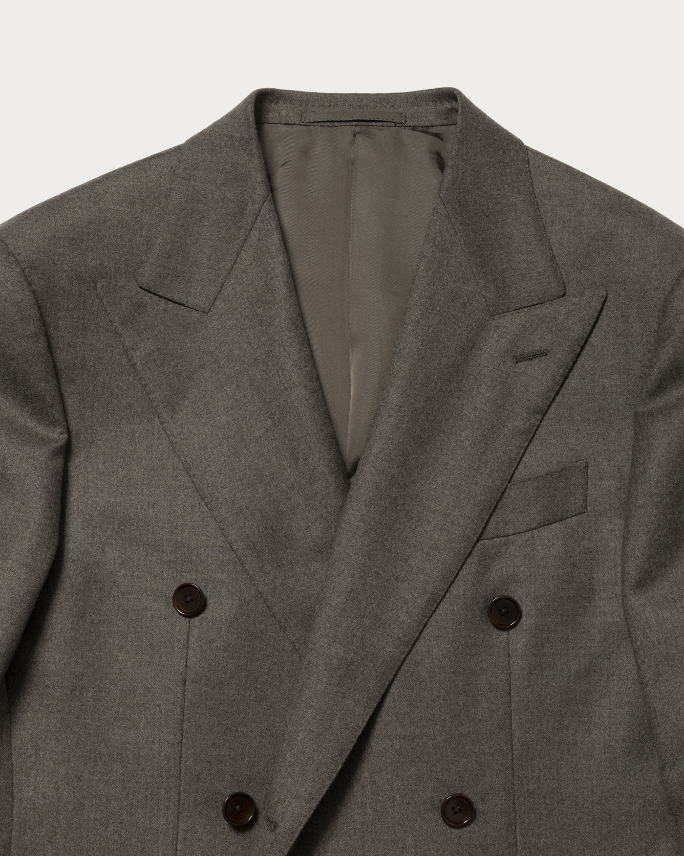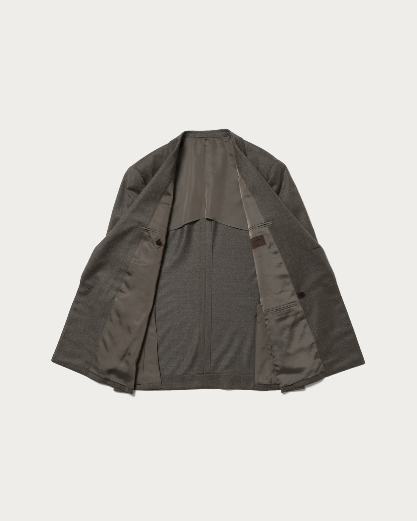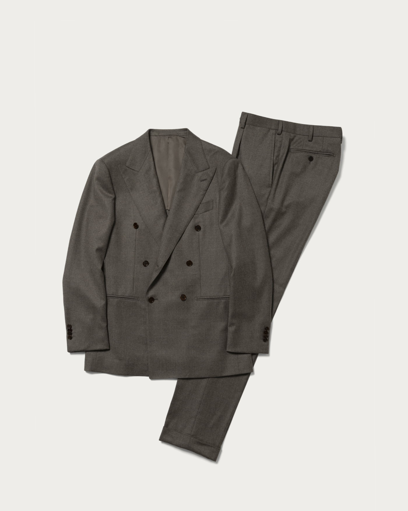 A suit that reinterprets classic style for the modern era. This piece is notable for its soft, gentle colors and airy texture. The double-breasted jacket features six buttons with a wide shoulder width, longer length, and beautiful waist shaping, along with three-dimensional sleeve attachment (Manica Camicia style). It combines a classic structured feel with lightness and softness.The bottoms are designed with a deep rise and a relaxed straight line, ensuring a balanced look with the jacket. The material used is light flannel from "Vitale Barberis Canonico," offering a tailored appearance with volume and firmness, along with a gentle touch on the skin.