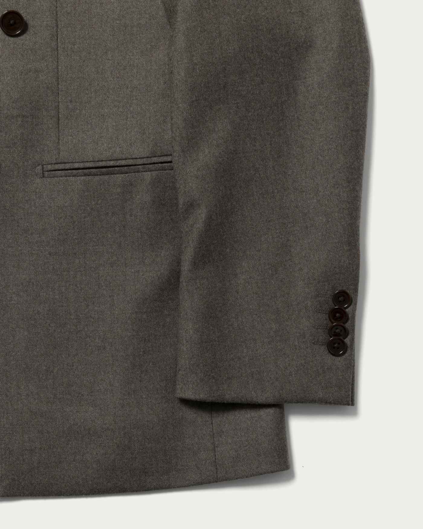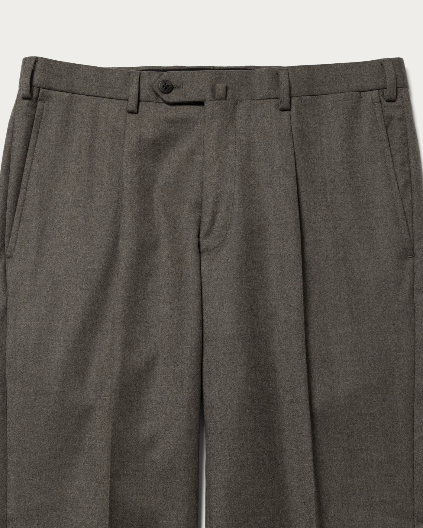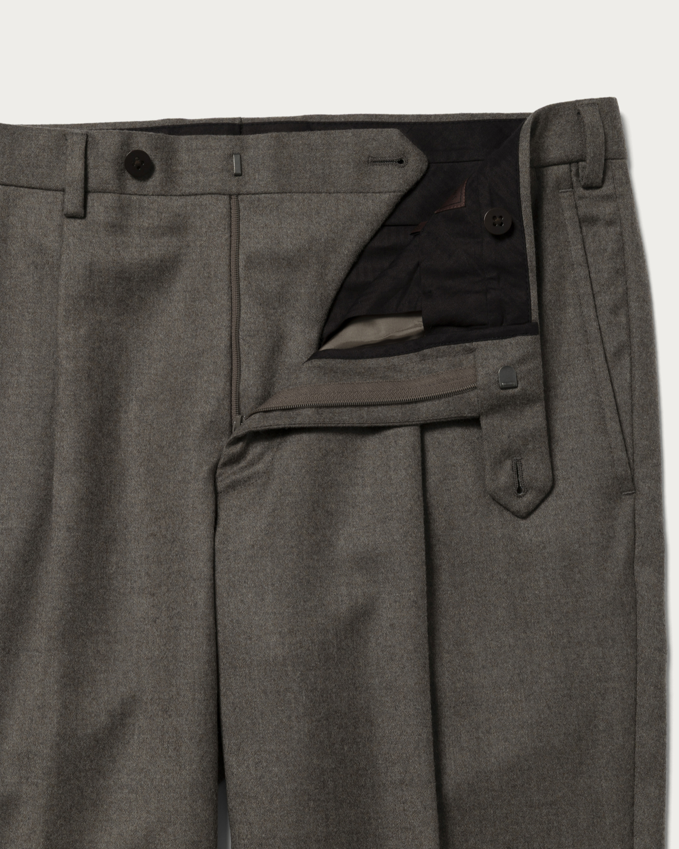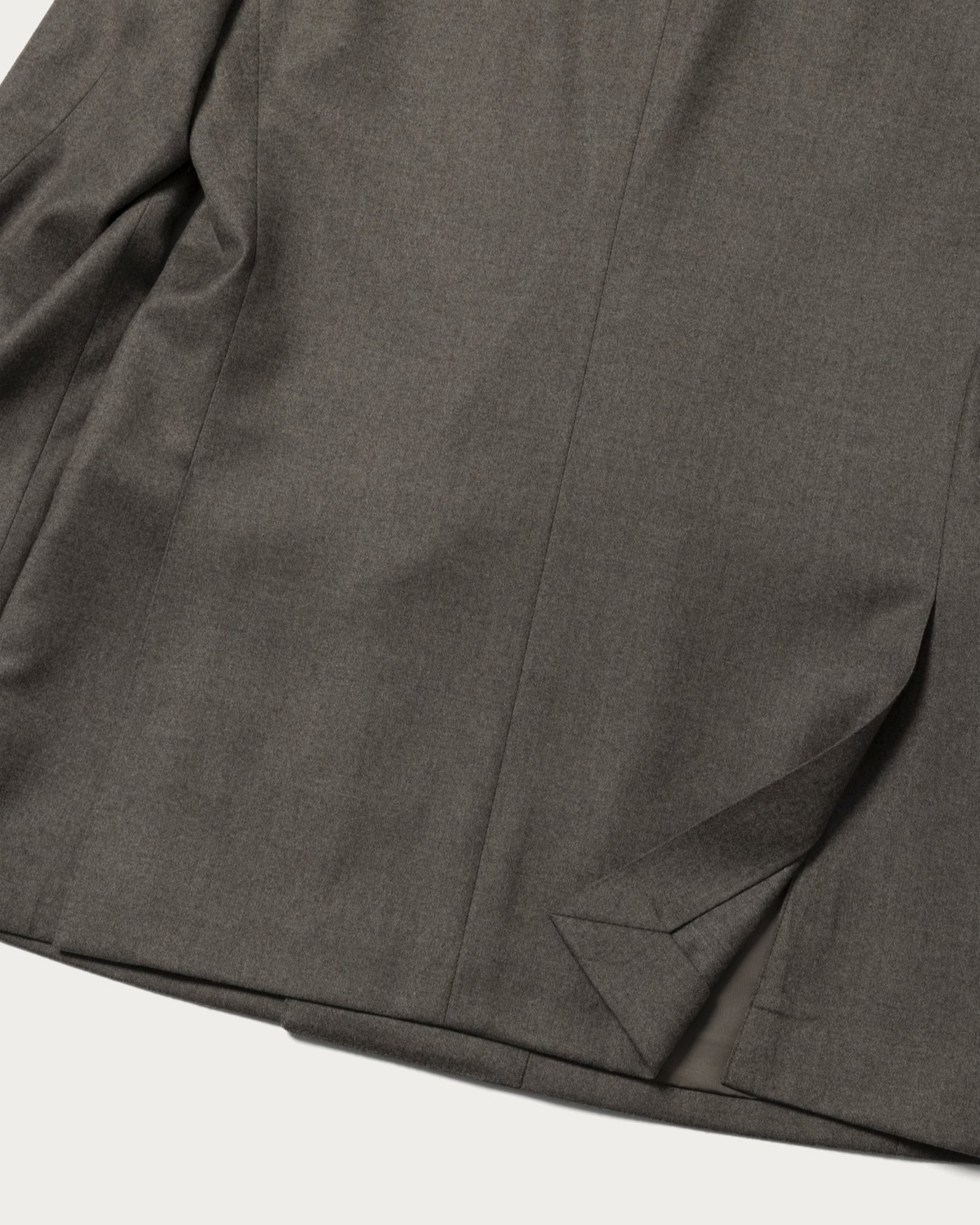 A suit that reinterprets classic style for the modern era. This piece is notable for its soft, gentle colors and airy texture. The double-breasted jacket features six buttons with a wide shoulder width, longer length, and beautiful waist shaping, along with three-dimensional sleeve attachment (Manica Camicia style). It combines a classic structured feel with lightness and softness.The bottoms are designed with a deep rise and a relaxed straight line, ensuring a balanced look with the jacket. The material used is light flannel from "Vitale Barberis Canonico," offering a tailored appearance with volume and firmness, along with a gentle touch on the skin.