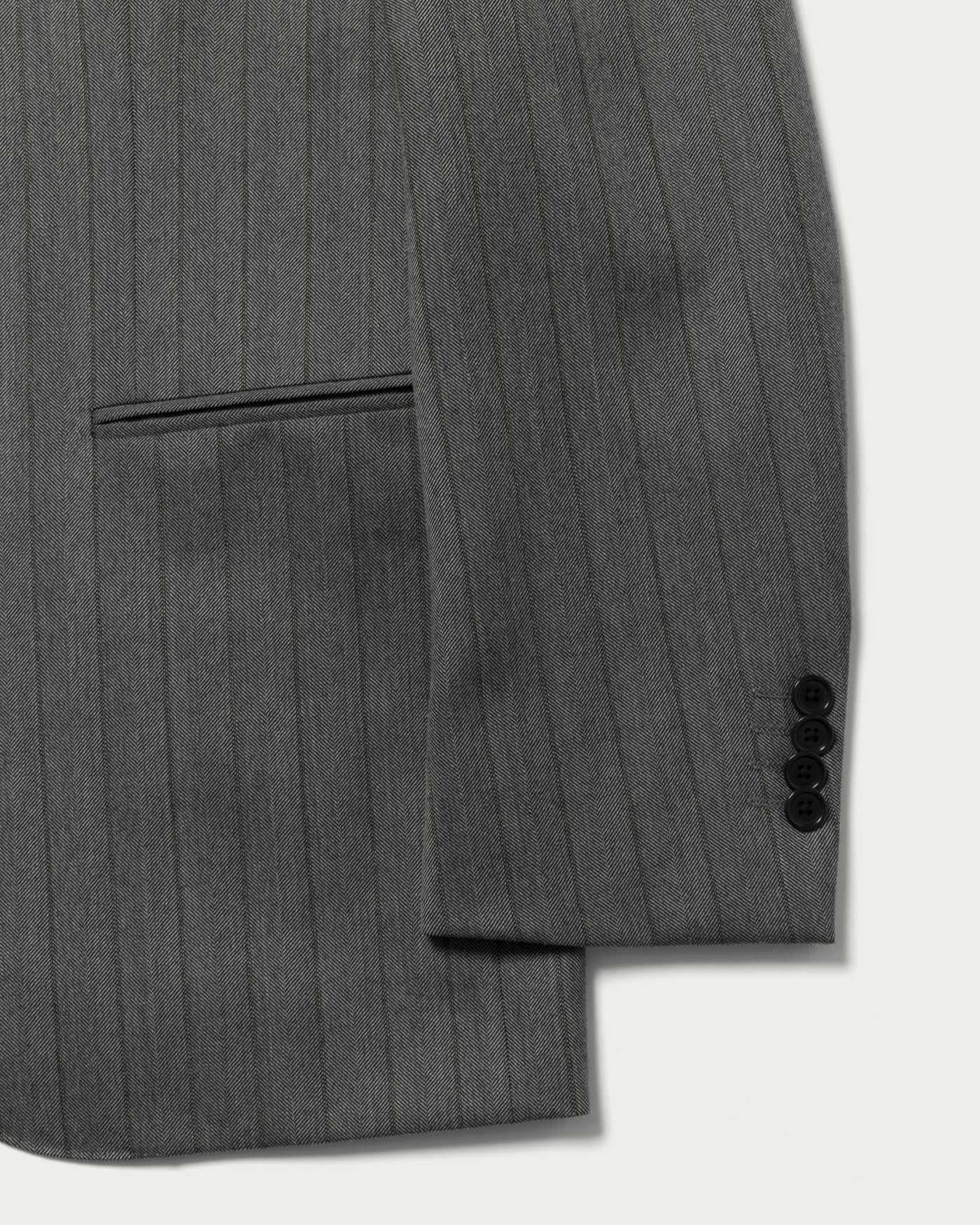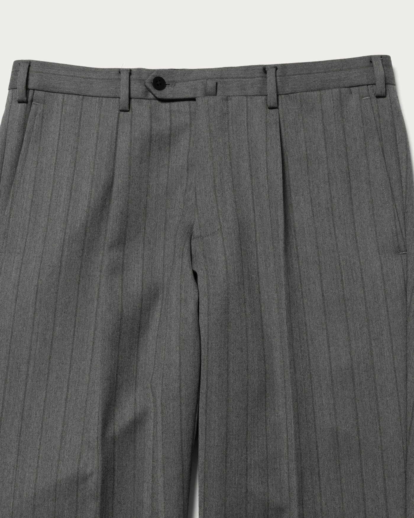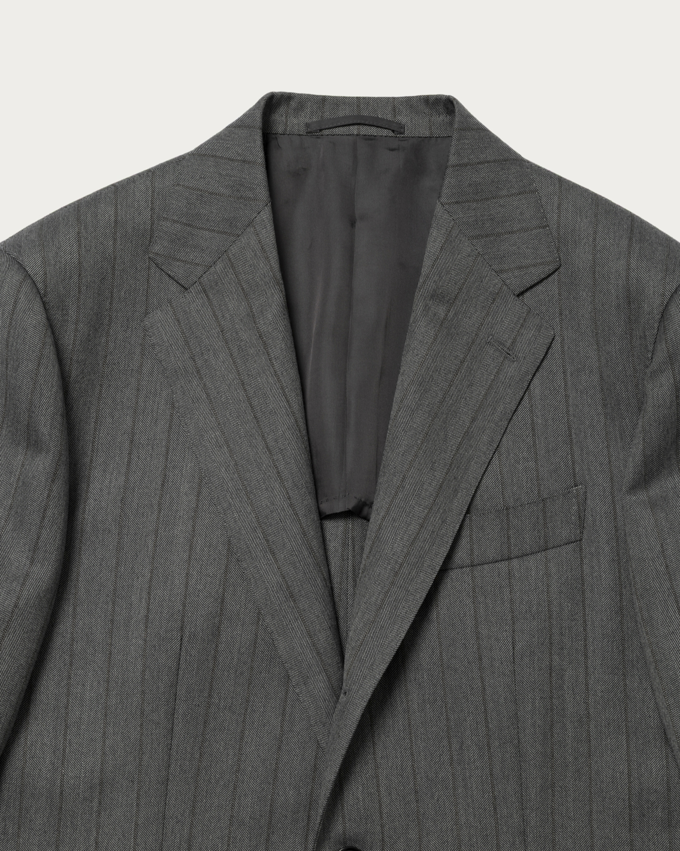 A suit that reinterprets classic style with a modern twist. The deep herringbone stripes give it a dignified yet soft impression. The jacket features broad shoulders, a longer length, a beautifully shaped waist, and three-dimensional sleeves (Manica Camicia style), achieving a structured yet lightweight feel. The bottoms are designed with a higher rise and a relaxed straight line, ensuring a balanced look with the jacket. The fabric used is herringbone material from "Vitale Barberis Canonico," offering both a crisp appearance and supple texture.
