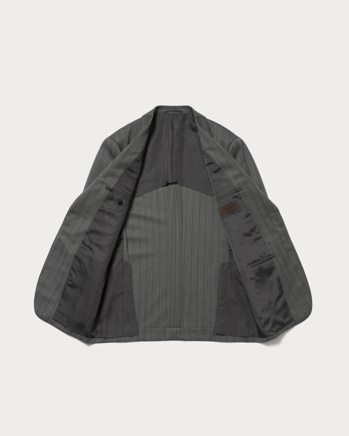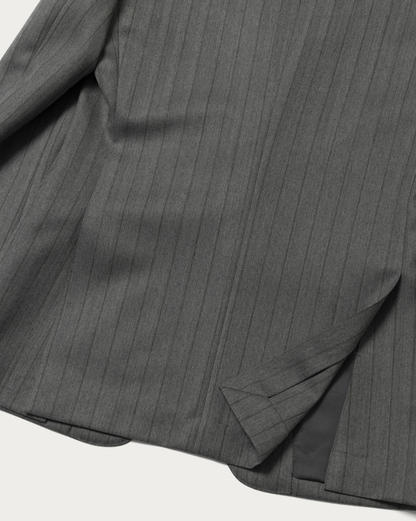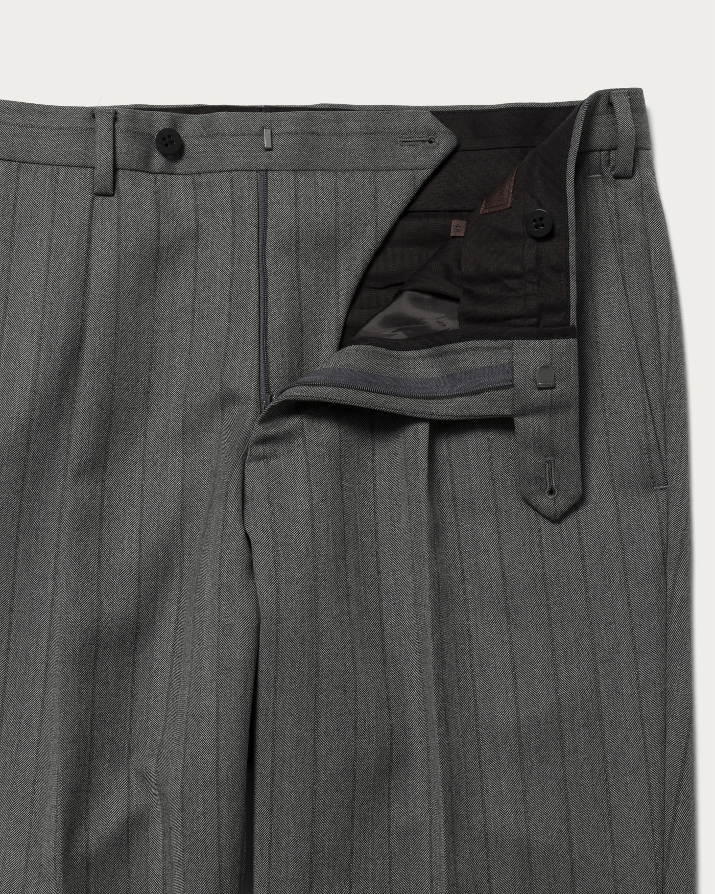A suit that reinterprets classic style with a modern twist. The deep herringbone stripes give it a dignified yet soft impression. The jacket features broad shoulders, a longer length, a beautifully shaped waist, and three-dimensional sleeves (Manica Camicia style), achieving a structured yet lightweight feel. The bottoms are designed with a higher rise and a relaxed straight line, ensuring a balanced look with the jacket. The fabric used is herringbone material from "Vitale Barberis Canonico," offering both a crisp appearance and supple texture.