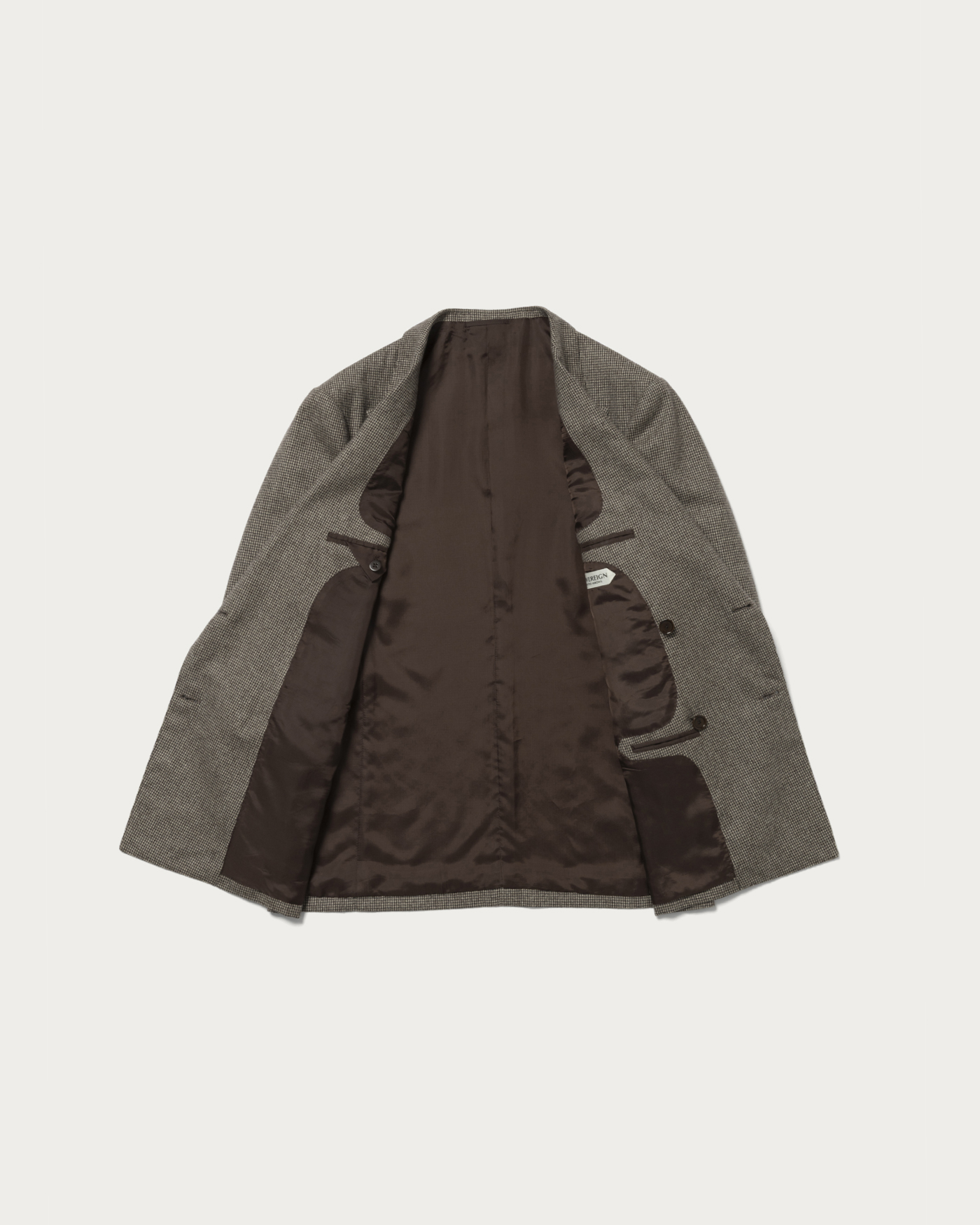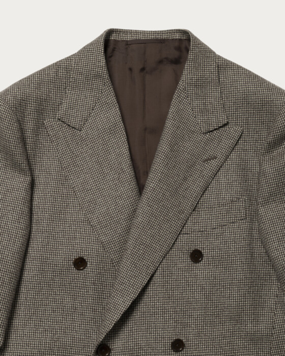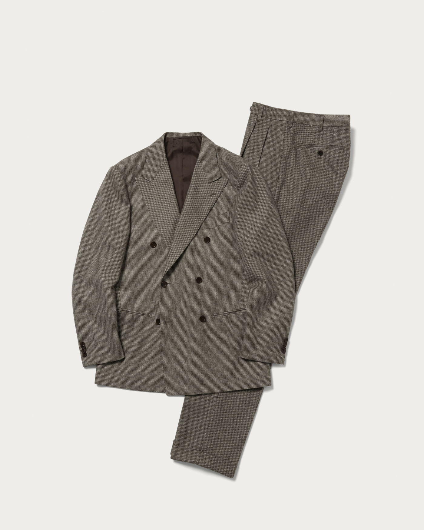 A D6B model that takes advantage of the HAND LINE's features, offering a soft tailoring with a touch of allure. The back style is designed with no vents, and the pants feature two pleats. The material used is a mixed houndstooth from Savile Clifford. This piece combines a country-style soft flannel fabric with both a sporty impression and elegance.