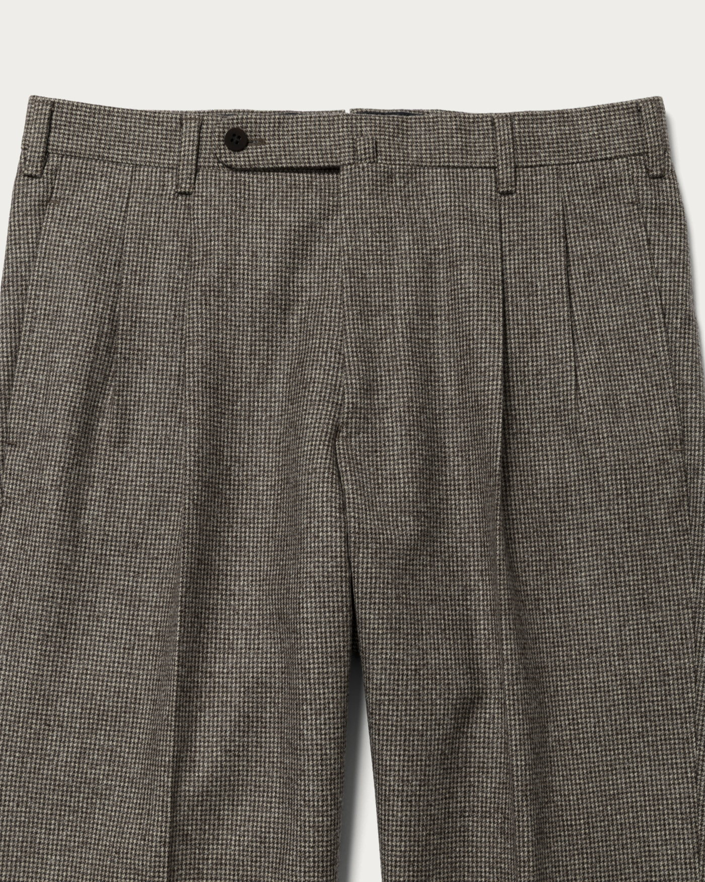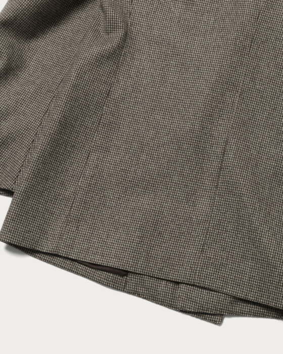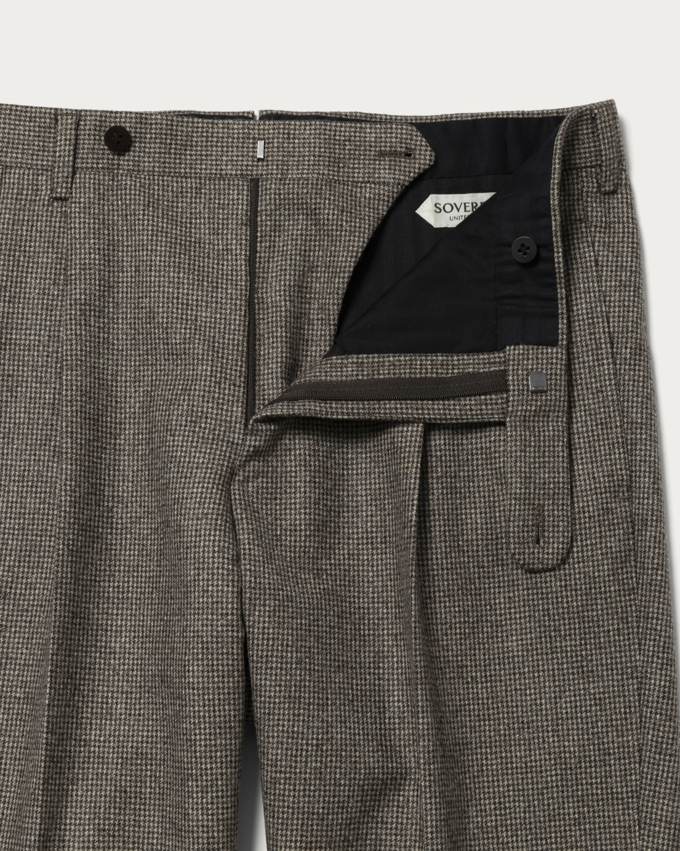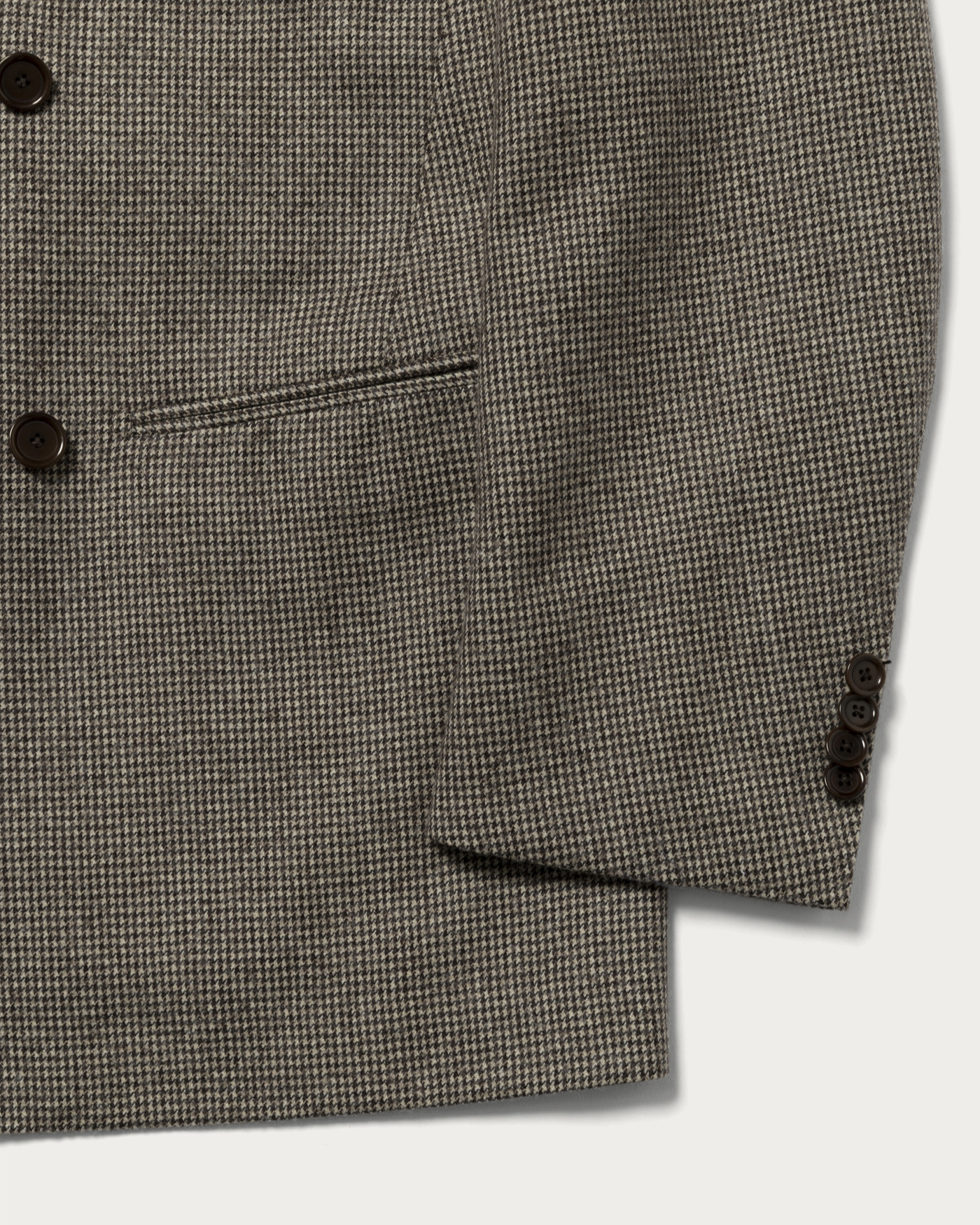 A D6B model that takes advantage of the HAND LINE's features, offering a soft tailoring with a touch of allure. The back style is designed with no vents, and the pants feature two pleats. The material used is a mixed houndstooth from Savile Clifford. This piece combines a country-style soft flannel fabric with both a sporty impression and elegance.