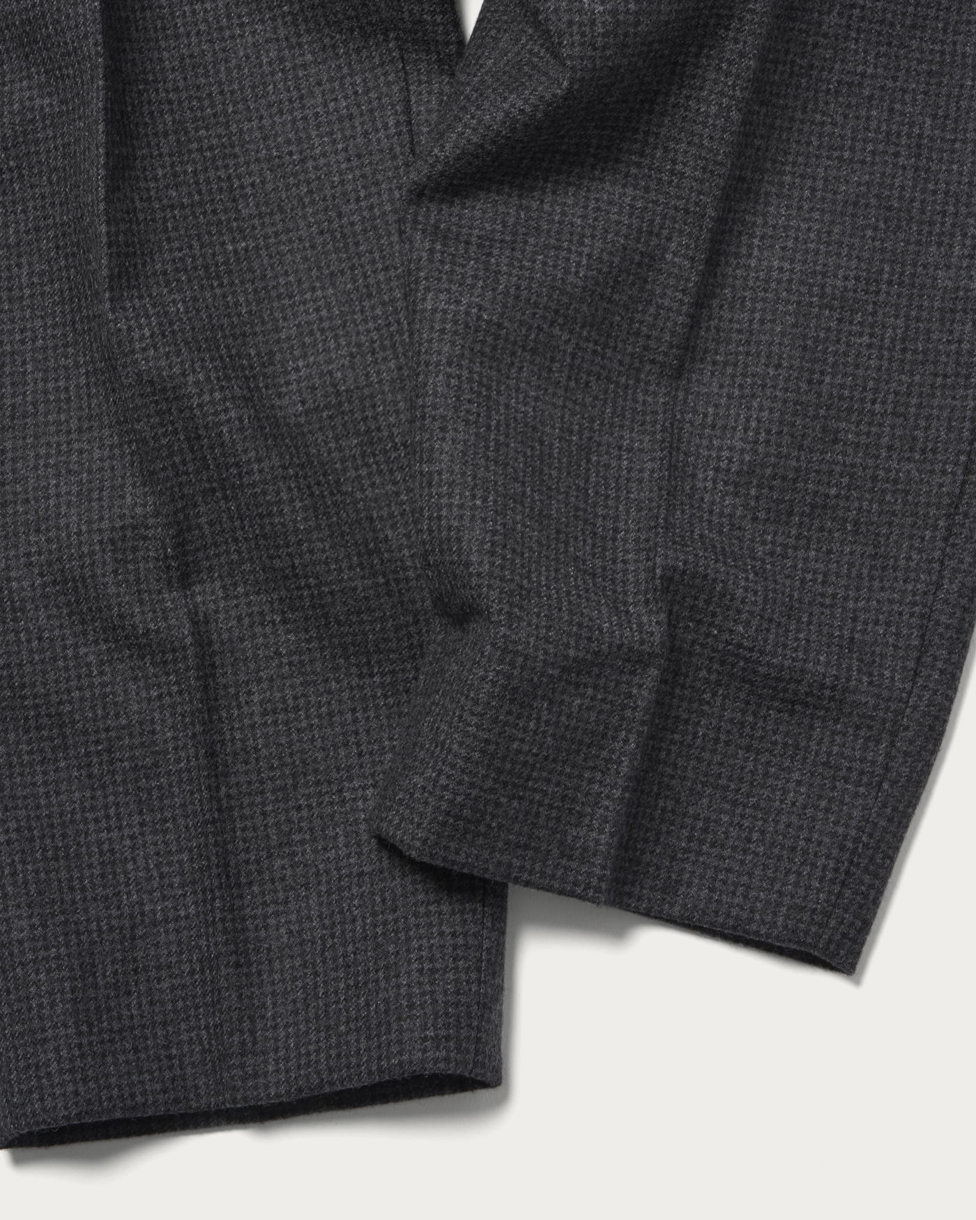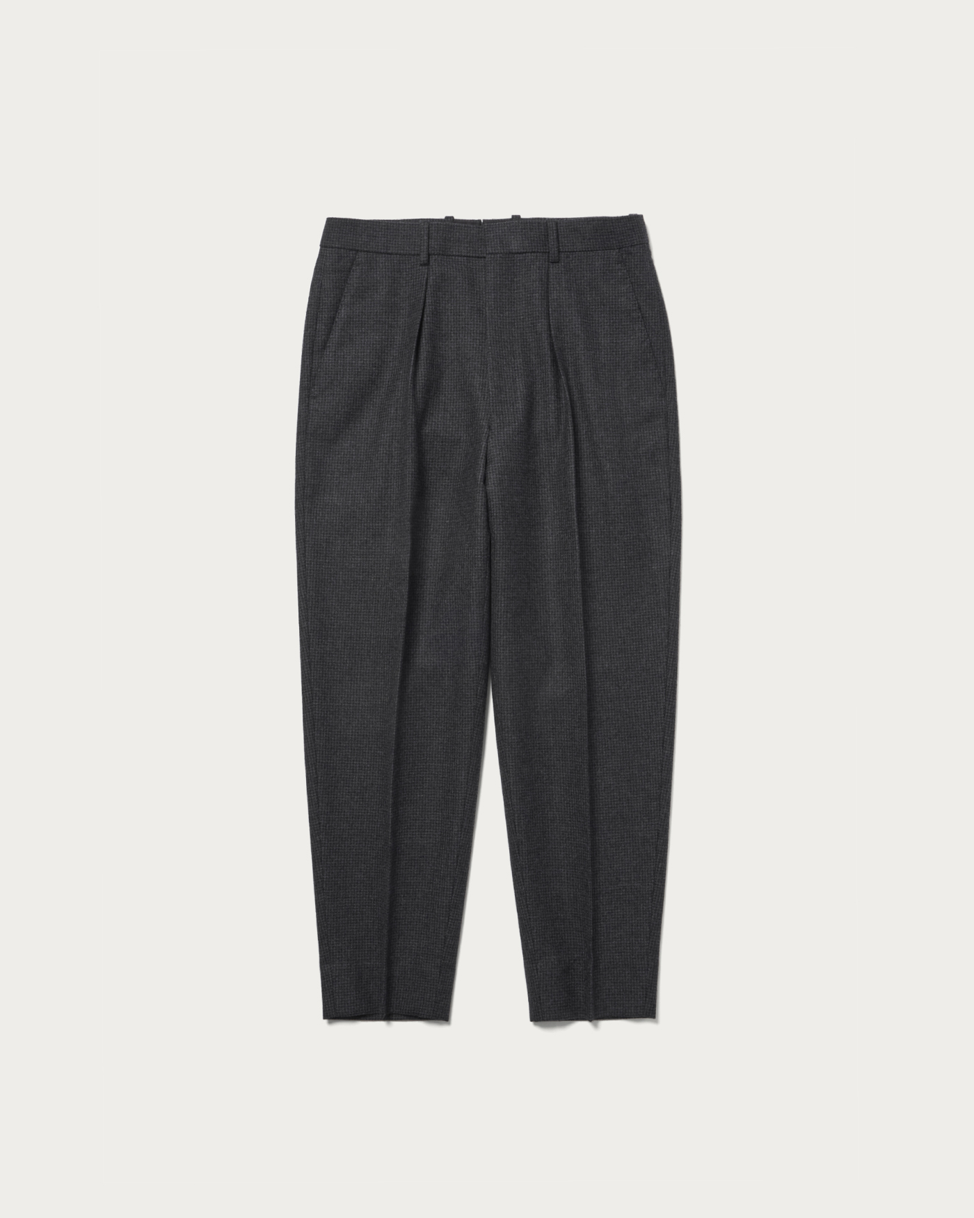 Here is the English translation of the provided Japanese text:"A pair of wide tapered silhouette pants crafted based on military pants. The gentle tapering from the pleated waist to the hem creates an exquisite balance that is truly captivating. The material used is worsted flannel from Scotland's 〈LOVAT〉 company. It is selected from the 'Redpath Flannel' collection, which modernizes the company's archival materials."