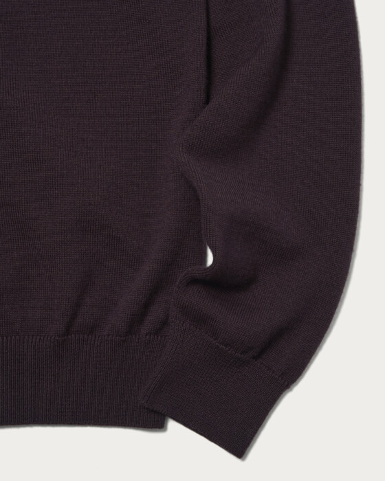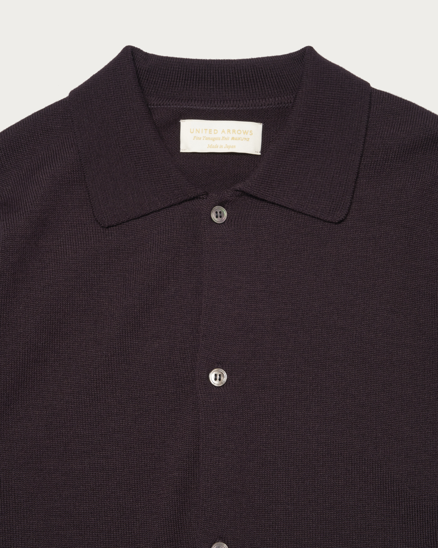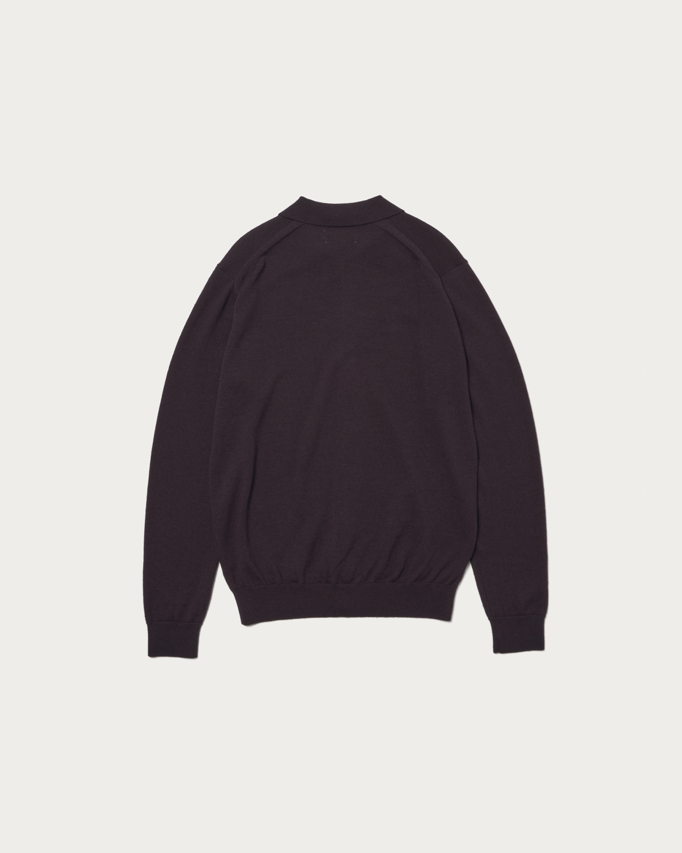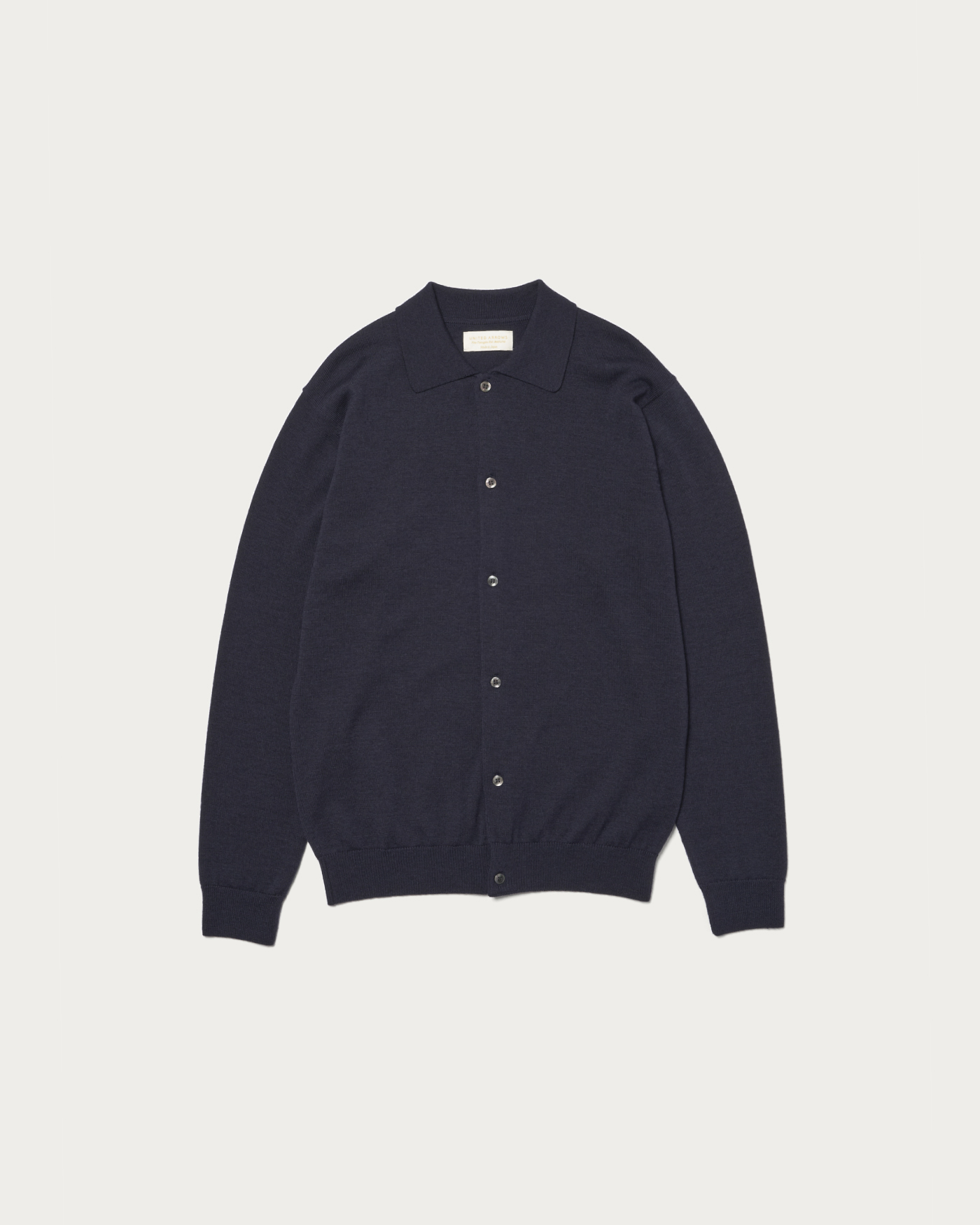 This cardigan with a polo collar, born from a collaboration with "Okuyama Meriyasu," exudes an elegant impression with its meticulously crafted collar angle and refined construction. It features a front-open design that is not too thick, making it an easy-to-wear piece for light layering.The material is a jersey knit made from ultra-fine wool, twisted into three-ply yarn and knitted at 10-gauge. It is characterized by its smooth, supple texture and beautiful surface appearance. To maintain its luxurious feel and sheen, it undergoes a semi-shrink-resistant treatment, preventing deformation and shrinkage while ensuring ease of care.