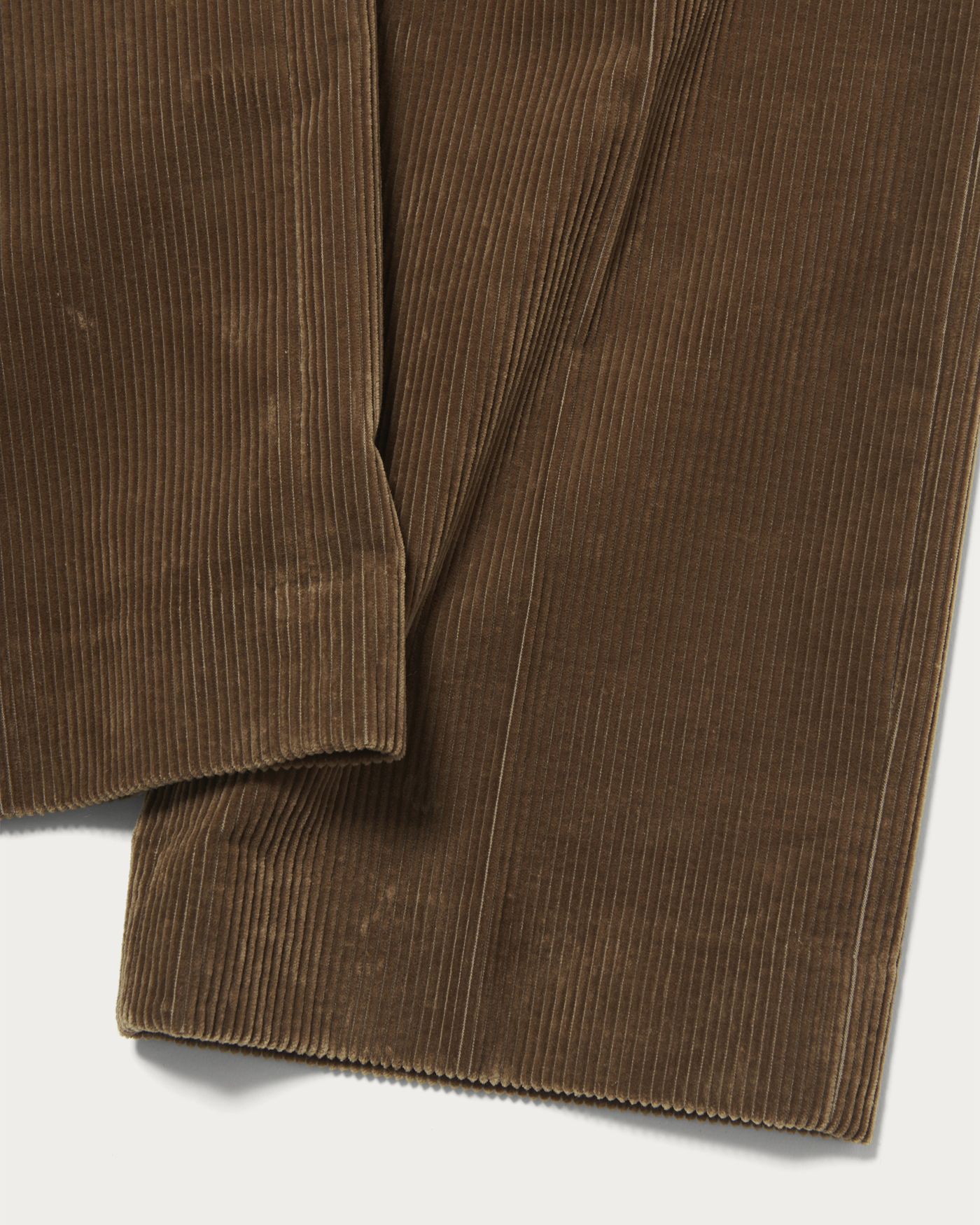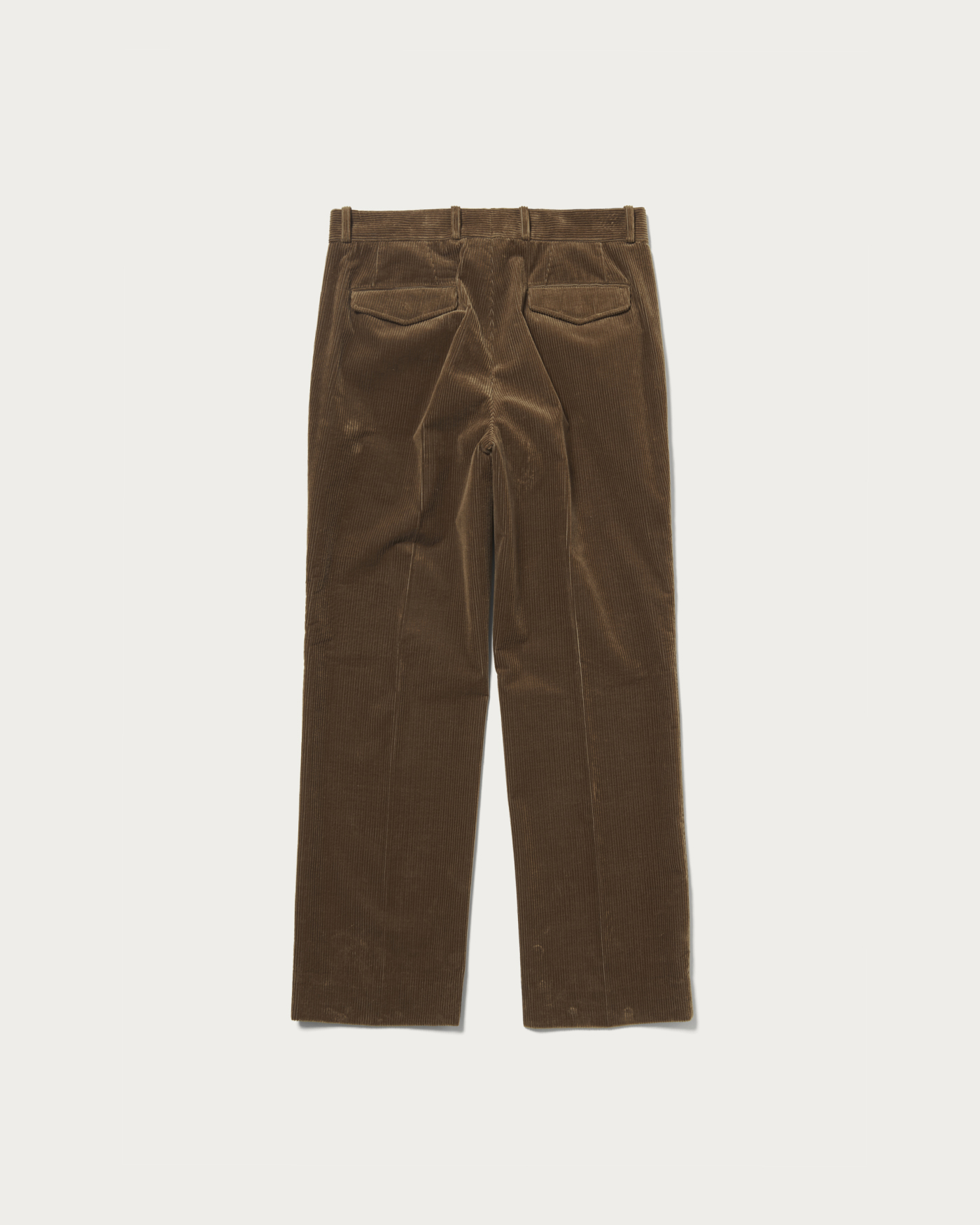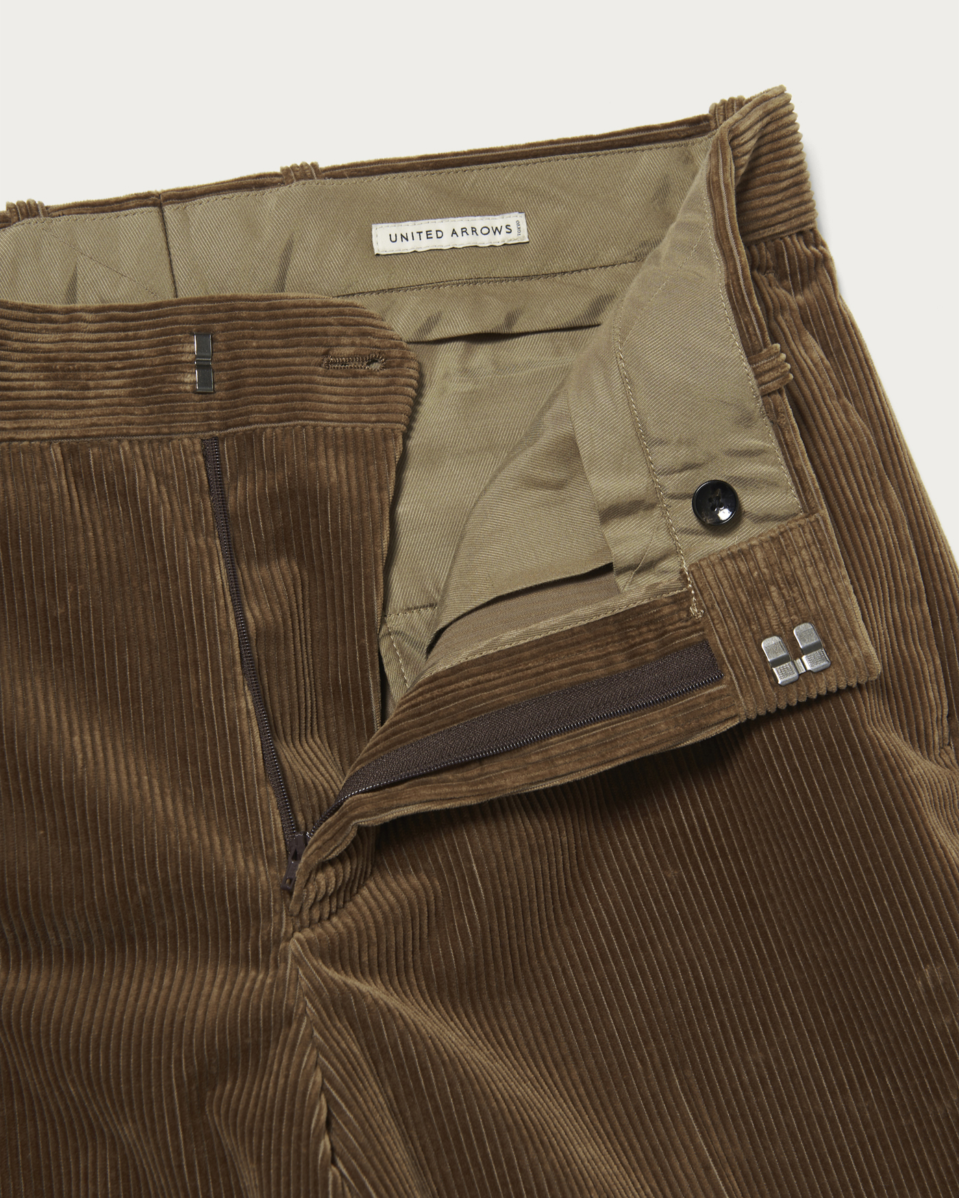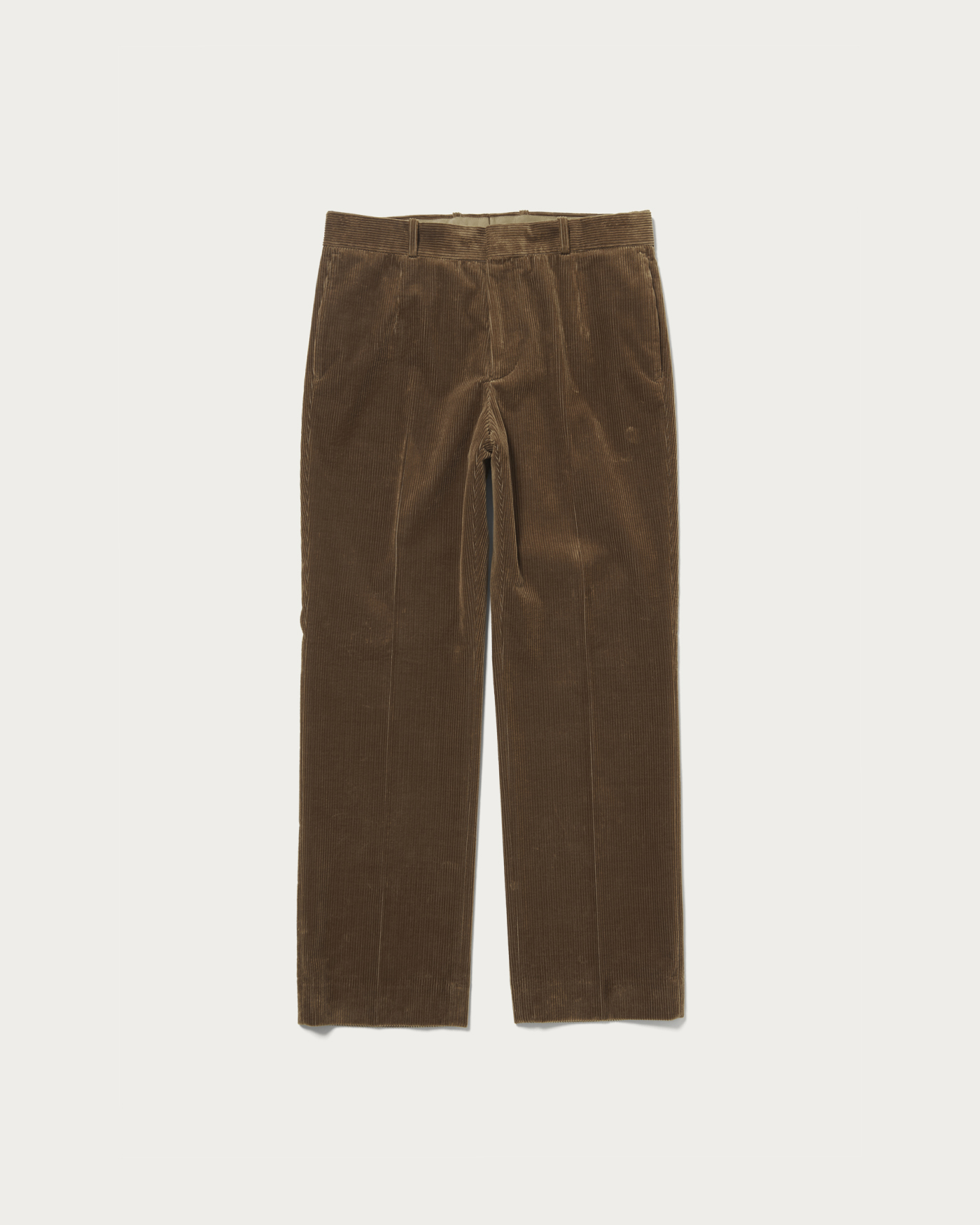 A pair of pants featuring a straight silhouette made from a wool-blend corduroy. Compared to 100% cotton corduroy, it offers an elegant sheen and a smooth touch, giving the overall look a modern finish. The blend of wool creates a lustrous appearance and a moderate warmth. Combined with beautiful color vibrancy and a natural drape, it offers a premium texture that sets it apart from traditional corduroy. This piece enhances your fall and winter style with a sophisticated mood.