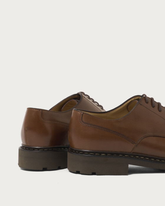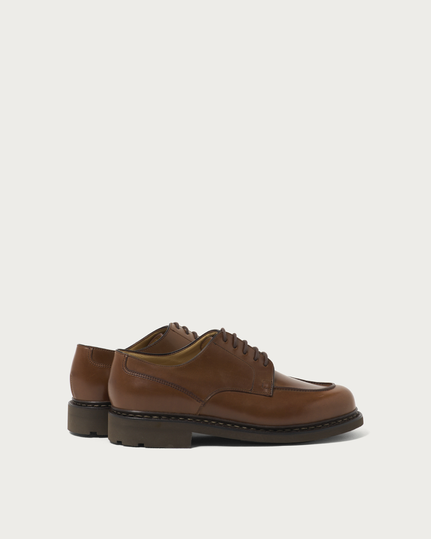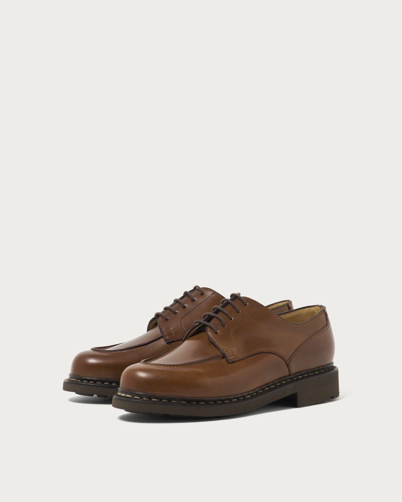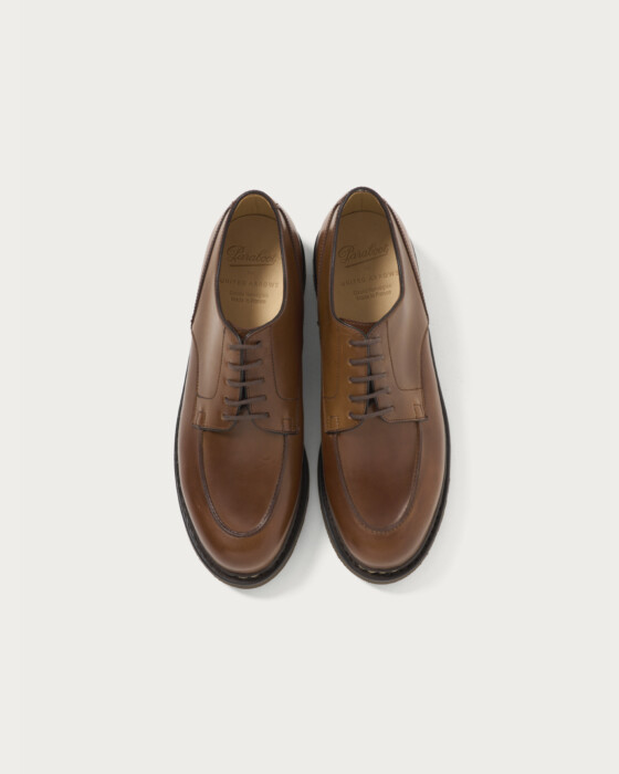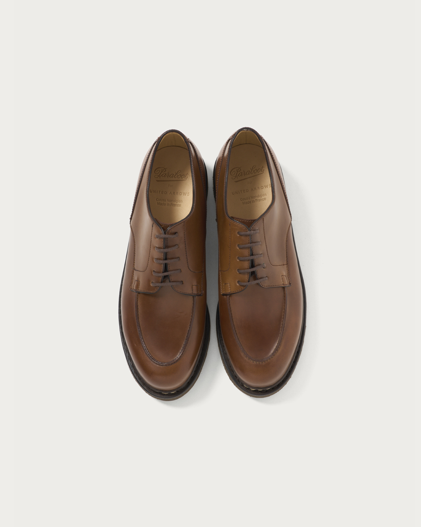 The "CHAMBORD," a representative model of 〈PARABOOT〉, has been specially ordered using Horween's cordovan leather. While it has previously been available in black and burgundy, this is the first time it has been crafted in a natural color. The green brand name tag has been deliberately removed to highlight the beauty of the material, resulting in a minimalist appearance. This special edition pair allows you to enjoy the deep luster and aging unique to cordovan leather.