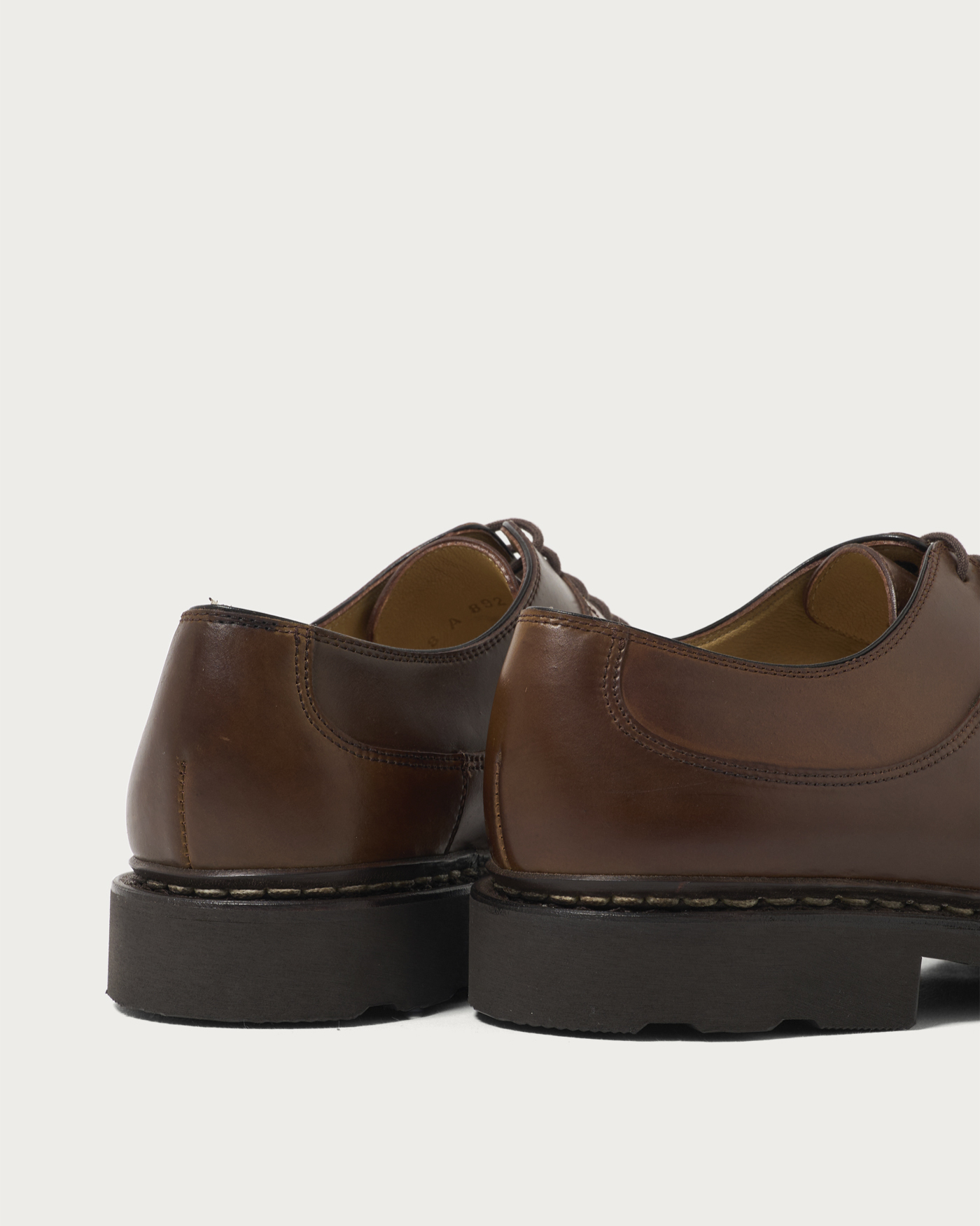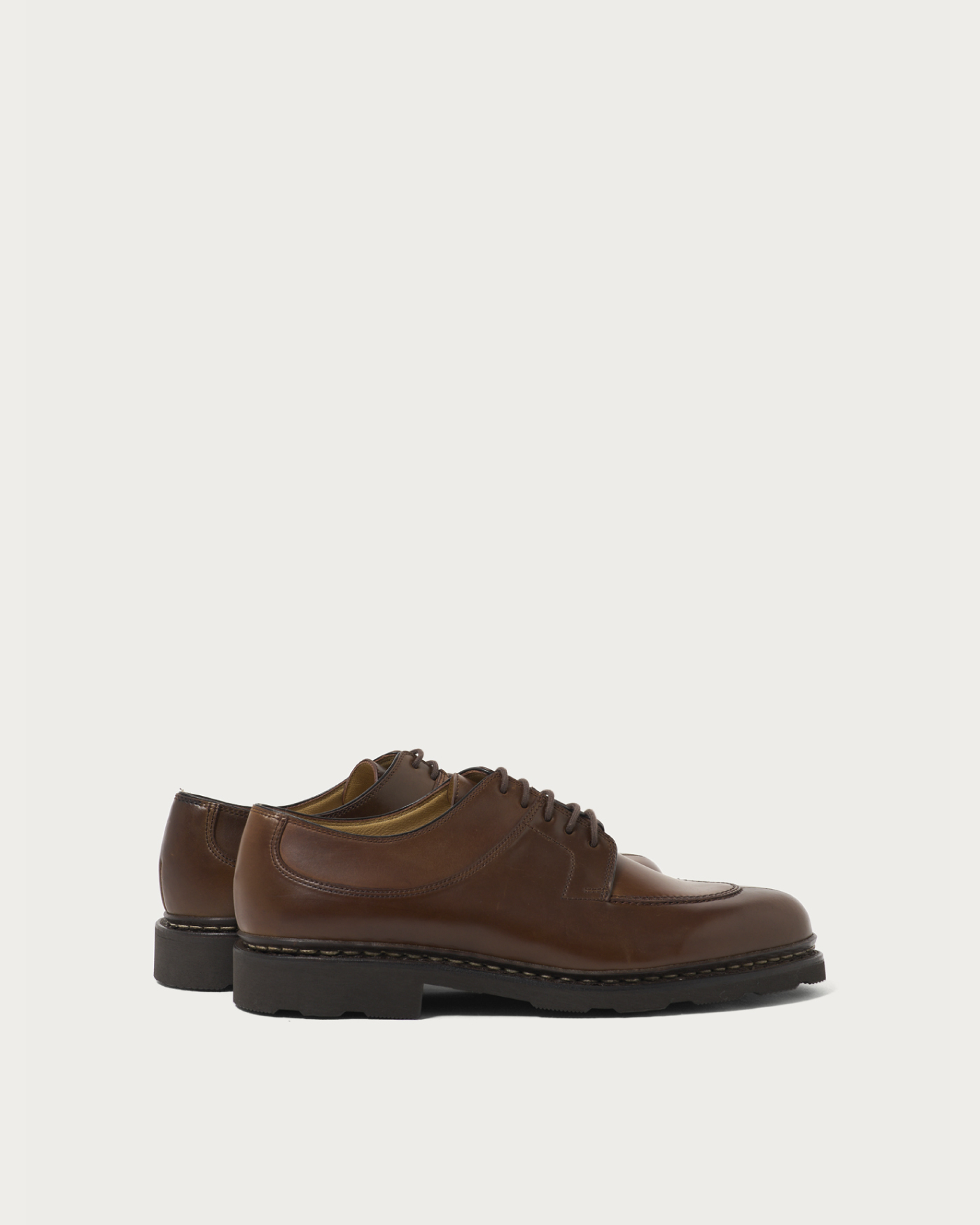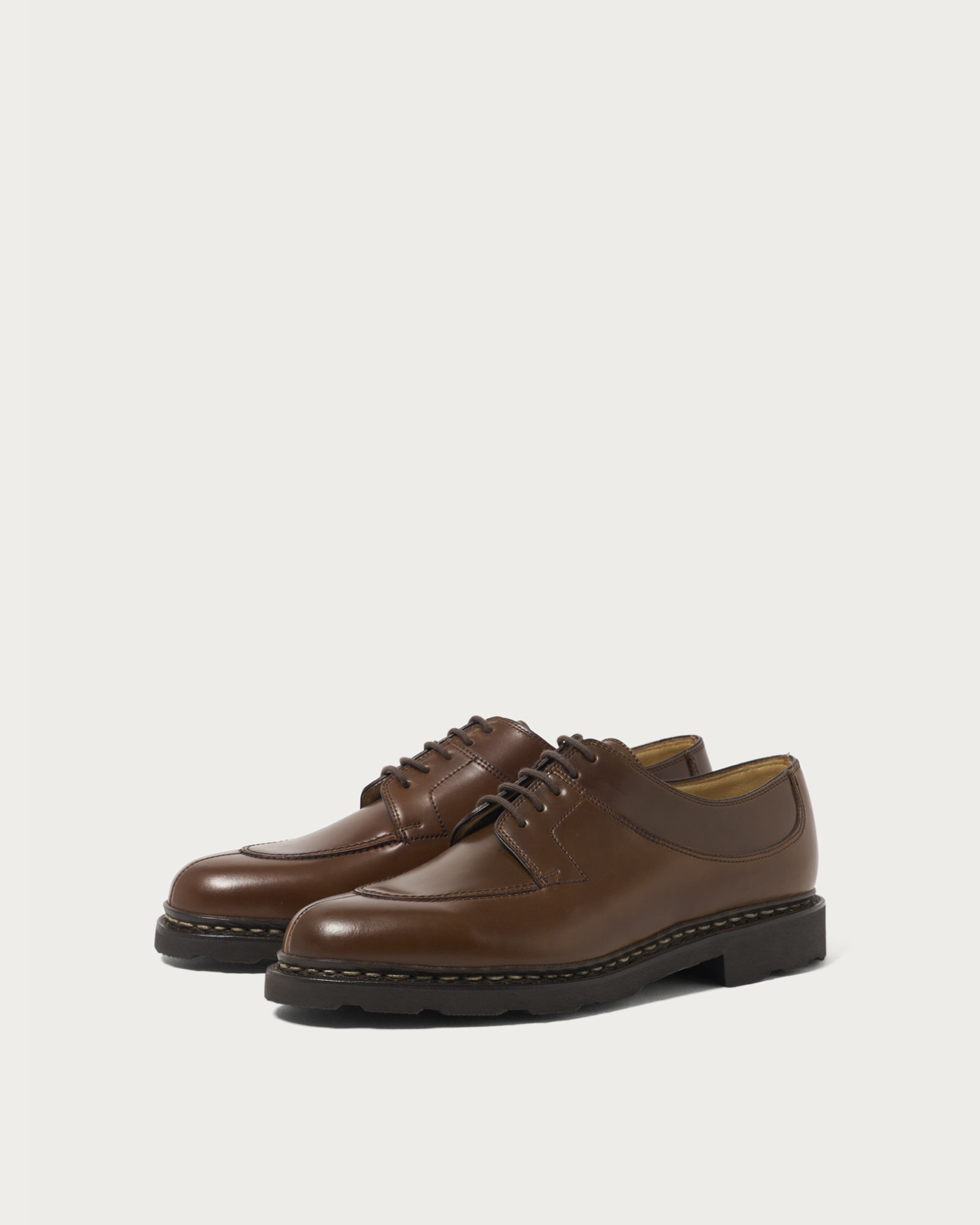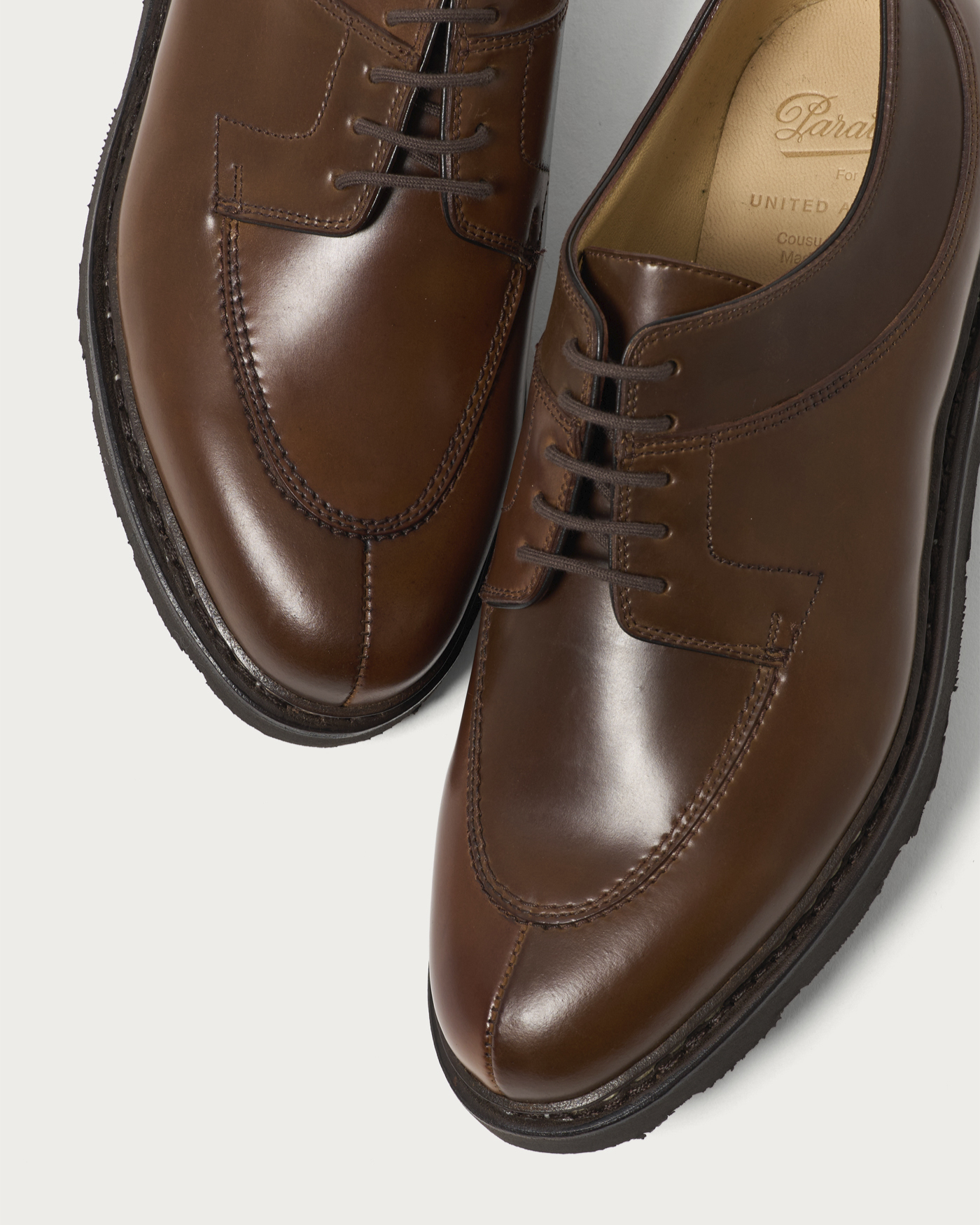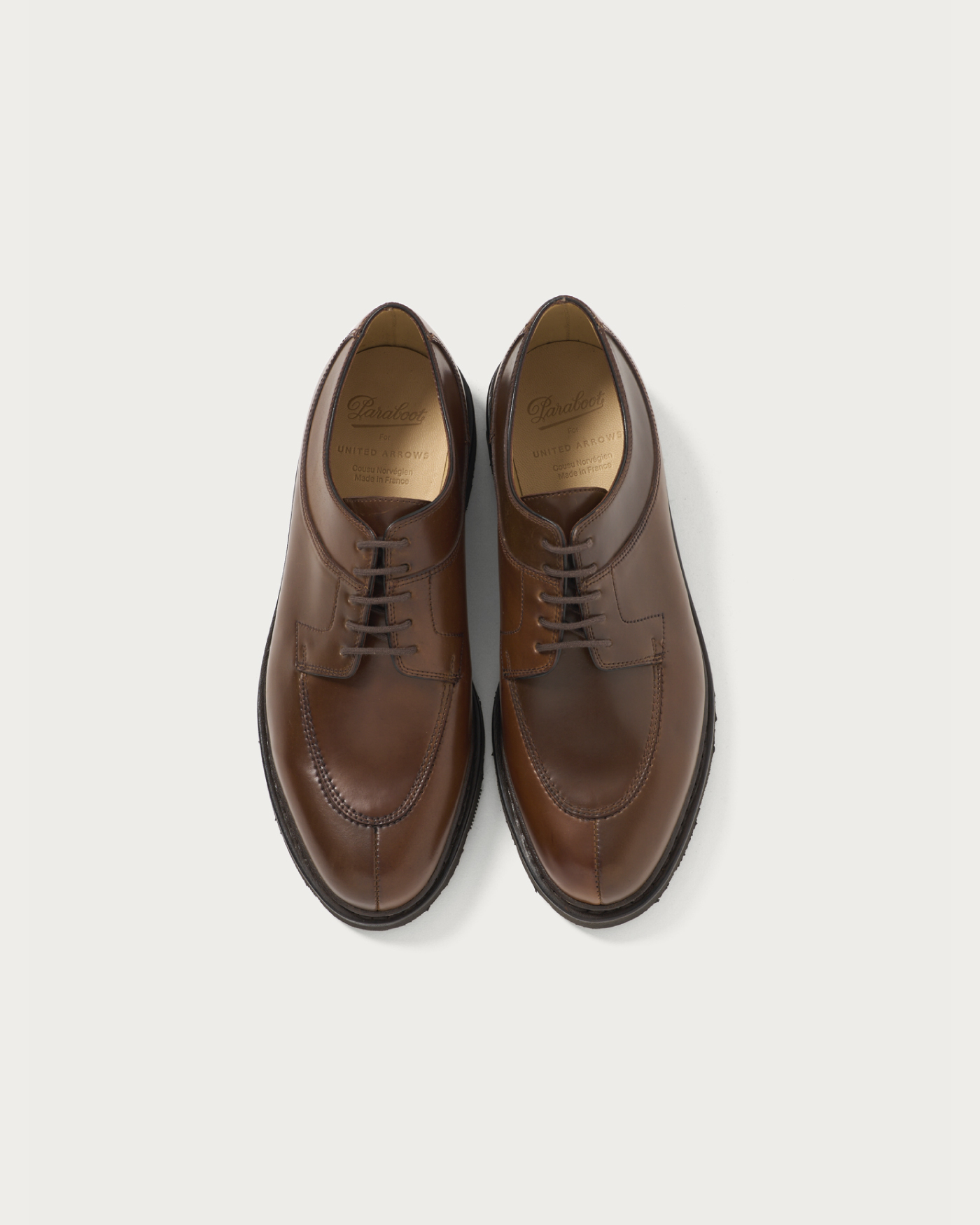 The "AVIGNON," a representative model of 〈PARABOOT〉, has been specially ordered using Horween's cordovan leather. While it has previously been available in black and burgundy, this is the first time it has been crafted in a natural color. The green brand name tag has been deliberately removed to highlight the beauty of the material, resulting in a minimalist appearance. This special edition pair allows you to enjoy the deep luster and aging unique to cordovan leather.